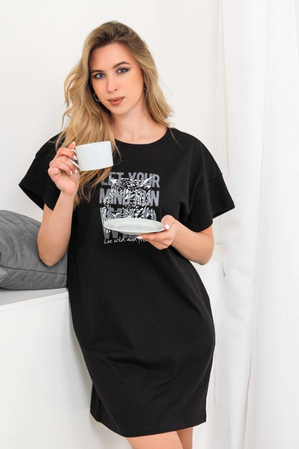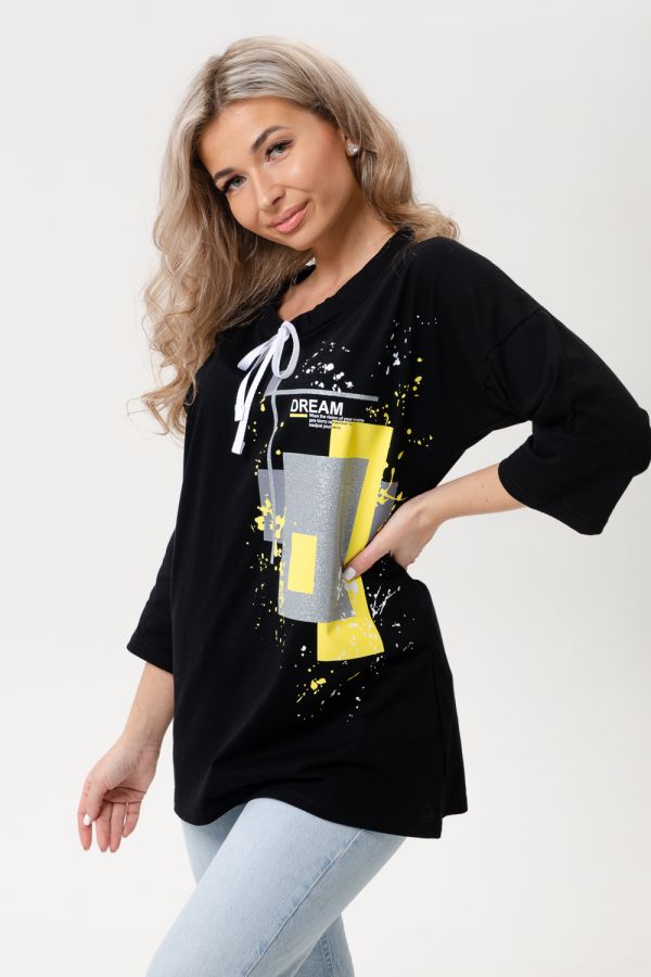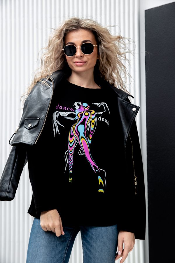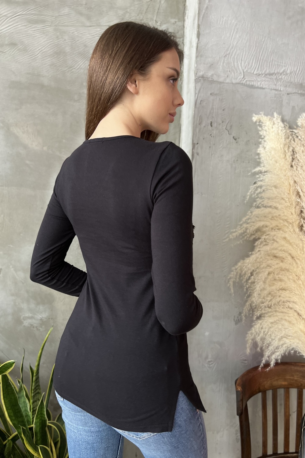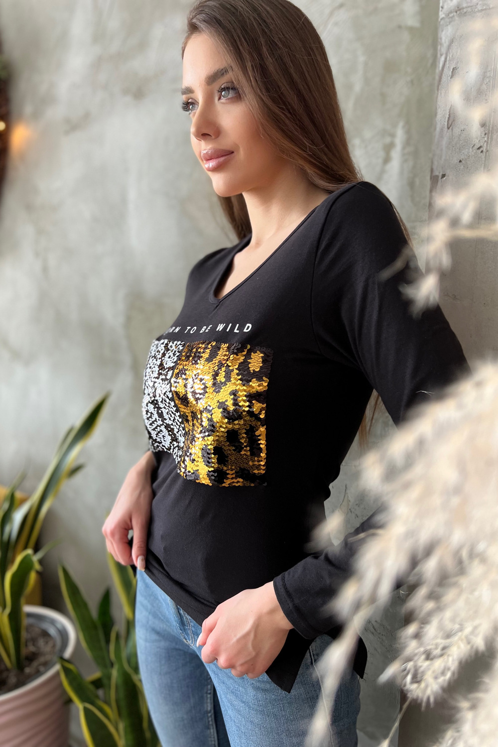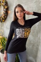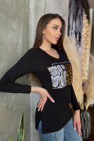 Туника полуприлегающего силуэта, с V-образной горловиной. Рукав втачной, длинный. В нижней части боковых швов обработаны разрезы. Горловина обработана бейкой из основного полотна. На полочке эффектная аппликация из пайеток и печать в виде надписи "born to be wild"