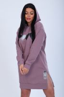 Туника женская из мягкого футера с лайкрой 2-х нитка, качества карде. Модель с капюшоном, спущенная пройма, длинный рукав и низ туники обработаны широким манжетом. На передней полочке стильный принт в виде сердец и в виде шеврона внизу, в боковом шве функциональная декоративная молния. Модное, уютное платье отличный вариант офисного гардероба для современной деловой девушки.