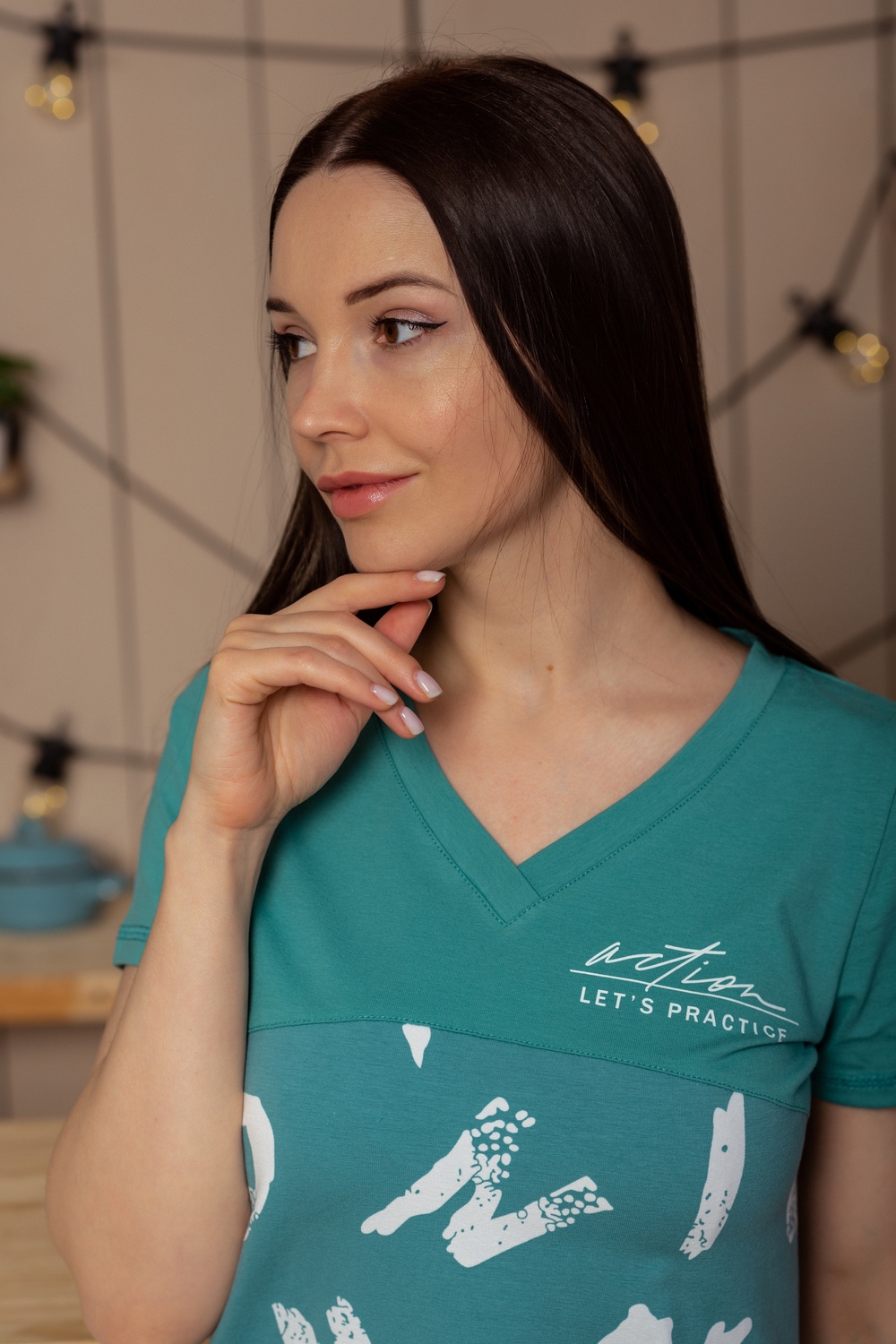 Туника полуприлегающего силуэта, с боковыми карманами, средней длины, с V-образной горловиной. Рукав втачной. На полочке и спинке расположены кокетки из отделочного полотна. В нижней части боковых швов обработаны разрезы. Горловина обработана обтачкой.