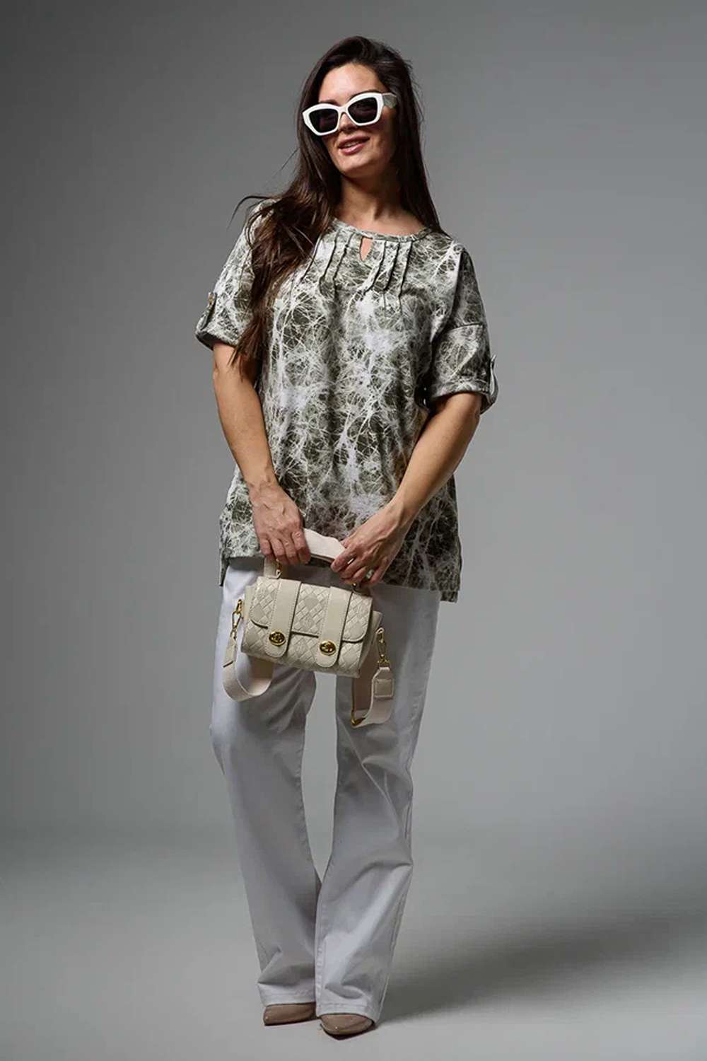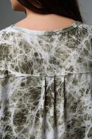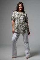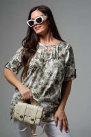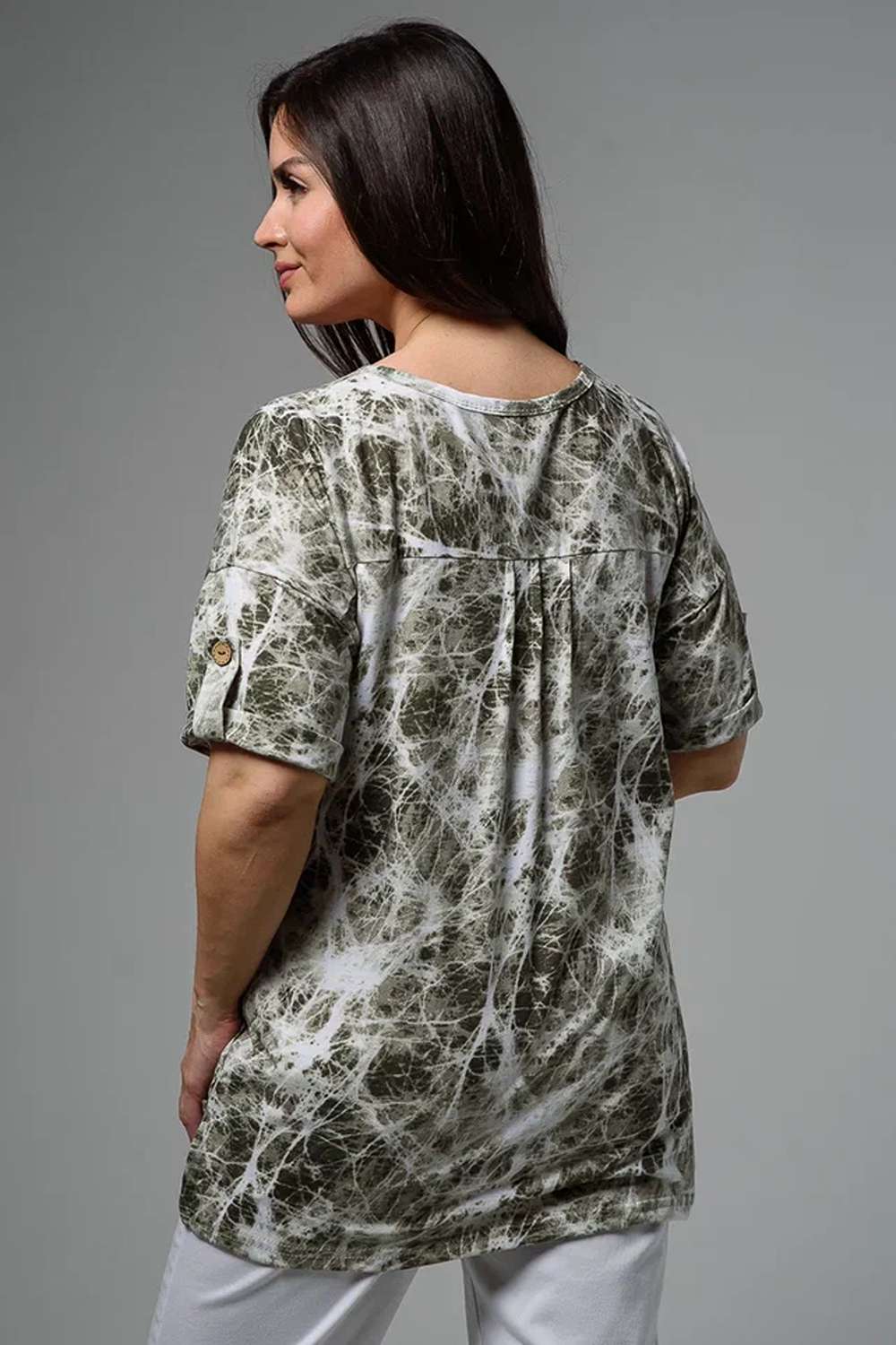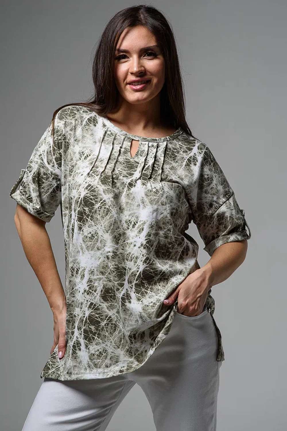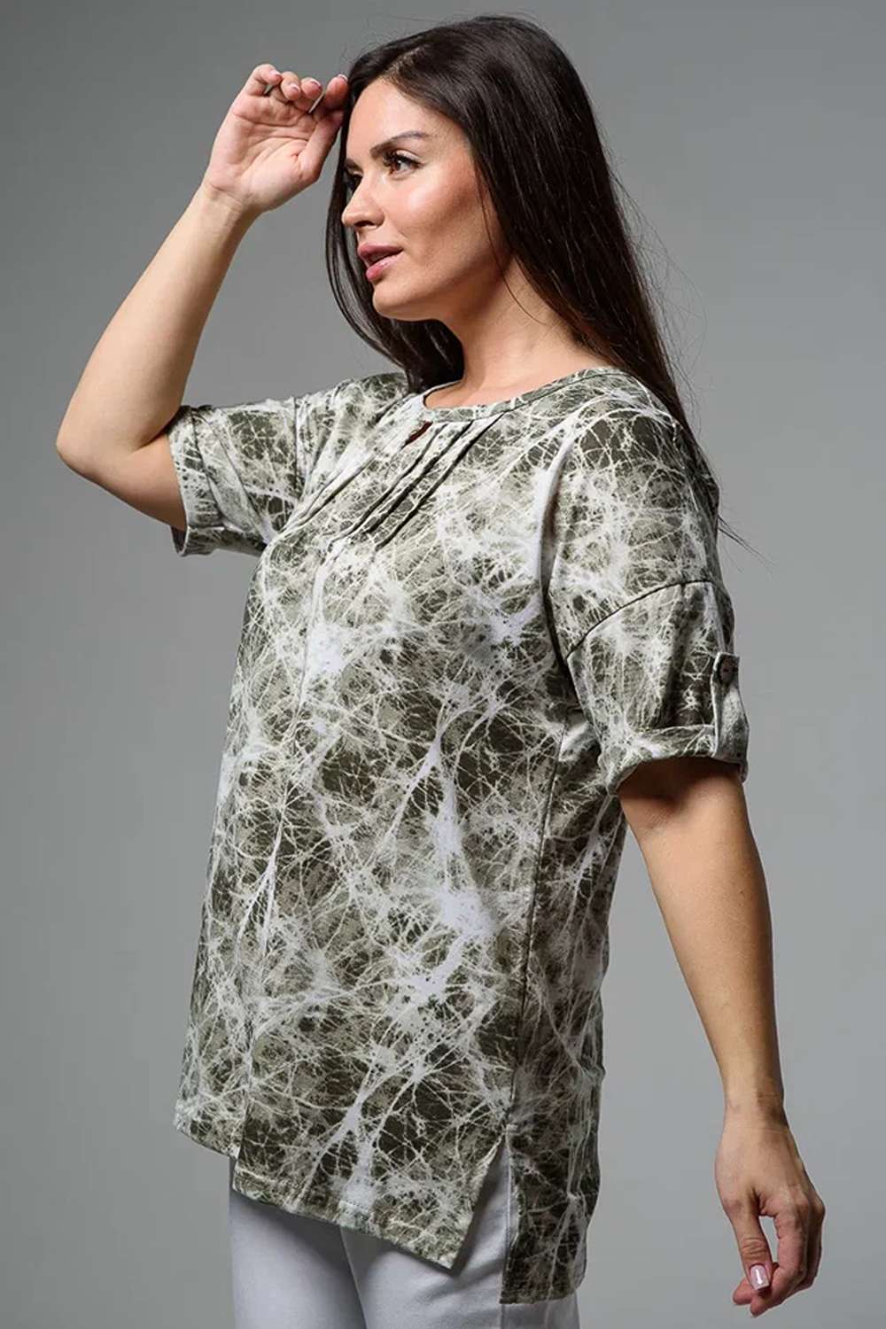 Туника прямая, свободная, с округлой горловиной, с удлиненной спинкой. Рукав короткий, с манжетом и хлястом с пуговицей. В верхней части полочки обработаны декоративные защипы. Спинка с кокеткой. В нижней части боковых швов расположены разрезы. Горловина обработана бейкой из основного полотна.