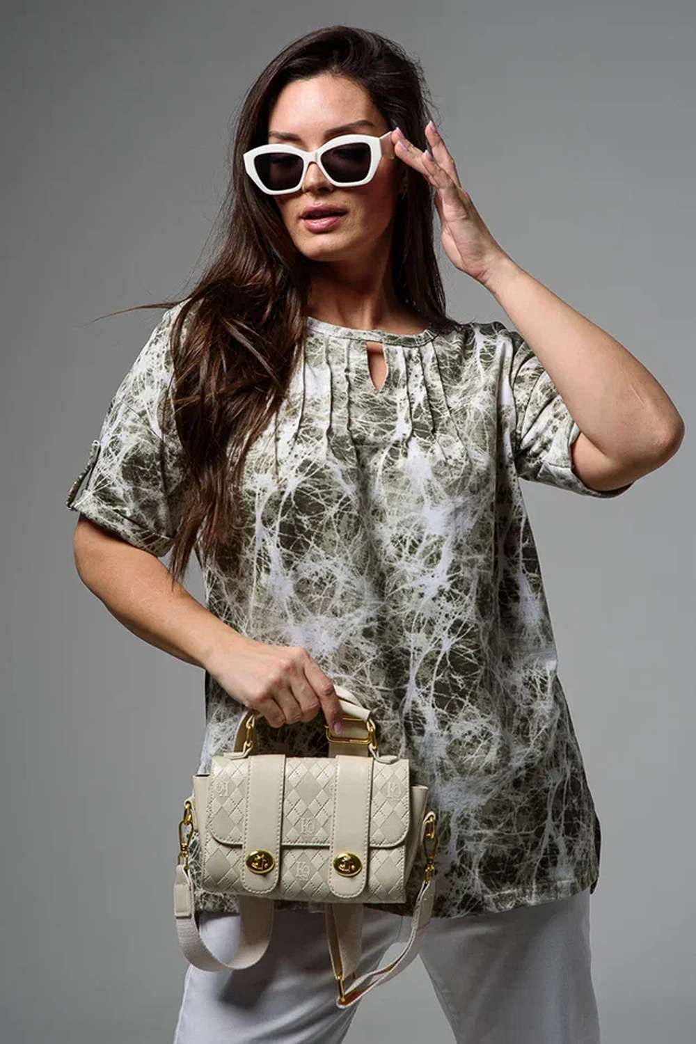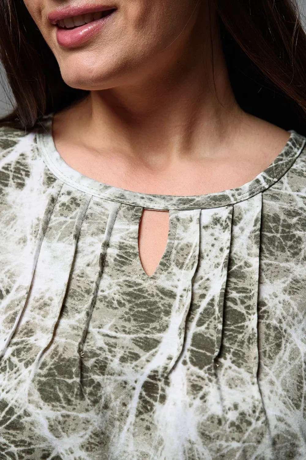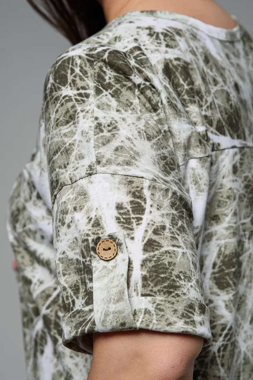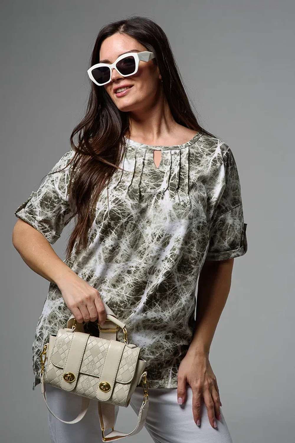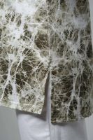 Туника прямая, свободная, с округлой горловиной, с удлиненной спинкой. Рукав короткий, с манжетом и хлястом с пуговицей. В верхней части полочки обработаны декоративные защипы. Спинка с кокеткой. В нижней части боковых швов расположены разрезы. Горловина обработана бейкой из основного полотна.