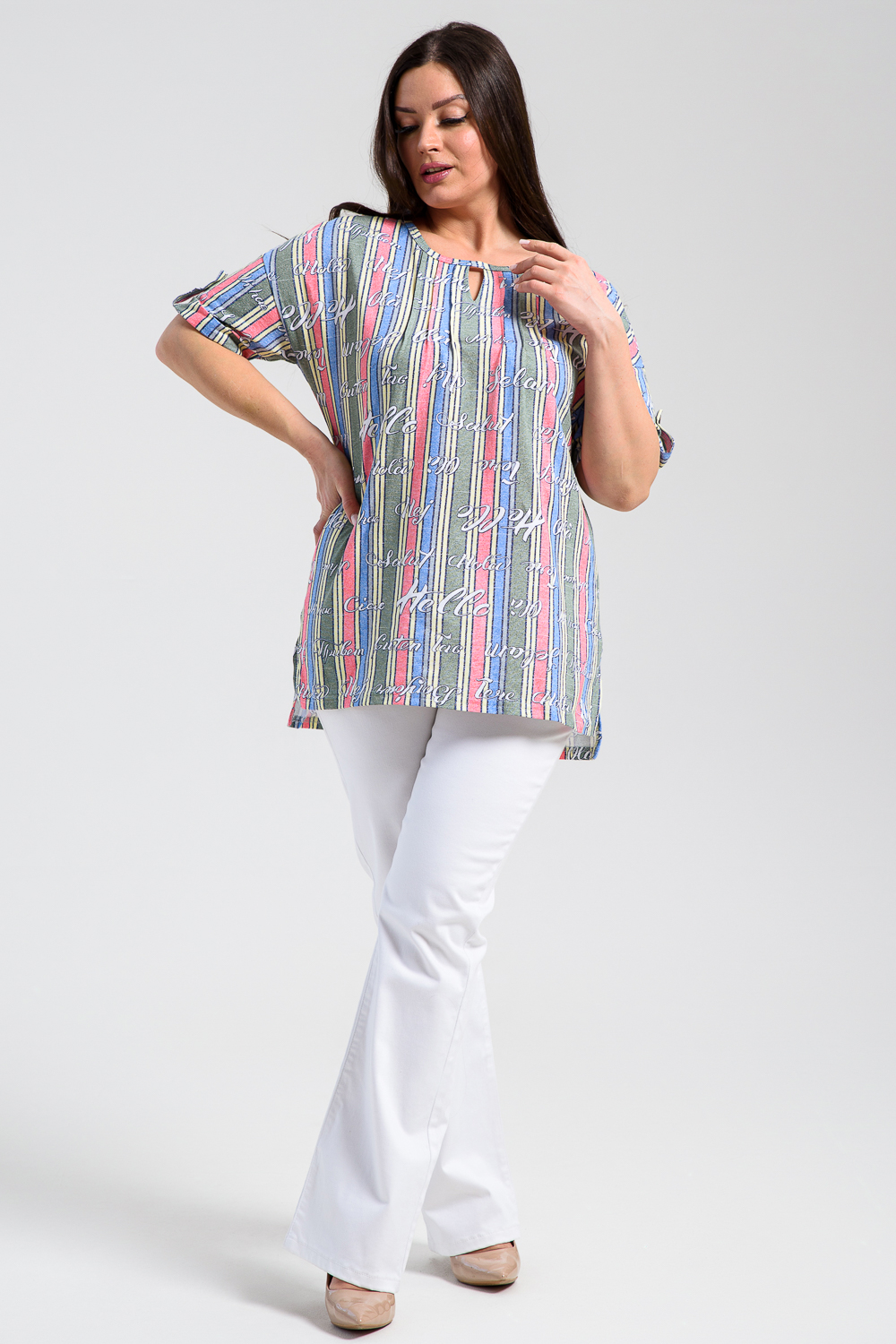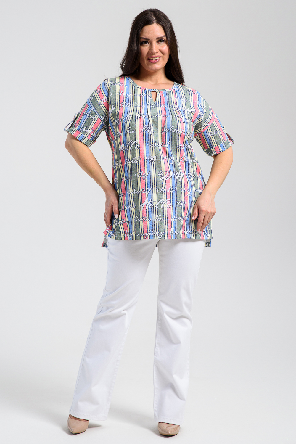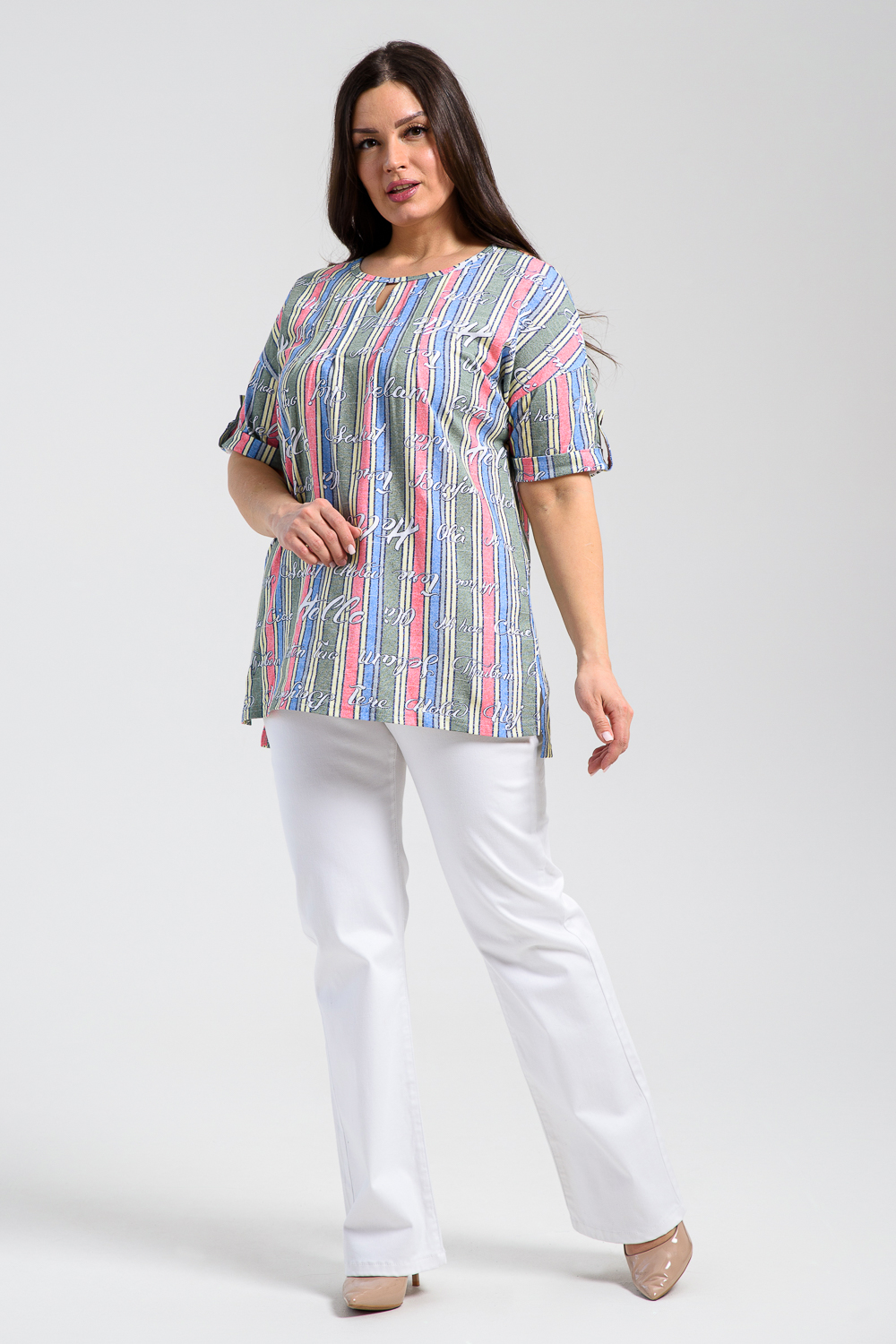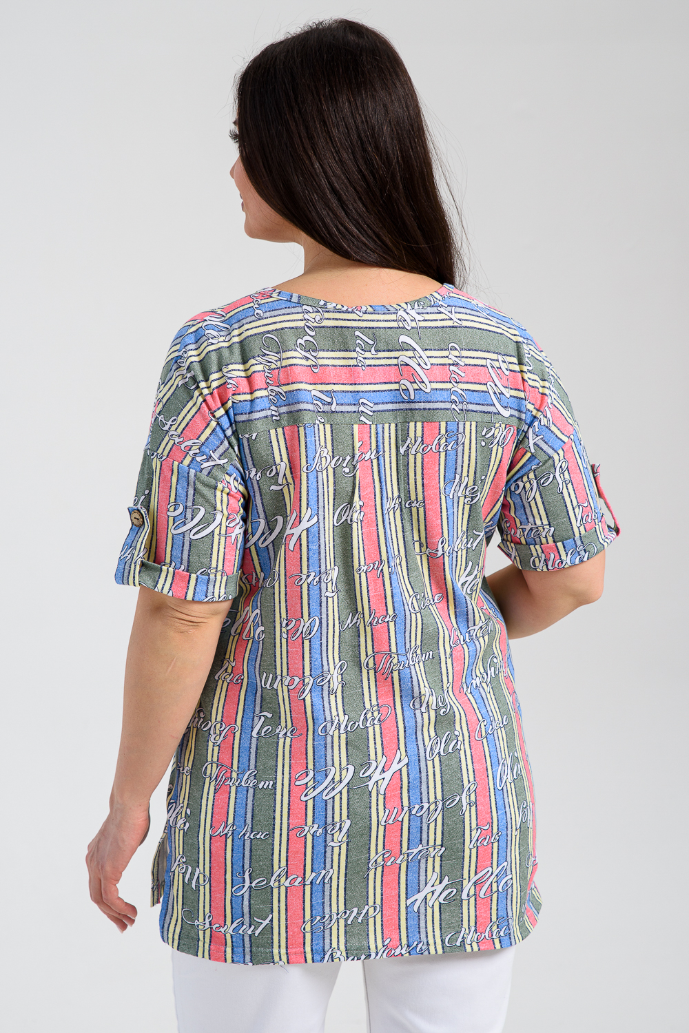 Туника прямая, свободная, с округлой горловиной, с удлиненной спинкой. Рукав короткий, с манжетом и хлястом с пуговицей. В верхней части полочки обработаны декоративные защипы. Спинка с кокеткой. В нижней части боковых швов расположены разрезы. Горловина обработана бейкой из основного полотна.