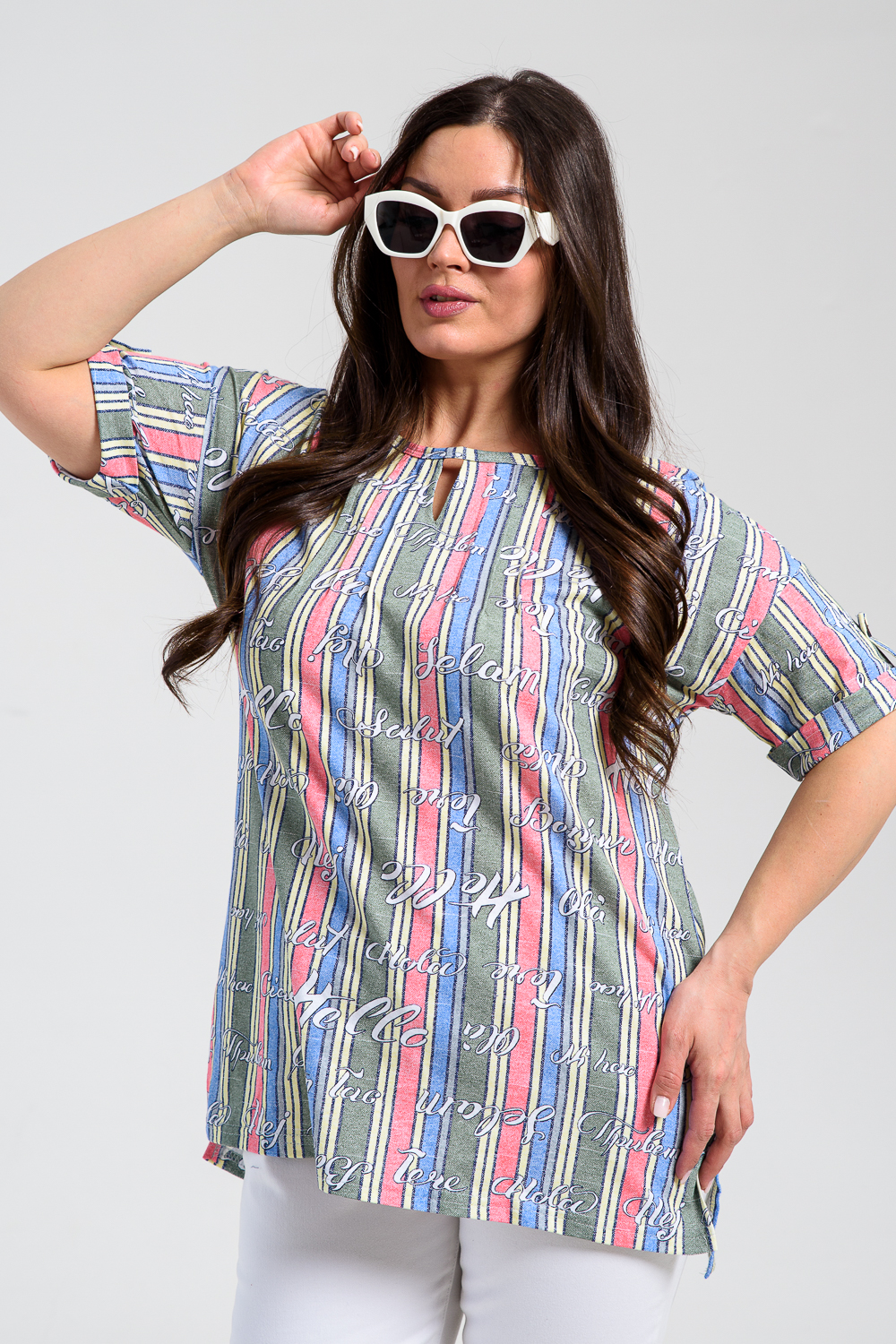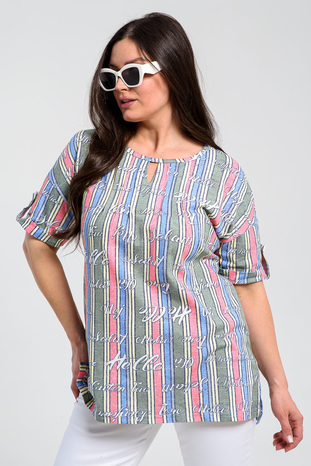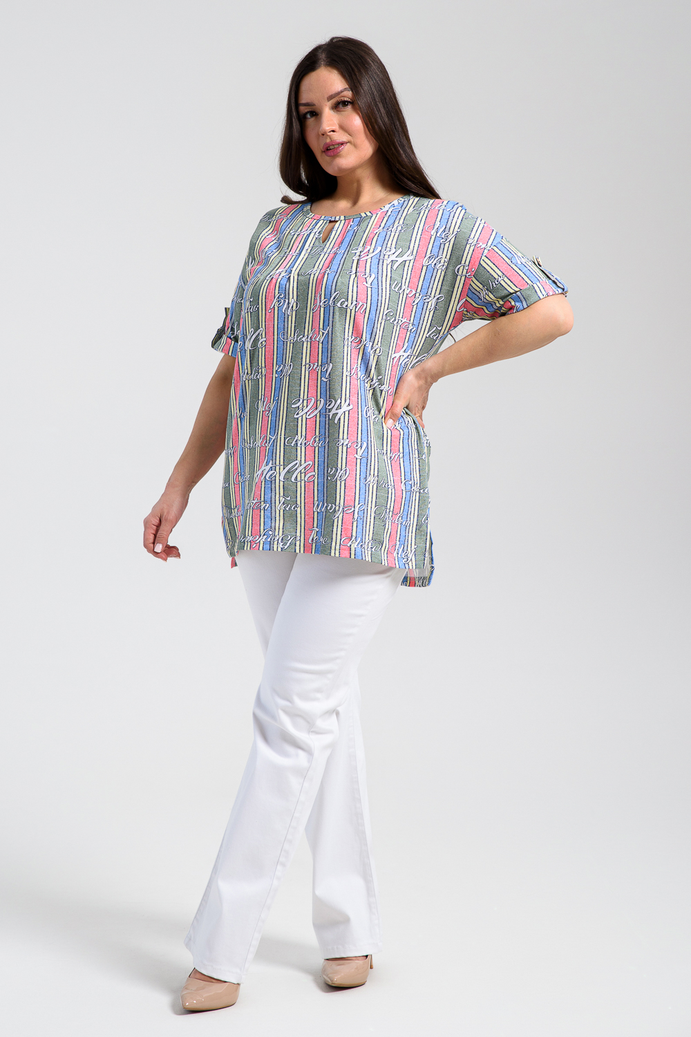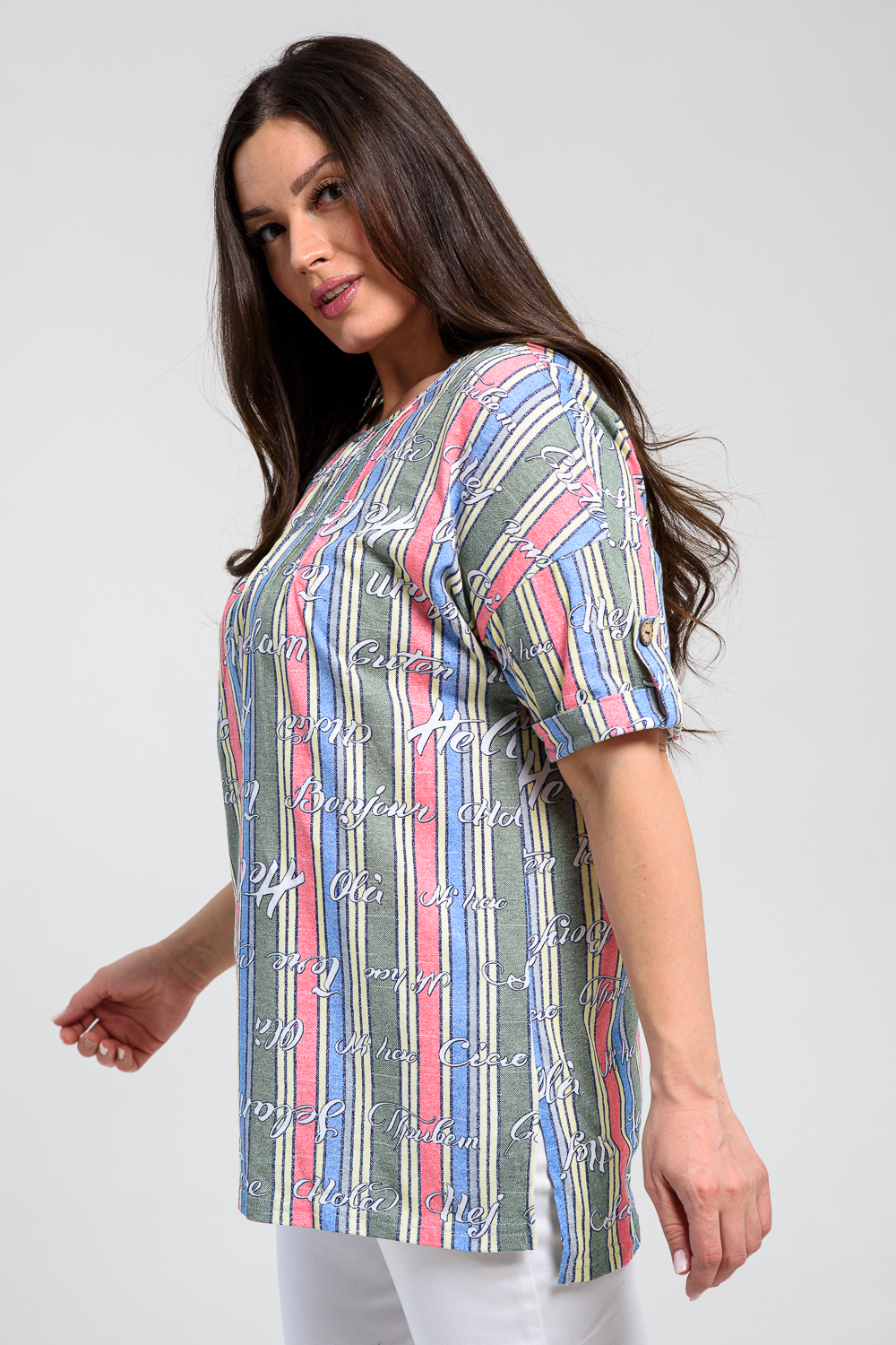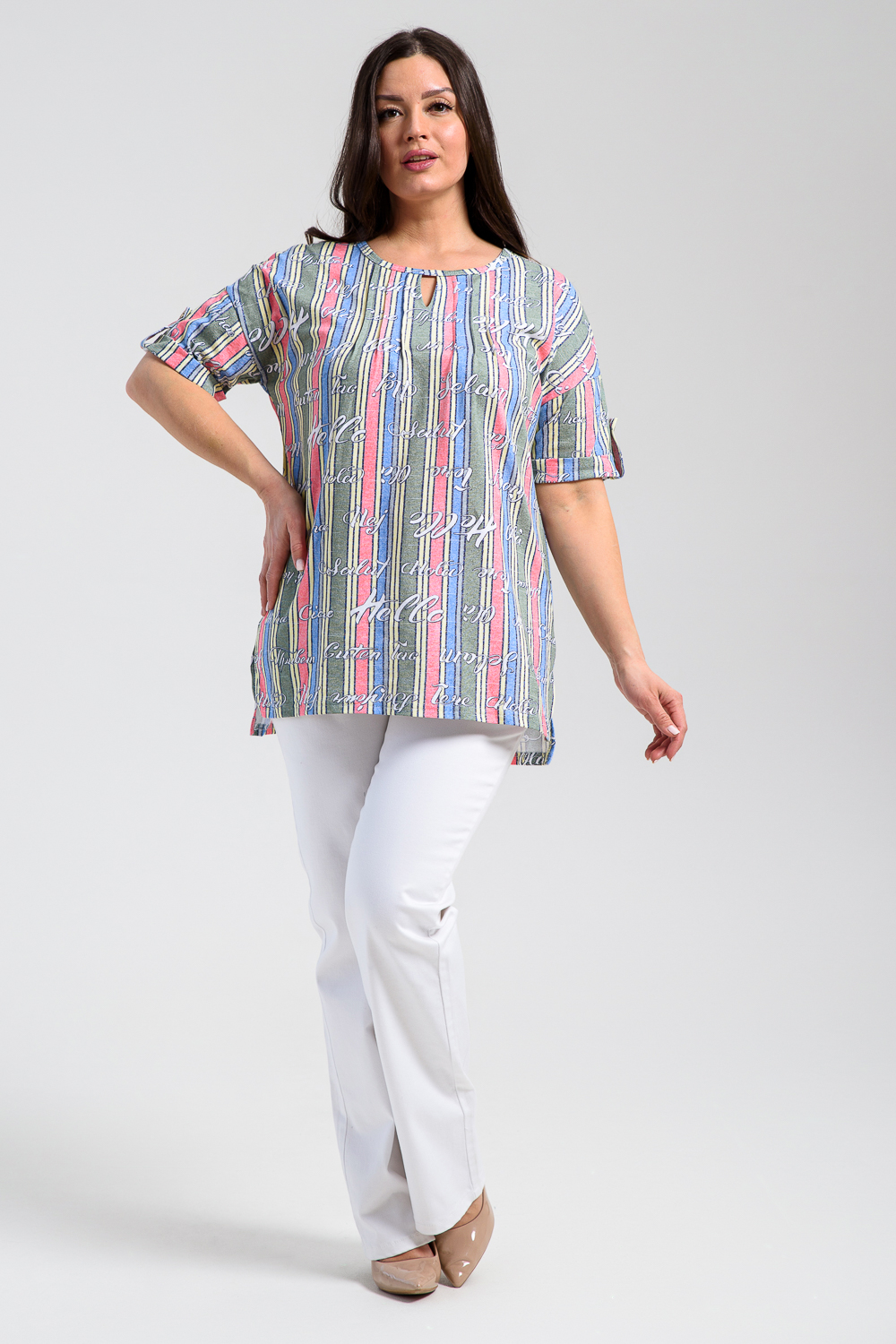 Туника прямая, свободная, с округлой горловиной, с удлиненной спинкой. Рукав короткий, с манжетом и хлястом с пуговицей. В верхней части полочки обработаны декоративные защипы. Спинка с кокеткой. В нижней части боковых швов расположены разрезы. Горловина обработана бейкой из основного полотна.
