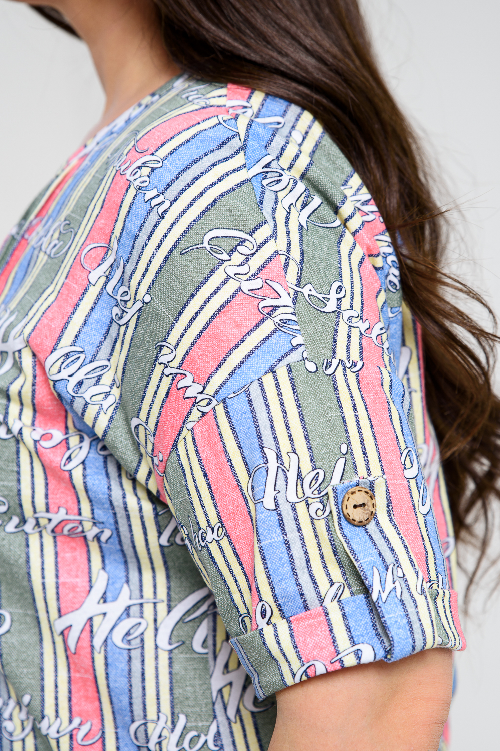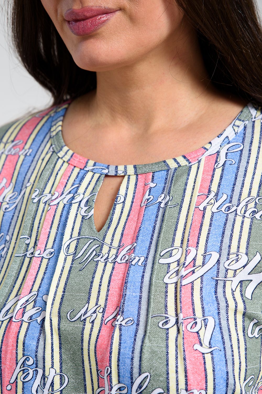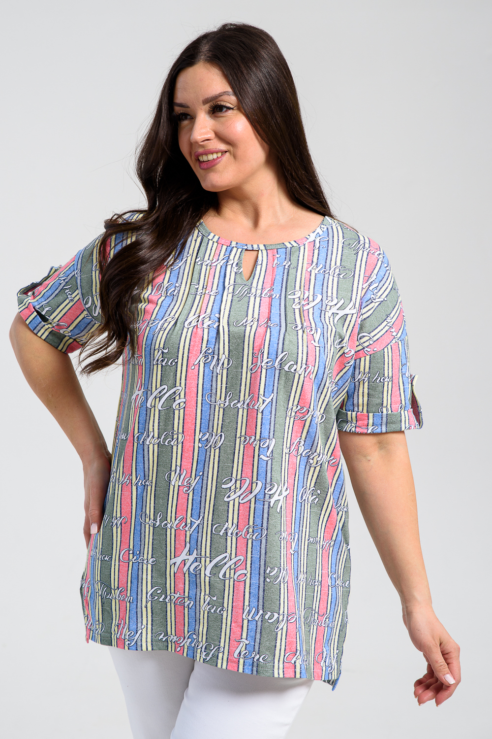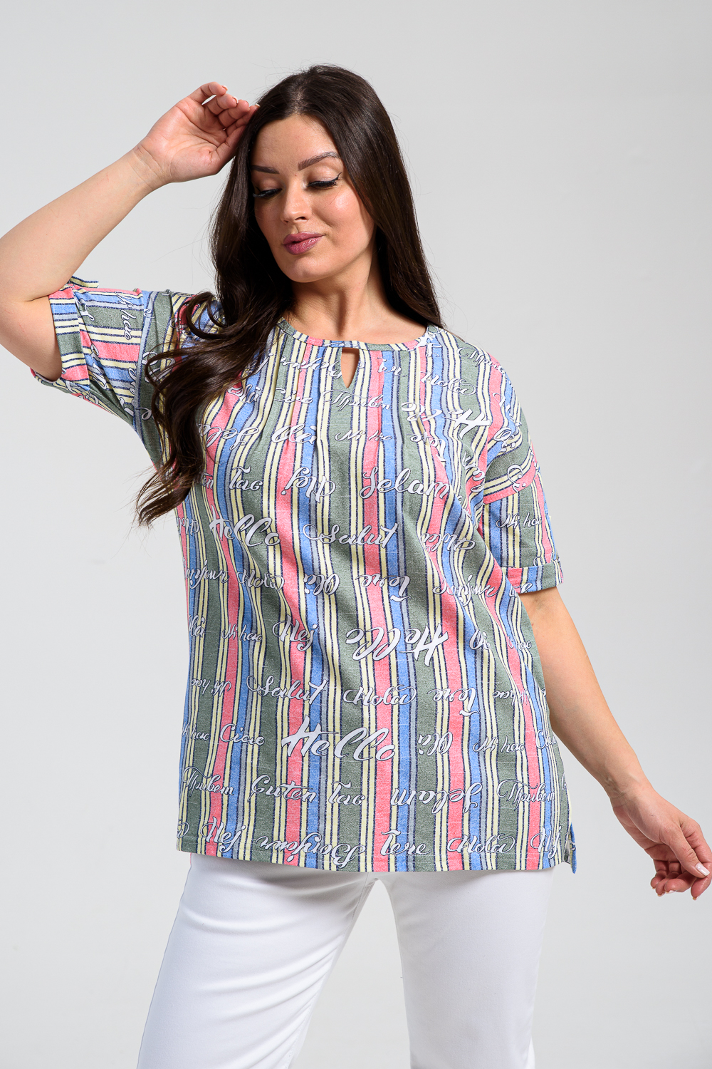 Туника прямая, свободная, с округлой горловиной, с удлиненной спинкой. Рукав короткий, с манжетом и хлястом с пуговицей. В верхней части полочки обработаны декоративные защипы. Спинка с кокеткой. В нижней части боковых швов расположены разрезы. Горловина обработана бейкой из основного полотна.