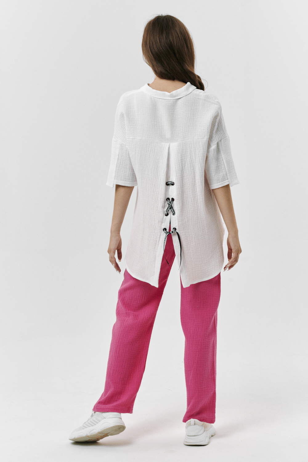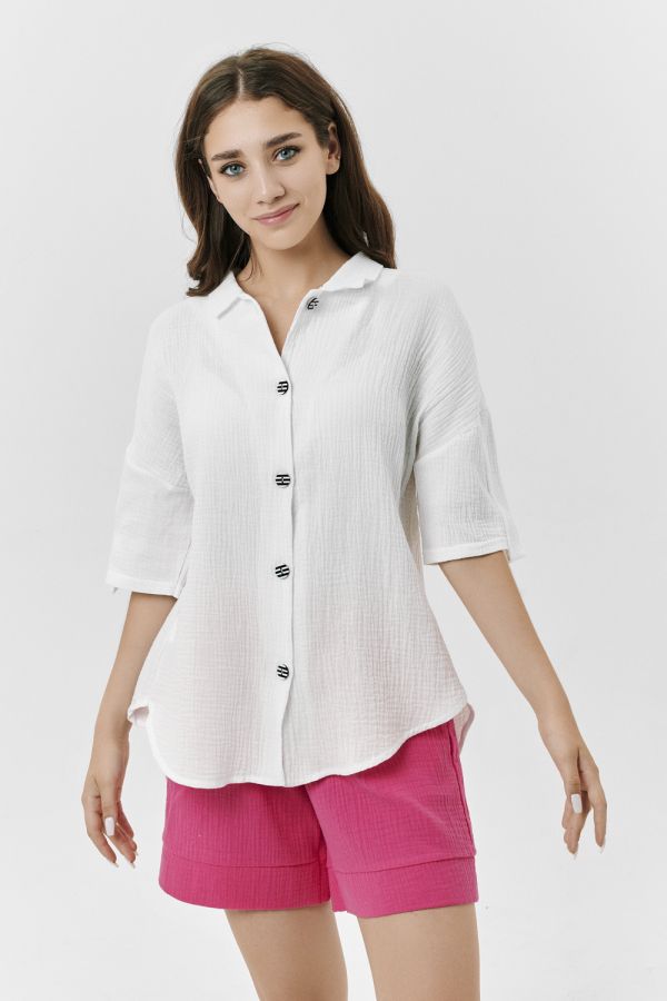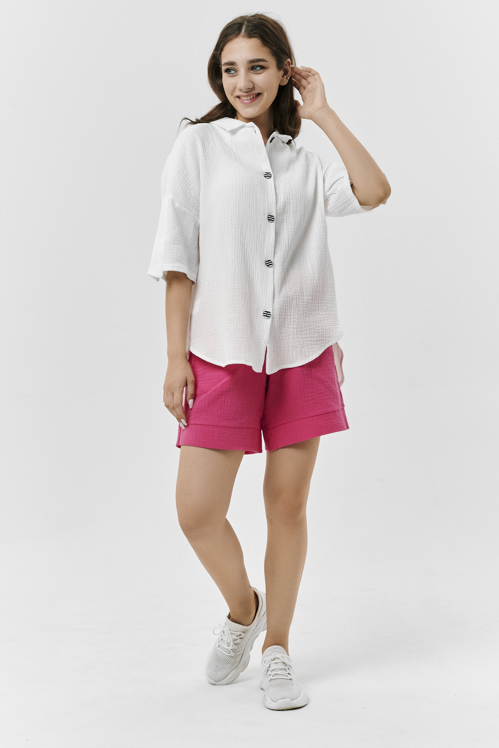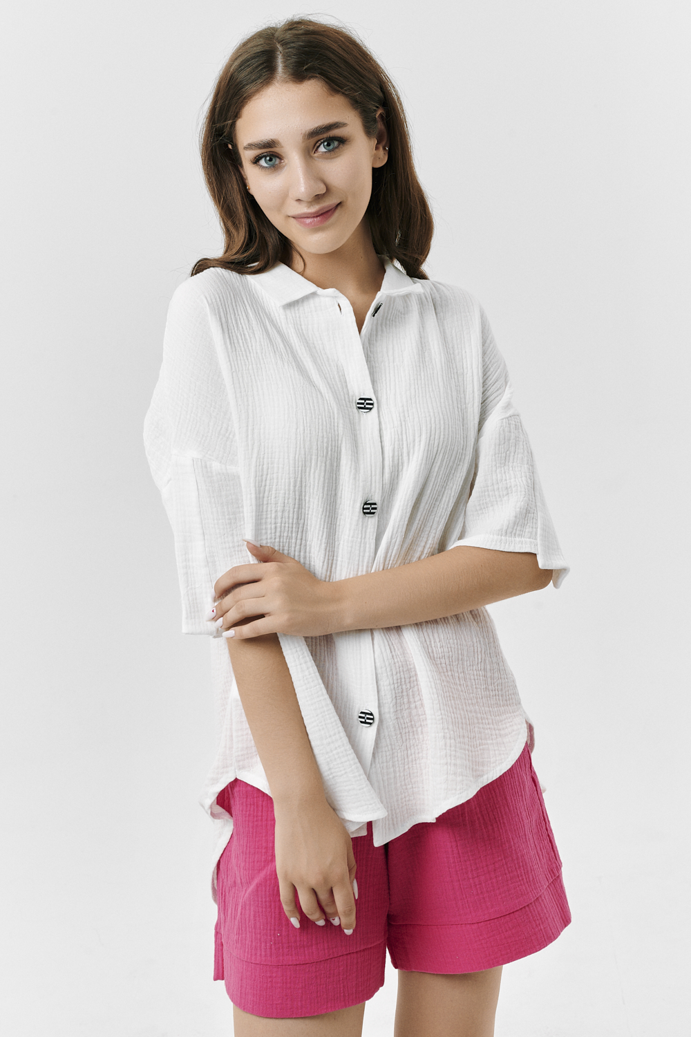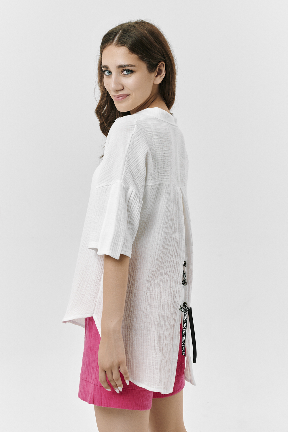 Женская туника-рубашка на пуговицах, с отложным воротником, свободная, с удлиненной спинкой и фигурной линией низа. Спинка со складкой с декоративной шнуровкой. Рукав короткий. Можно составить комплект с шортами 8259 или брюками 8266