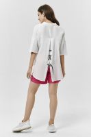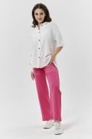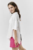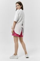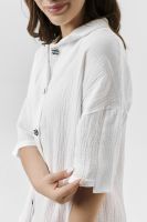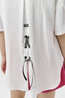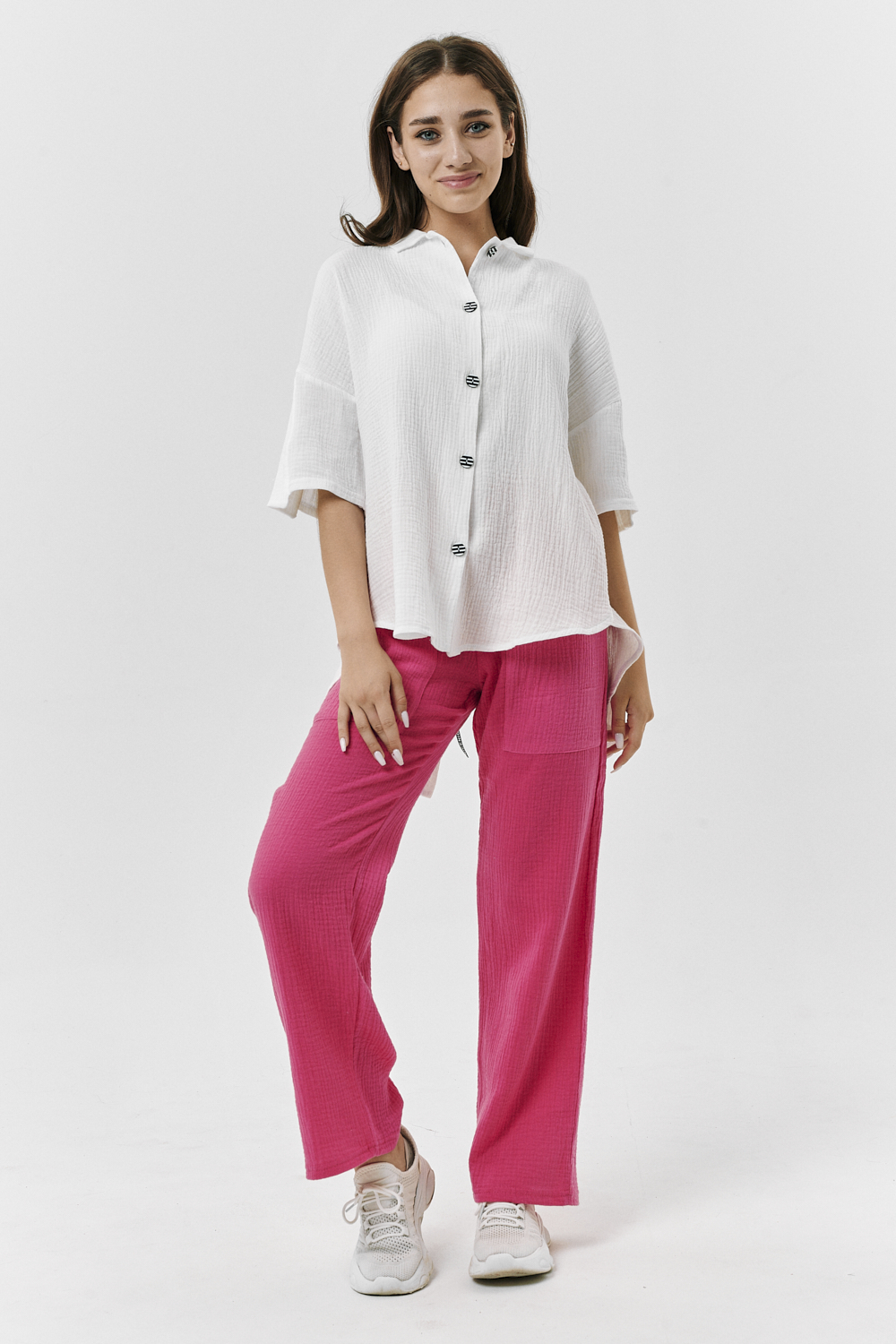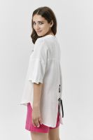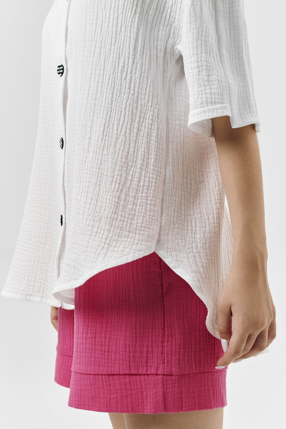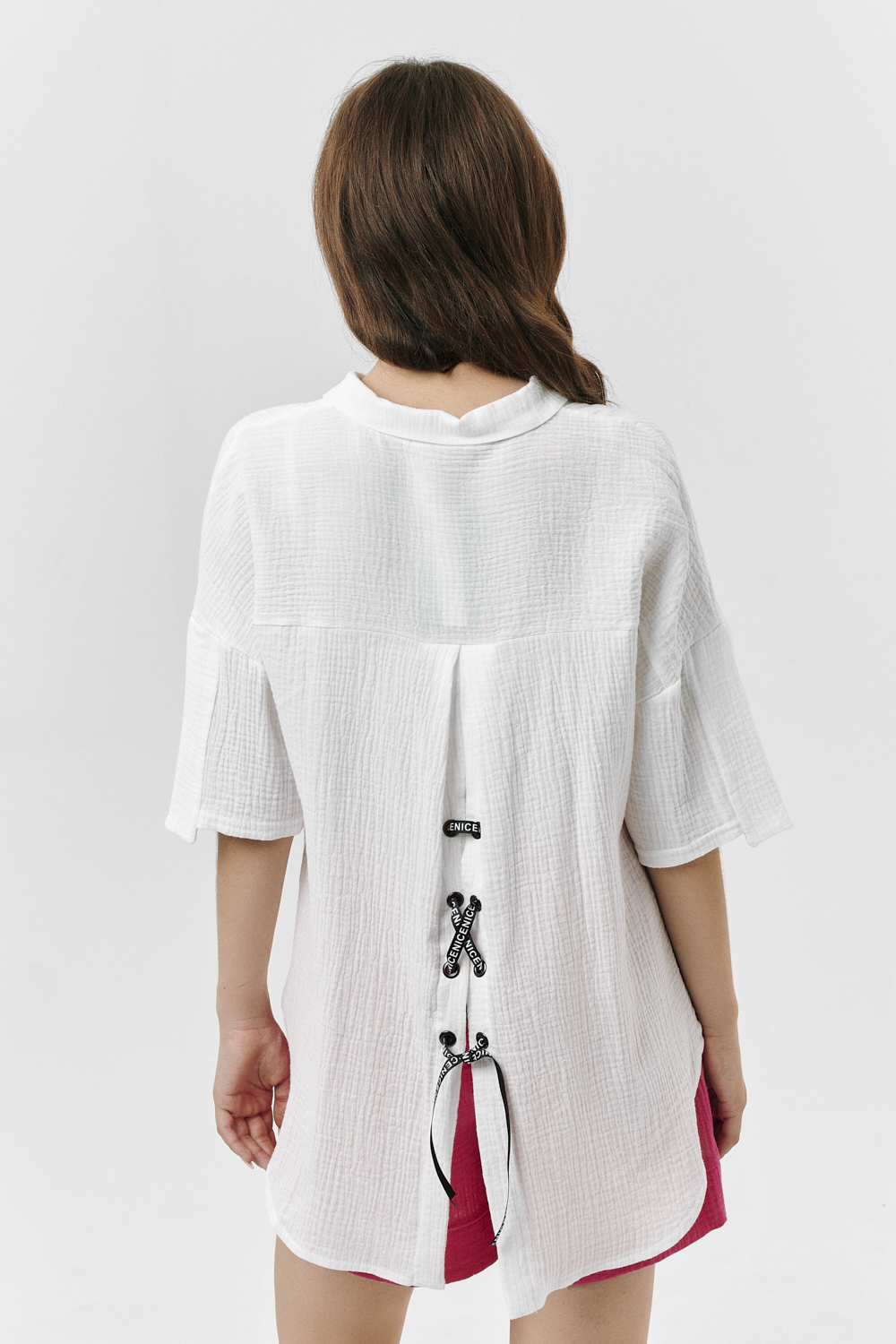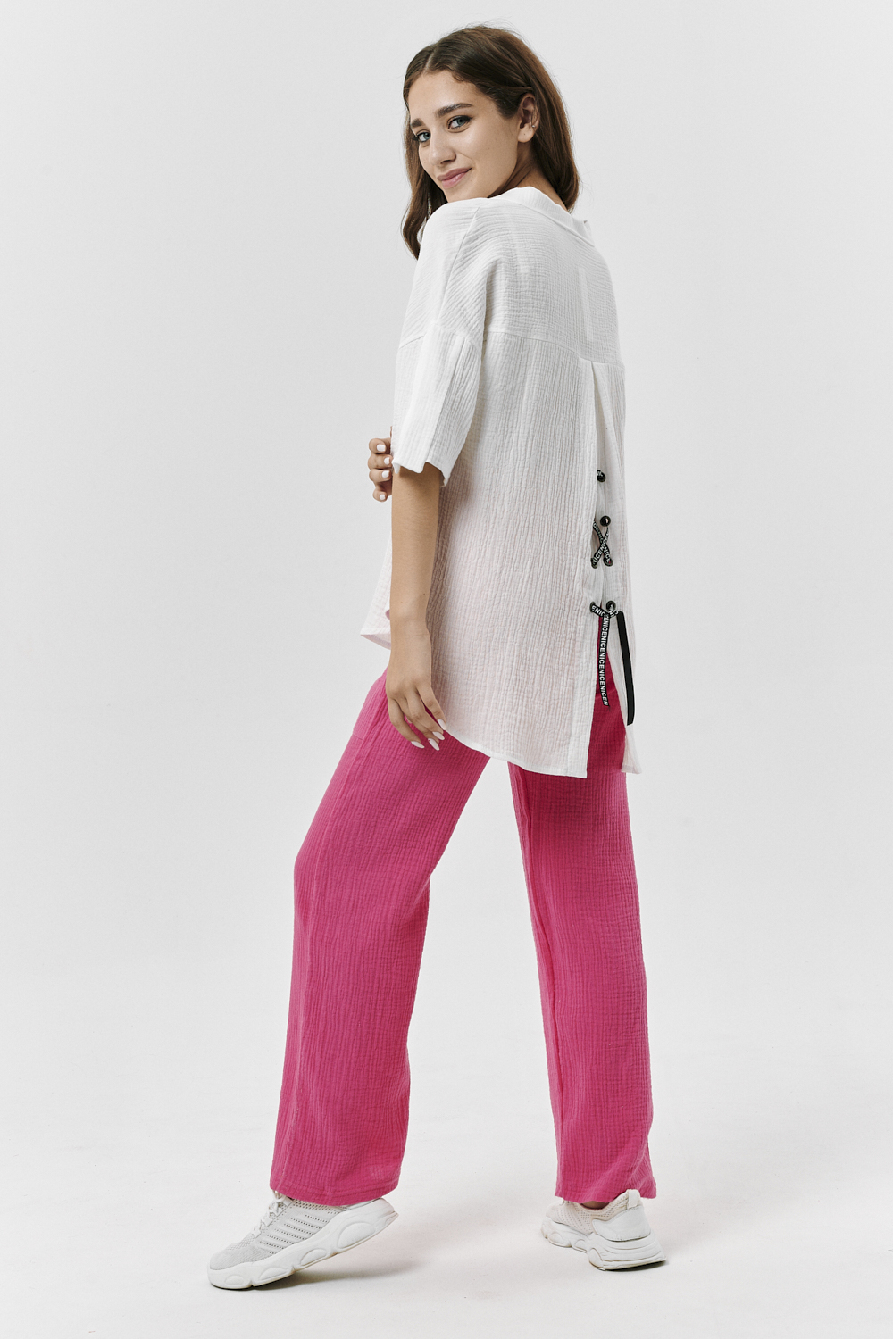 Женская туника-рубашка на пуговицах, с отложным воротником, свободная, с удлиненной спинкой и фигурной линией низа. Спинка со складкой с декоративной шнуровкой. Рукав короткий. Можно составить комплект с шортами 8259 или брюками 8266