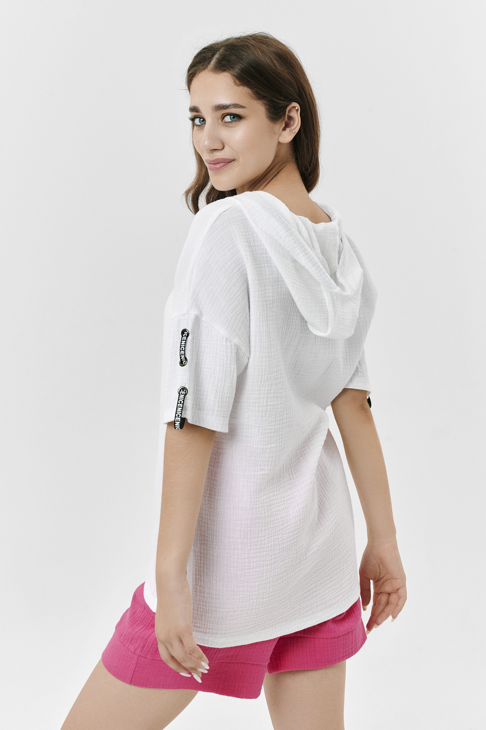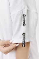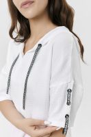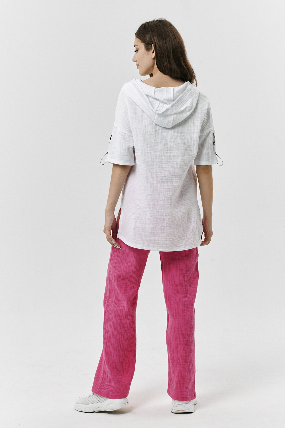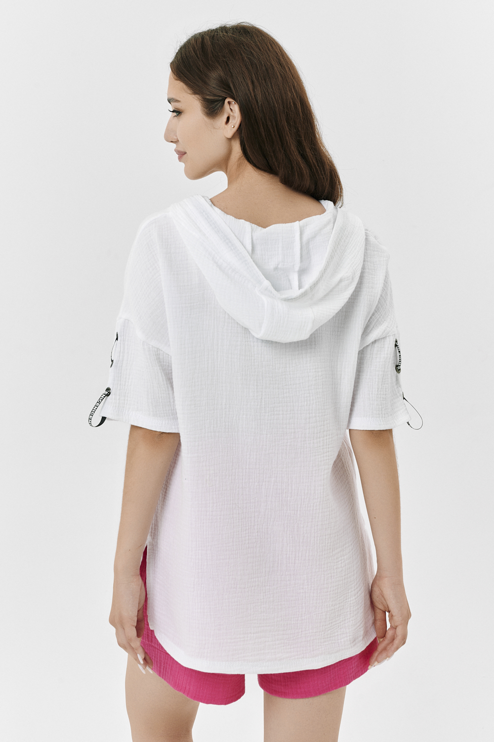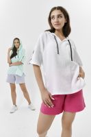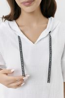 Туника прямая, свободная, с капюшоном, с удлиненной спинкой. Рукав короткий, с декоративными элементами вдоль рукава. В нижней части боковых швов обработаны разрезы.