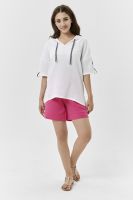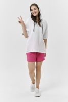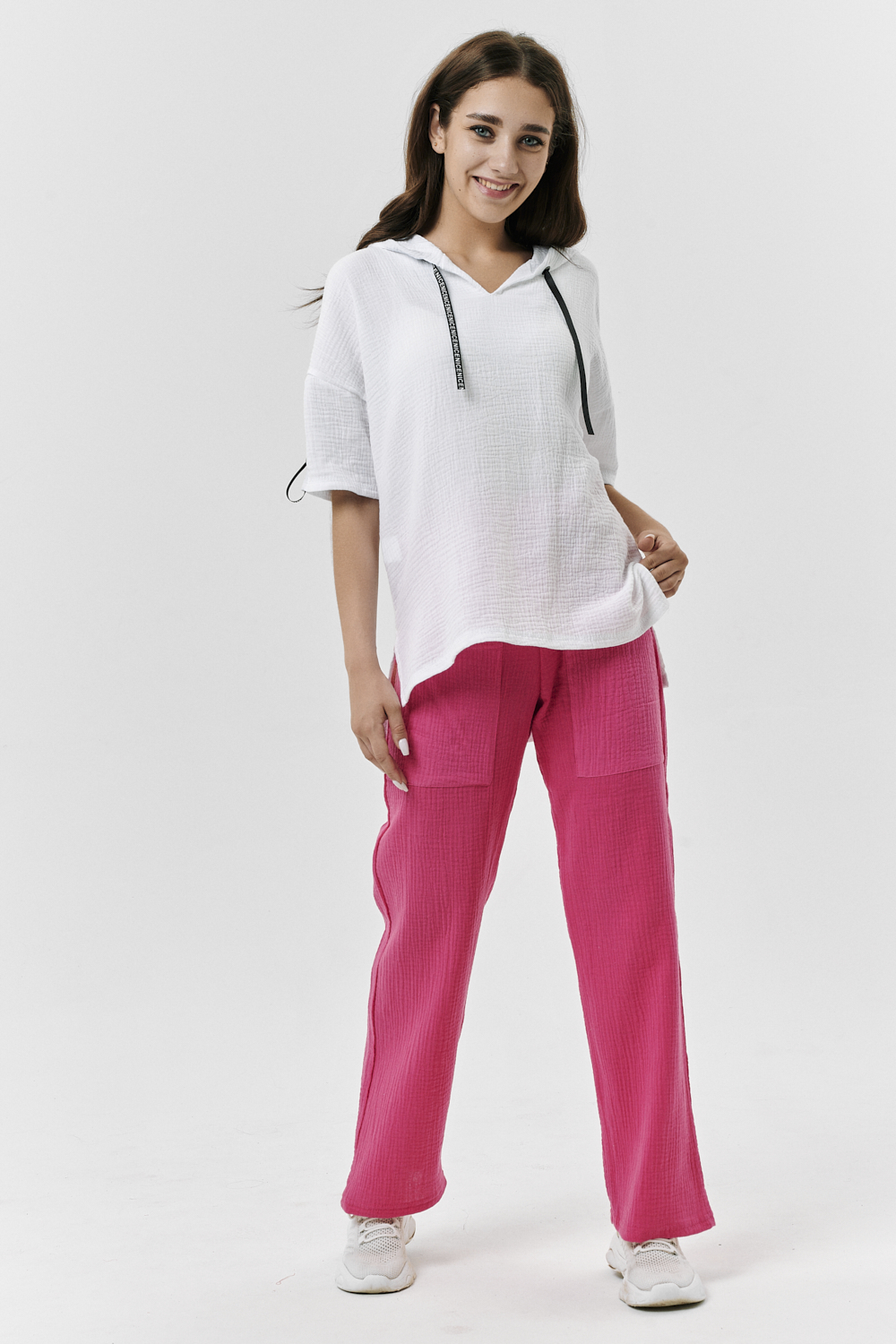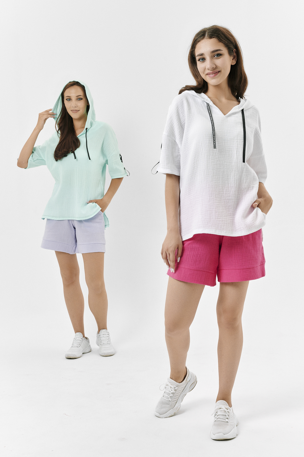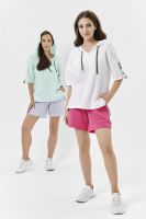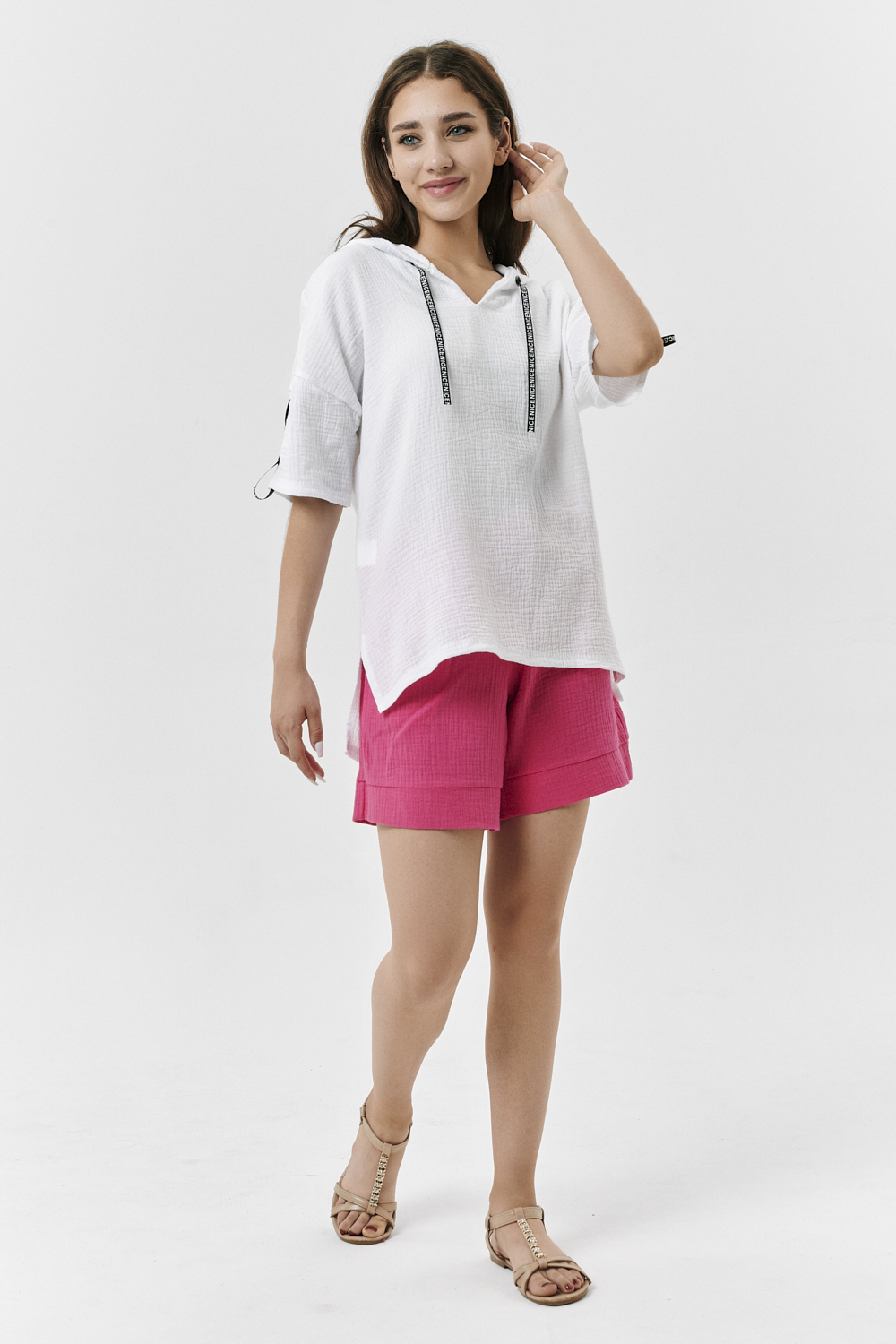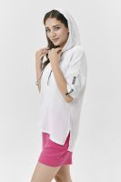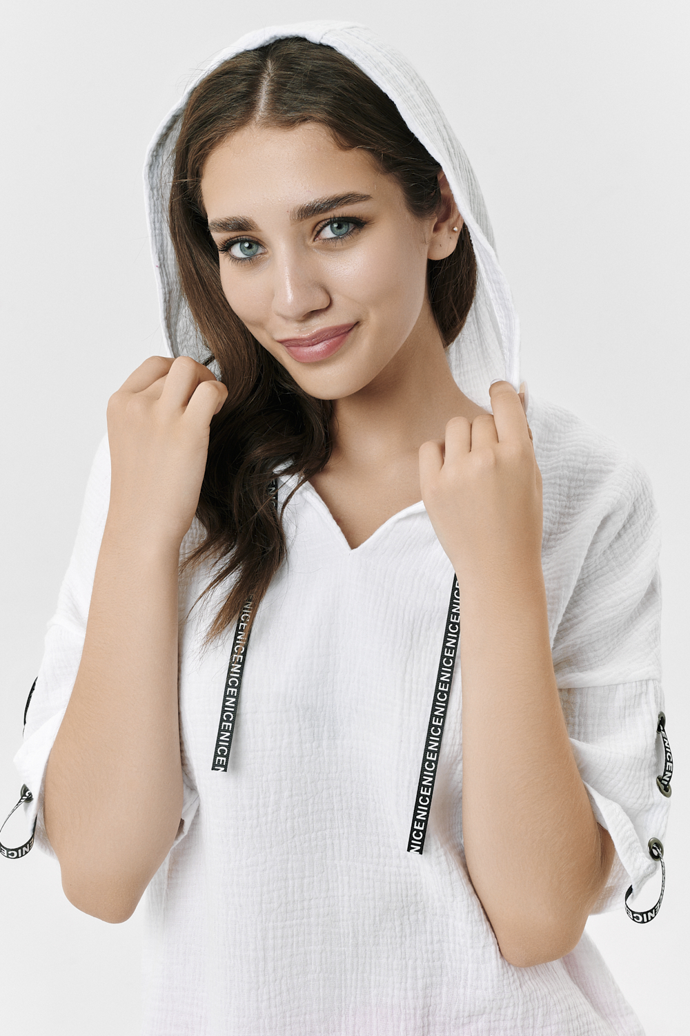 Туника прямая, свободная, с капюшоном, с удлиненной спинкой. Рукав короткий, с декоративными элементами вдоль рукава. В нижней части боковых швов обработаны разрезы.