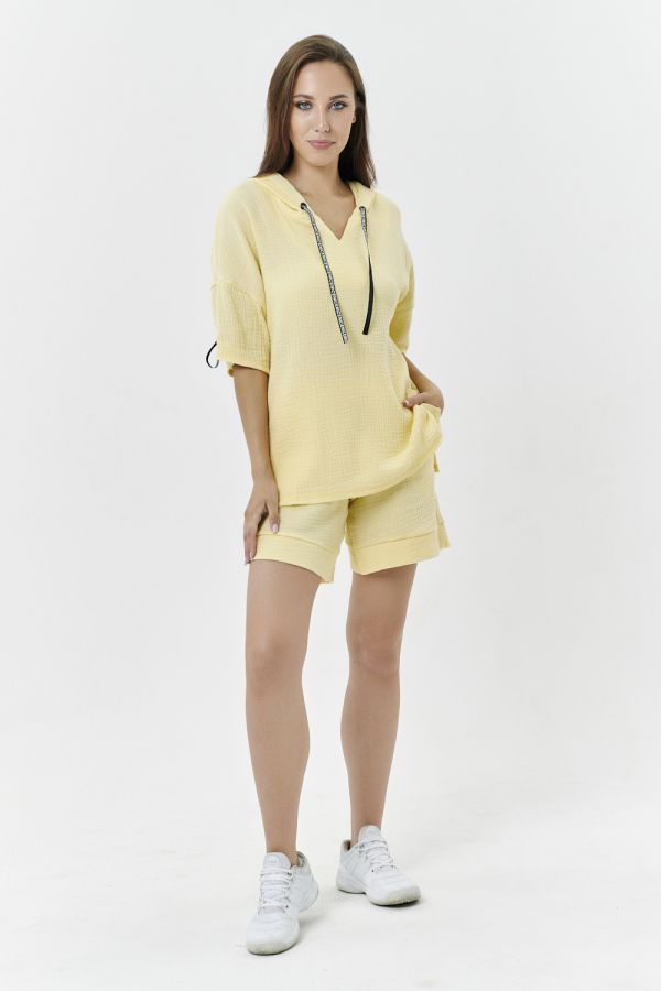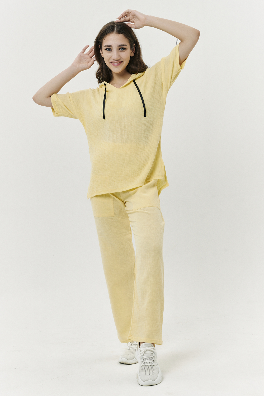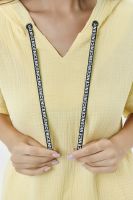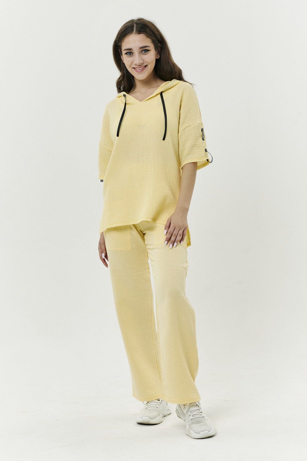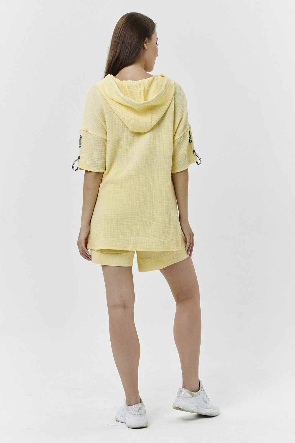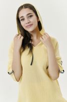 Туника прямая, свободная, с капюшоном, с удлиненной спинкой. Рукав короткий, с декоративными элементами вдоль рукава. В нижней части боковых швов обработаны разрезы.