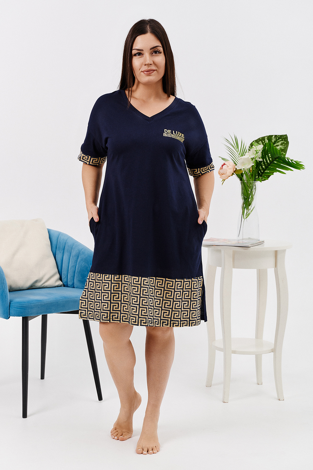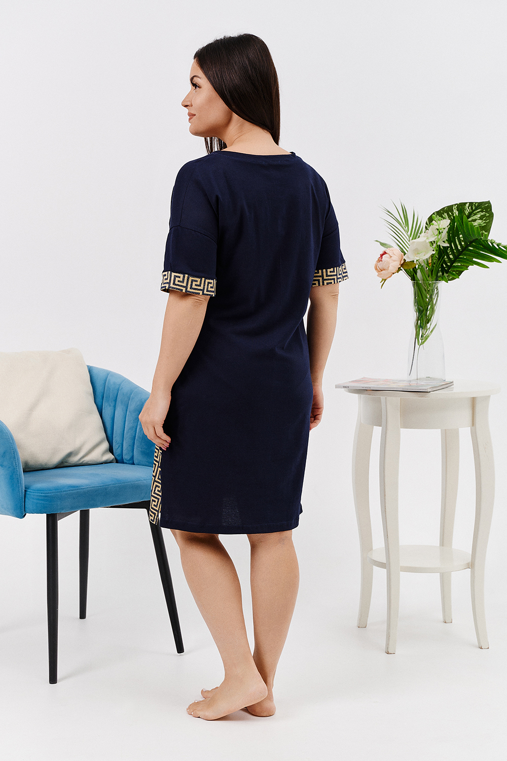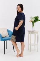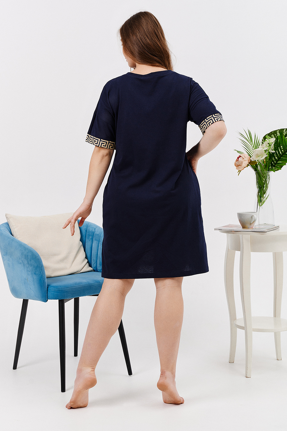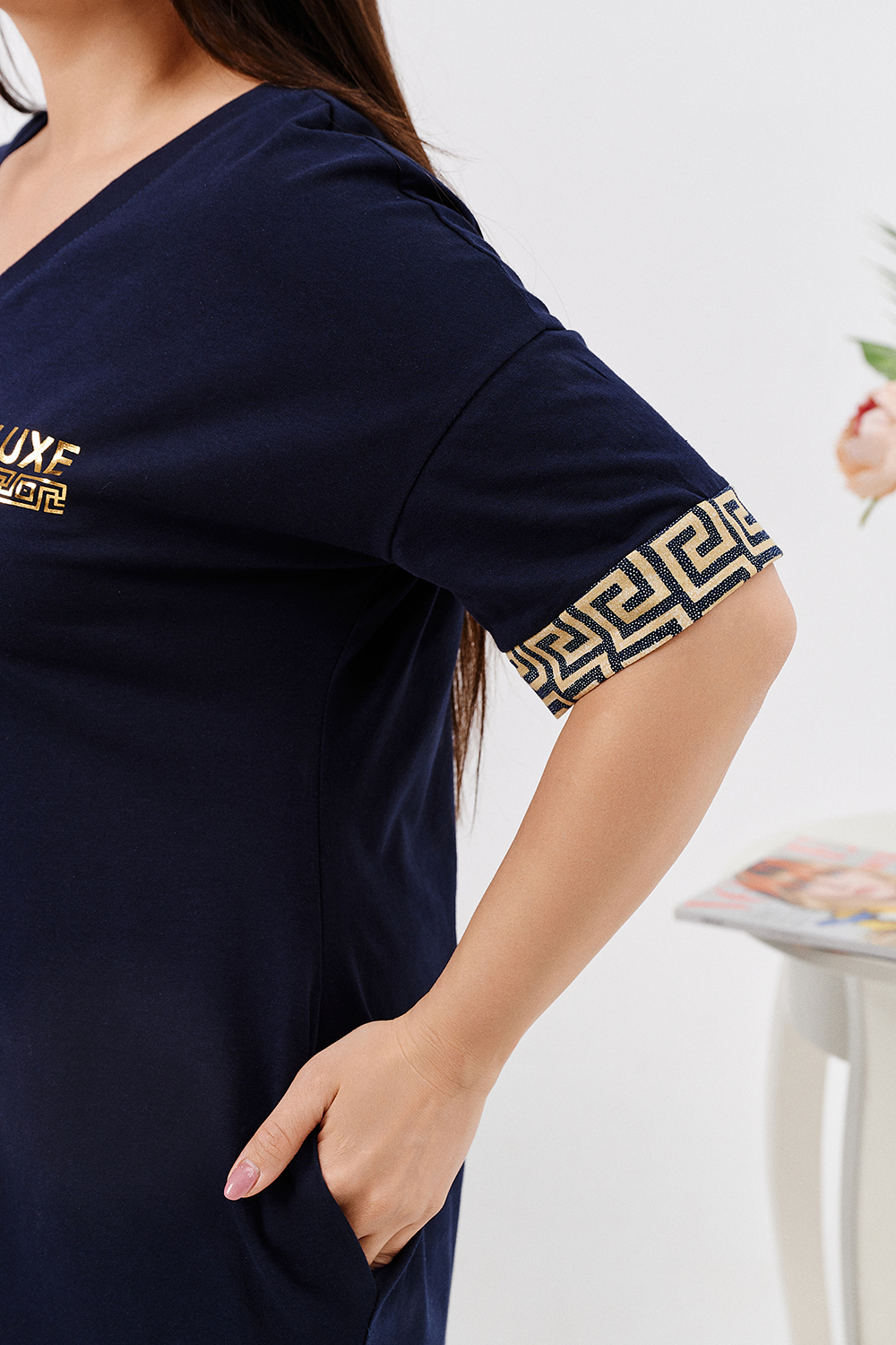 Туника прямого силуэта, с V-образной горловиной, с карманами в боковых швах. Рукав короткий, с манжетом из отделочной ткани. Низ полочки завершен деталью из отделочного полотна. В нижней части боковых швов обработаны разрезы. Горловина обработана обтачкой из основного полотна.