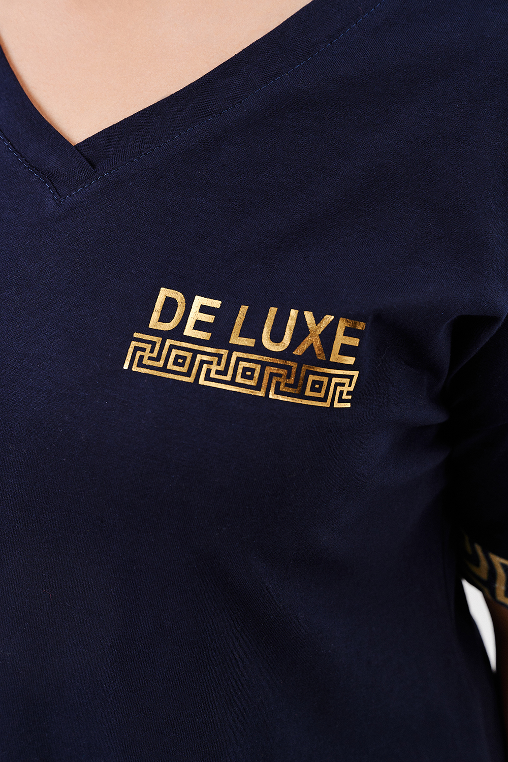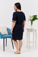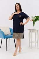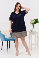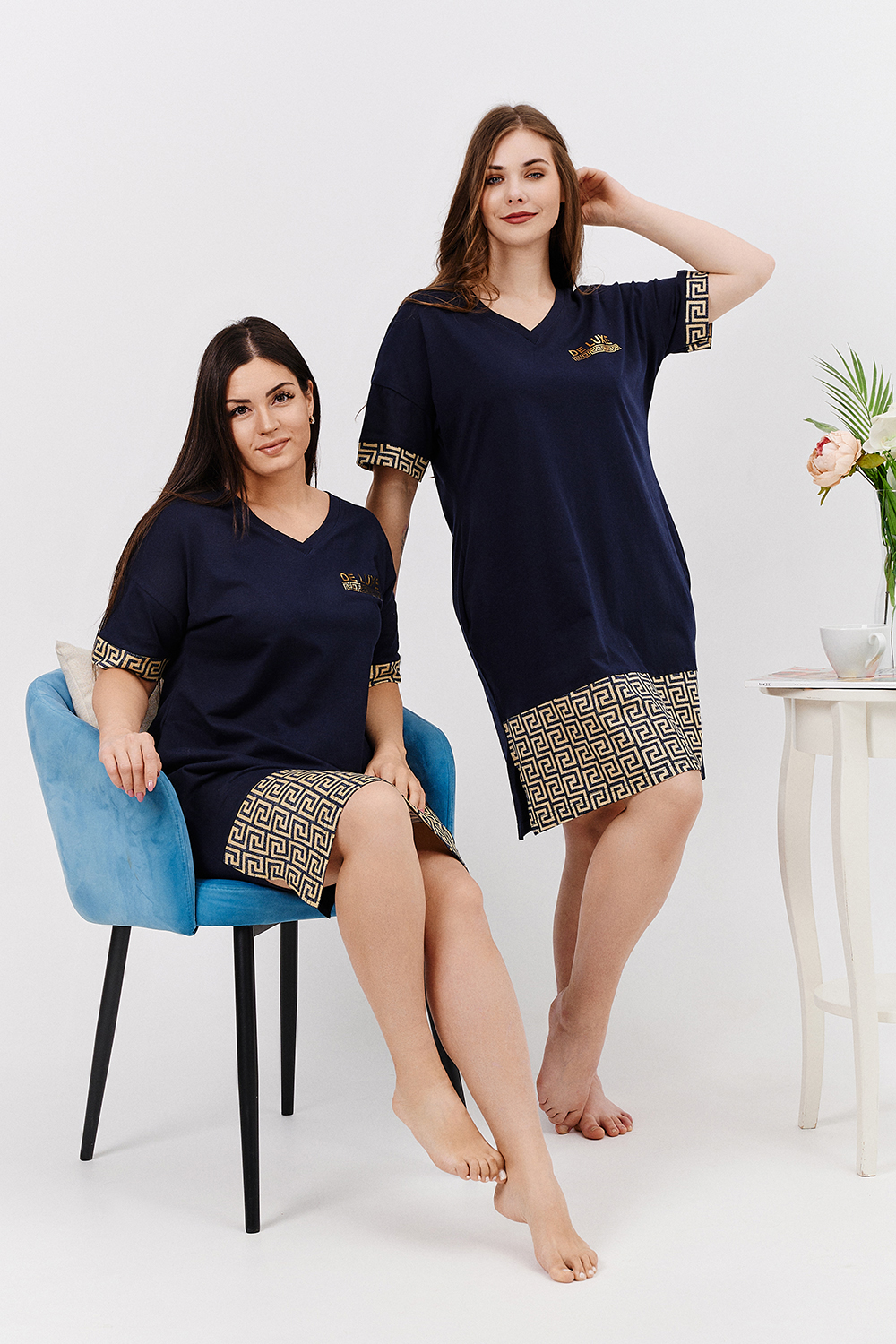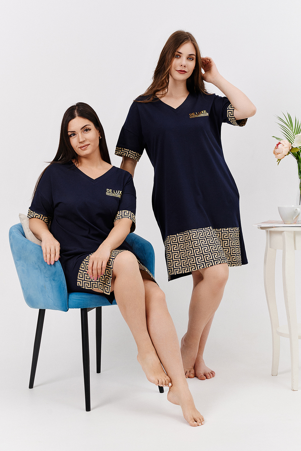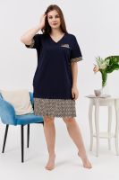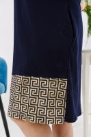 Туника прямого силуэта, с V-образной горловиной, с карманами в боковых швах. Рукав короткий, с манжетом из отделочной ткани. Низ полочки завершен деталью из отделочного полотна. В нижней части боковых швов обработаны разрезы. Горловина обработана обтачкой из основного полотна.