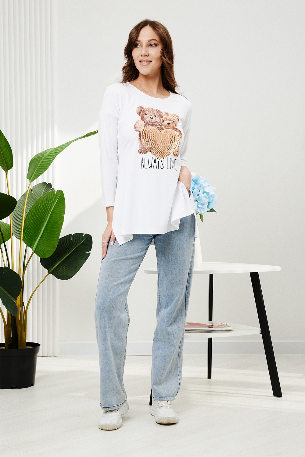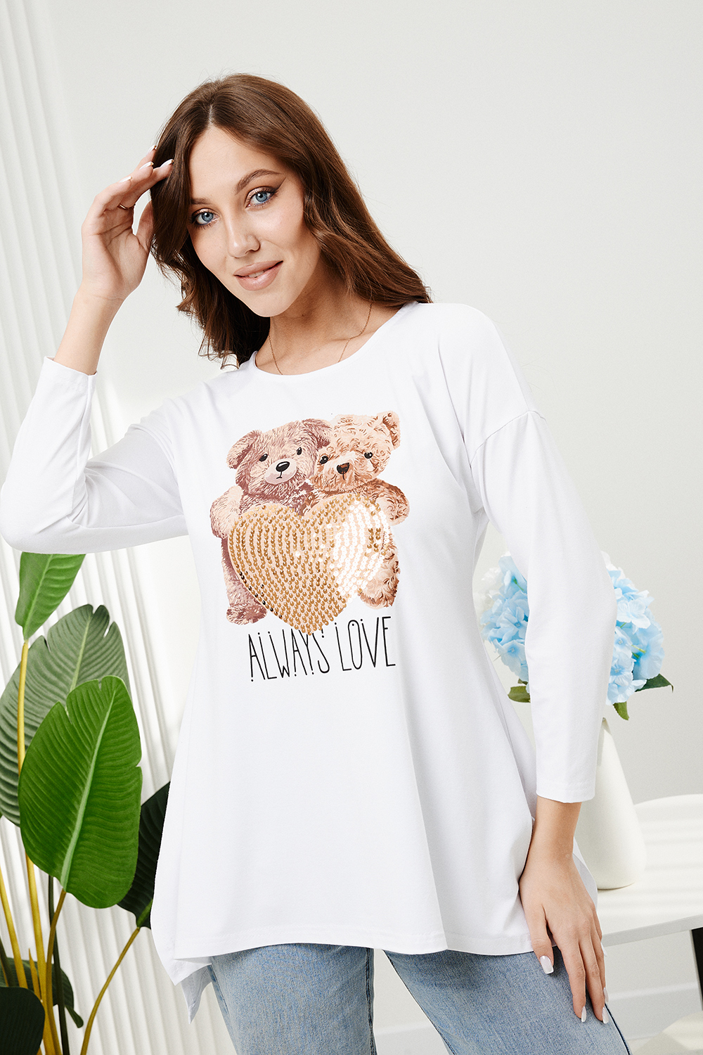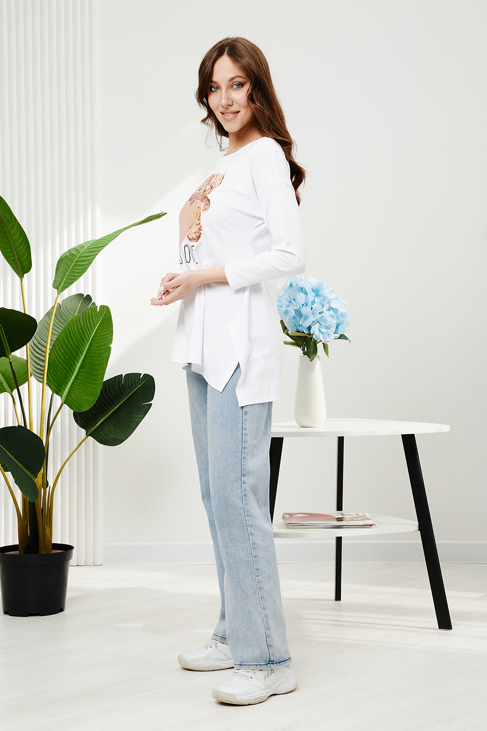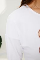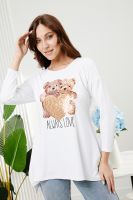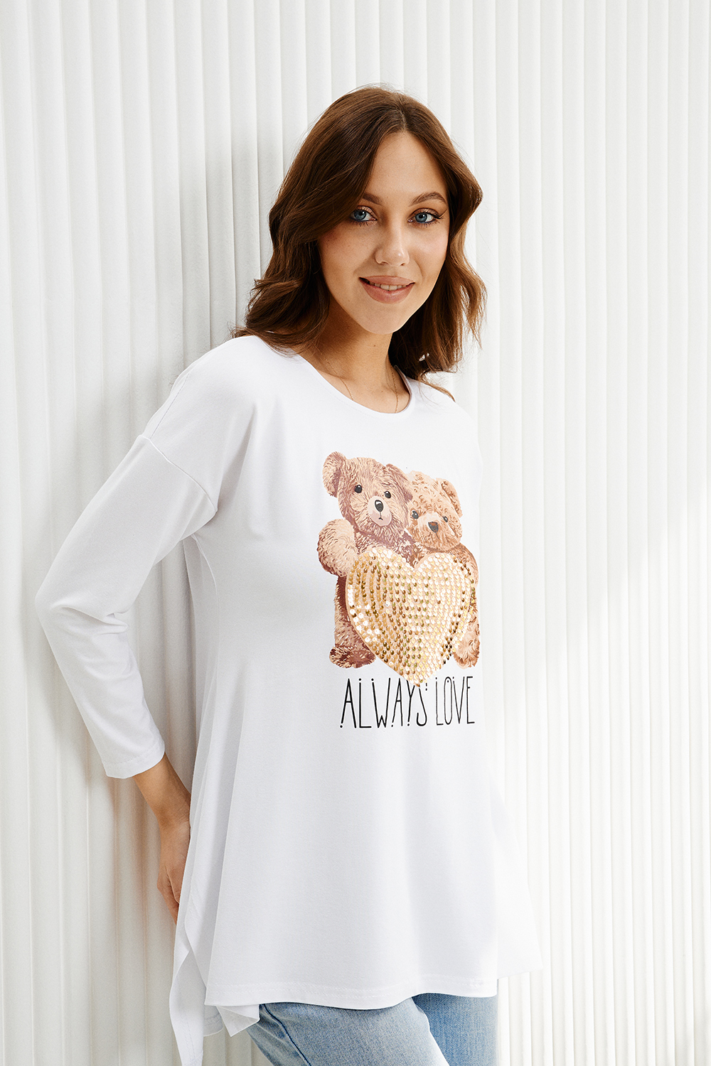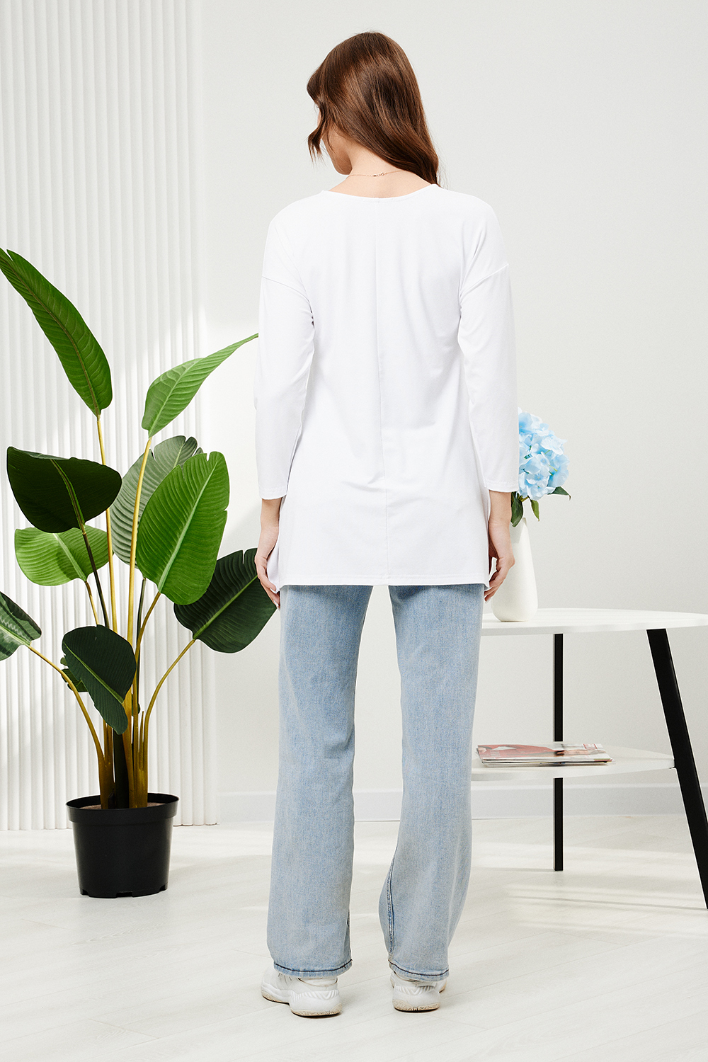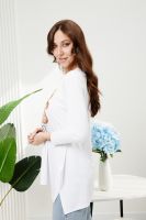 Туника трапецивидного силуэта с расклешением от линии талии, с округлой горловиной, с фигурной линией низа, с разрезами в нижней части боковых швов. Спинка удлиненная. Рукав длинный. Горловина обработана бейкой из основного полотна.