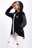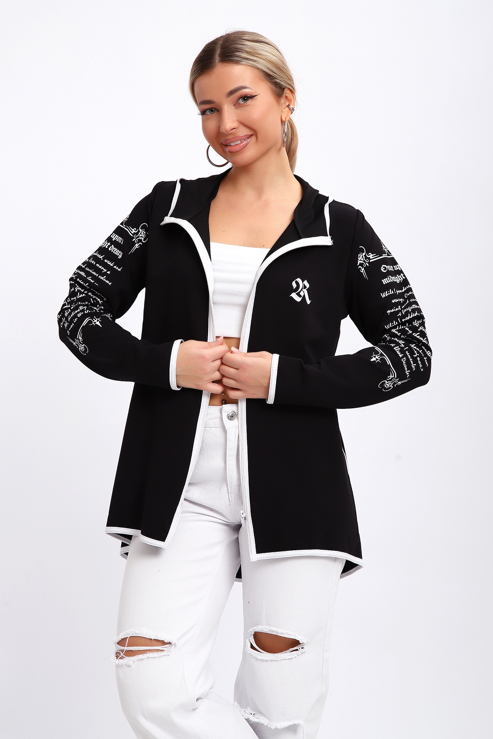 Туника необычного кроя на молнии, с капюшоном. Рукава длинные без манжетов, спинка длиннее переда. Карманы, рукава, капюшон и низ изделия обработан отделочной тканью. Принт на рукавах и полочке. Идеальное решение для прогулок, спорта или повседневного использования. Туника станет незаменимым элементом вашего гардероба.