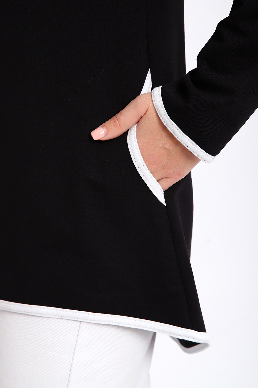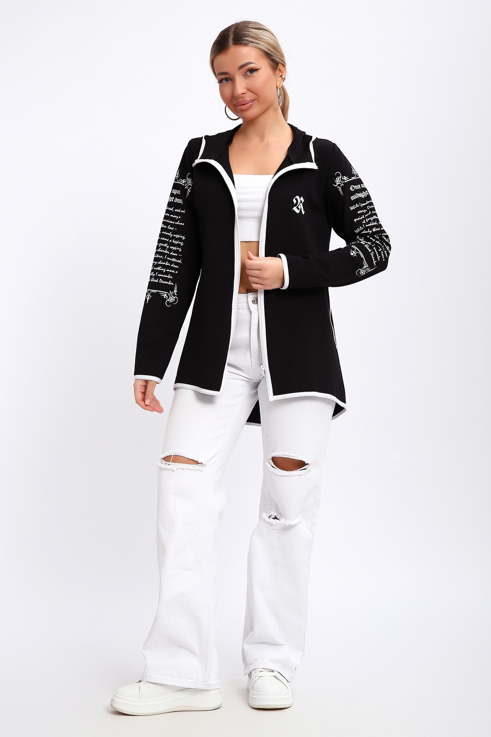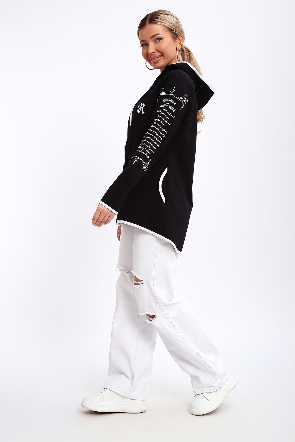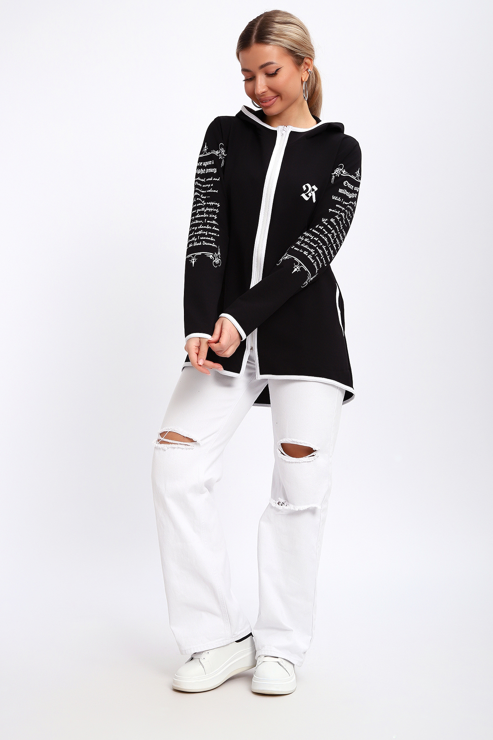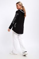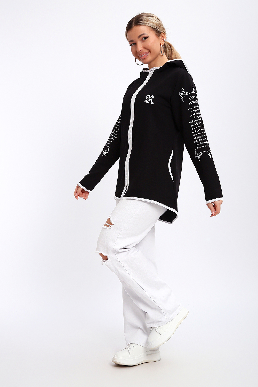 Туника необычного кроя на молнии, с капюшоном. Рукава длинные без манжетов, спинка длиннее переда. Карманы, рукава, капюшон и низ изделия обработан отделочной тканью. Принт на рукавах и полочке. Идеальное решение для прогулок, спорта или повседневного использования. Туника станет незаменимым элементом вашего гардероба.