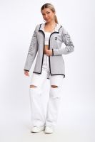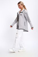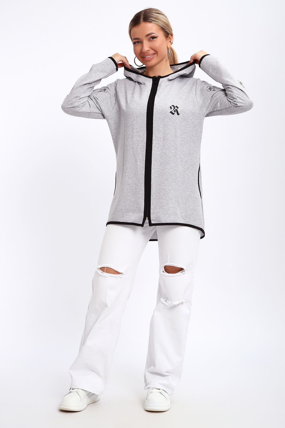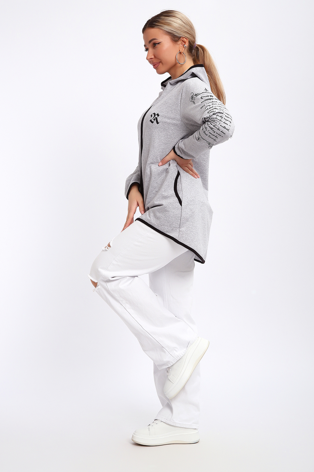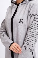 Туника необычного кроя на молнии, с капюшоном. Рукава длинные без манжетов, спинка длиннее переда. Карманы, рукава, капюшон и низ изделия обработан отделочной тканью. Принт на рукавах и полочке. Идеальное решение для прогулок, спорта или повседневного использования. Туника станет незаменимым элементом вашего гардероба.