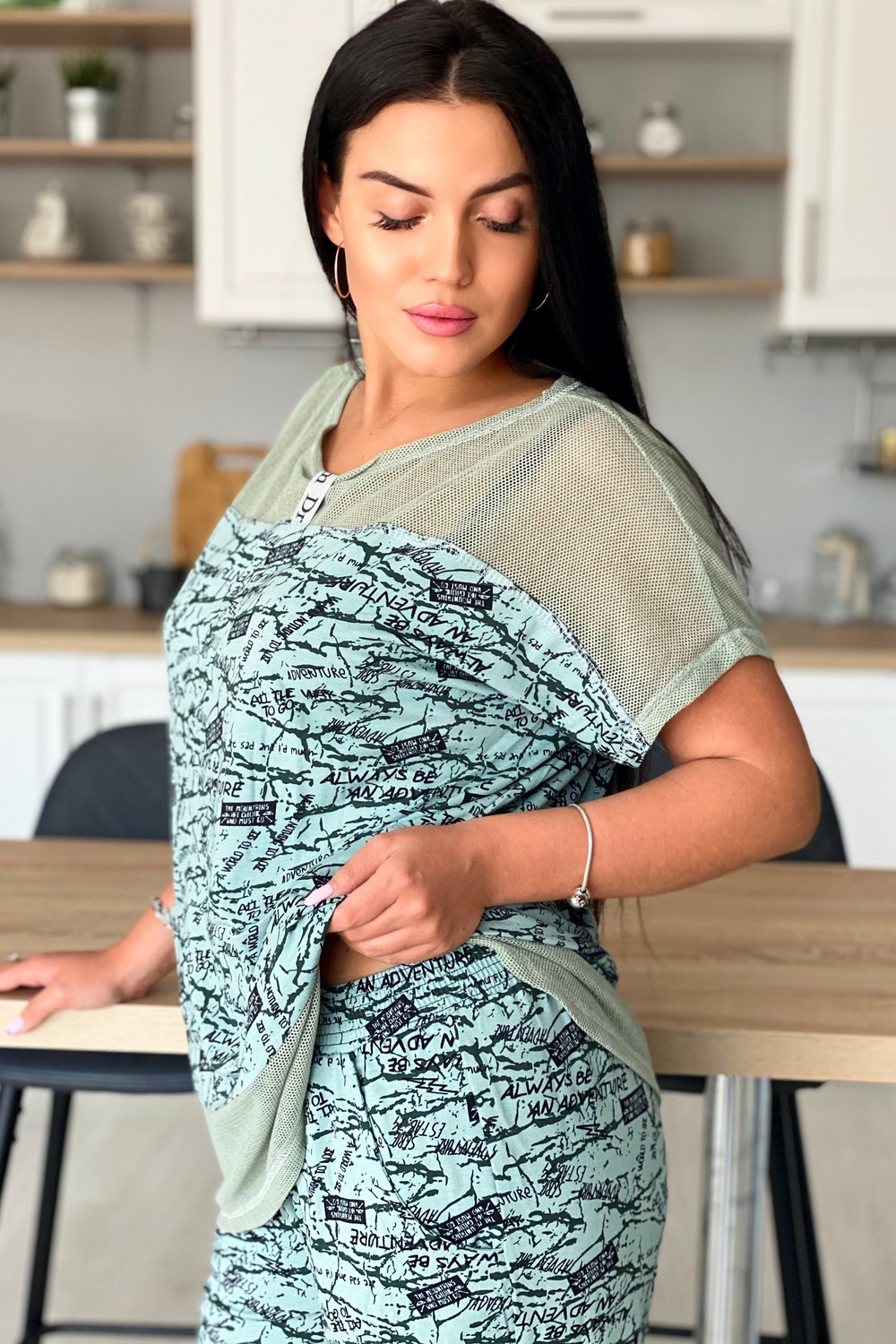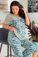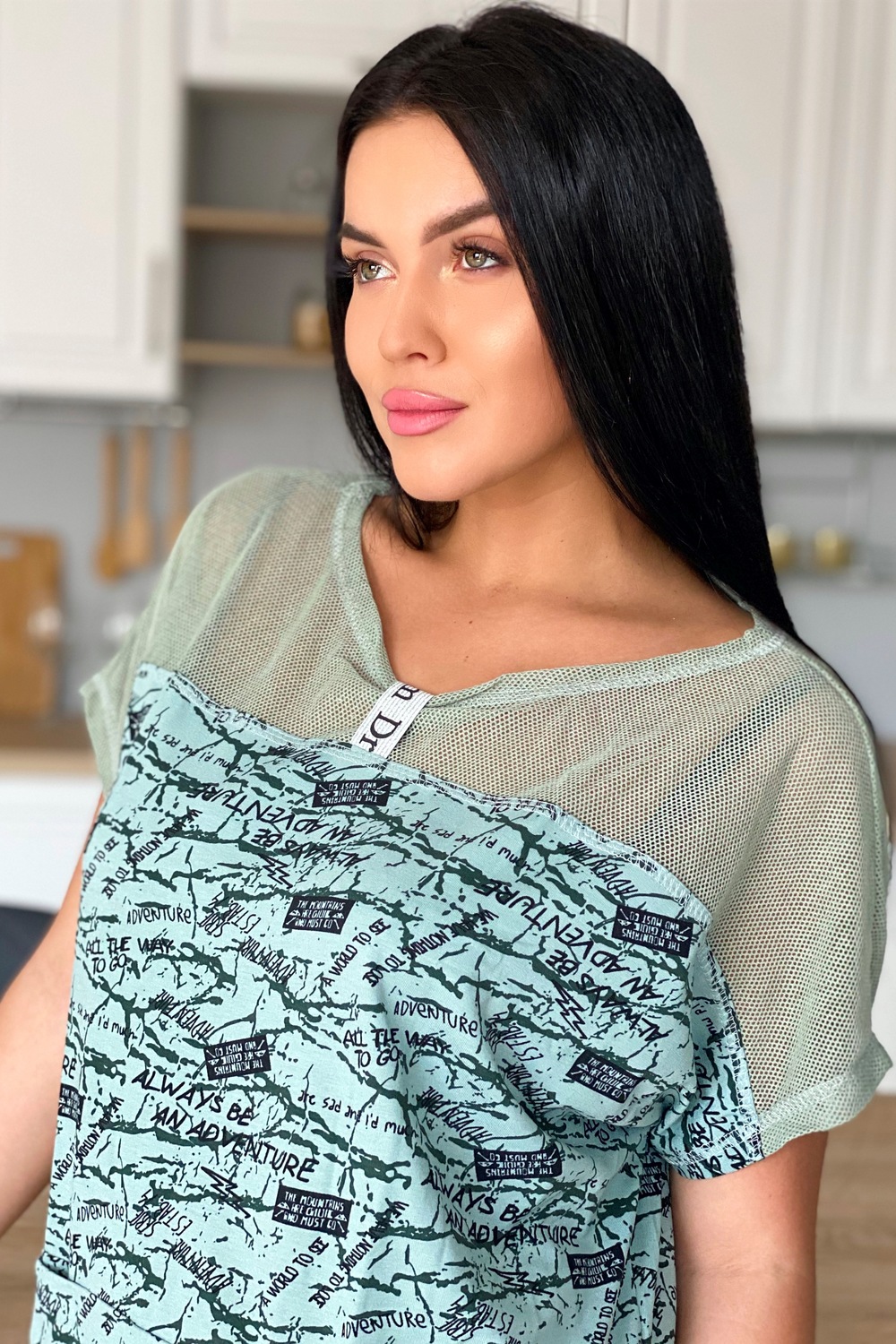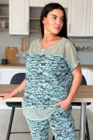 Туника женская прямого силуэта. Рукав цельнокроенный. Кокетка полочки и спинки, низ туники из оливковой хлопковой сетки. В среднем горизонтальном шве полочки два внутренних удобных кармана. В центре кокетка полочки собрана на серебряную тесьму.