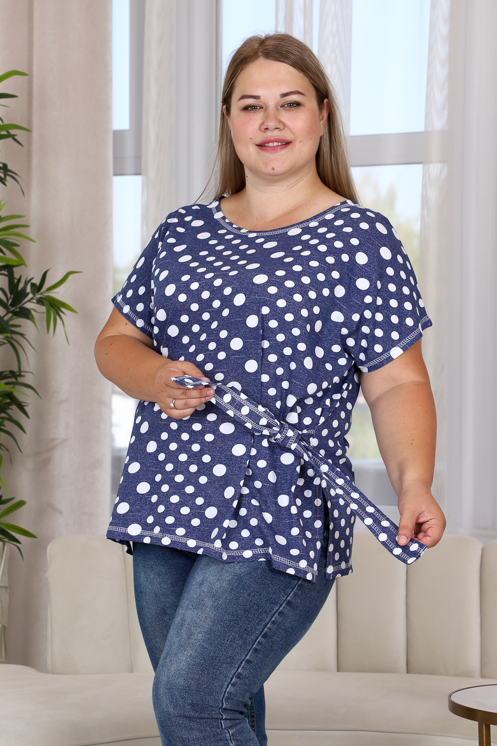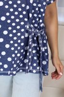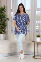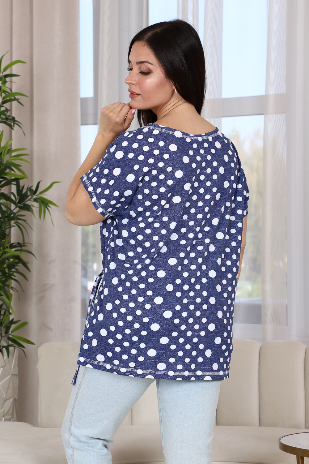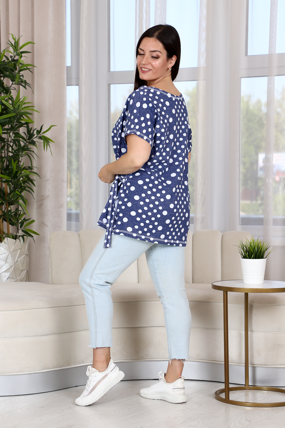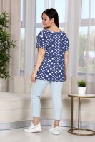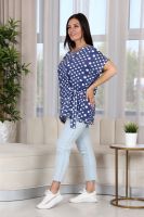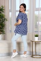 Туника женская, прямого силуэта. Рукав короткий цельнокроенный. Низ изделия регулируется двумя завязками, по боковым швам разрезы