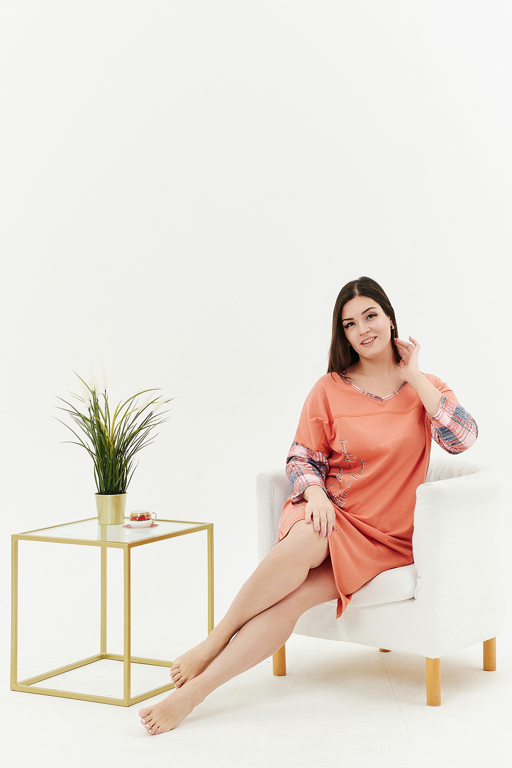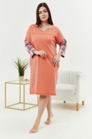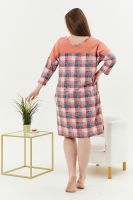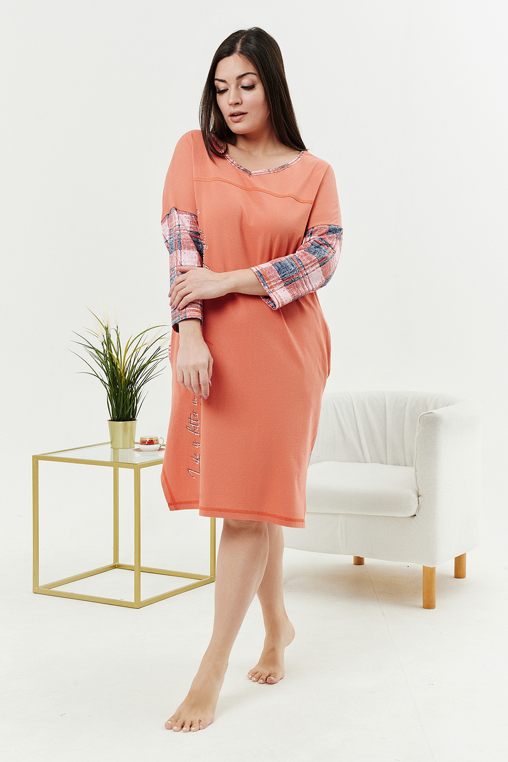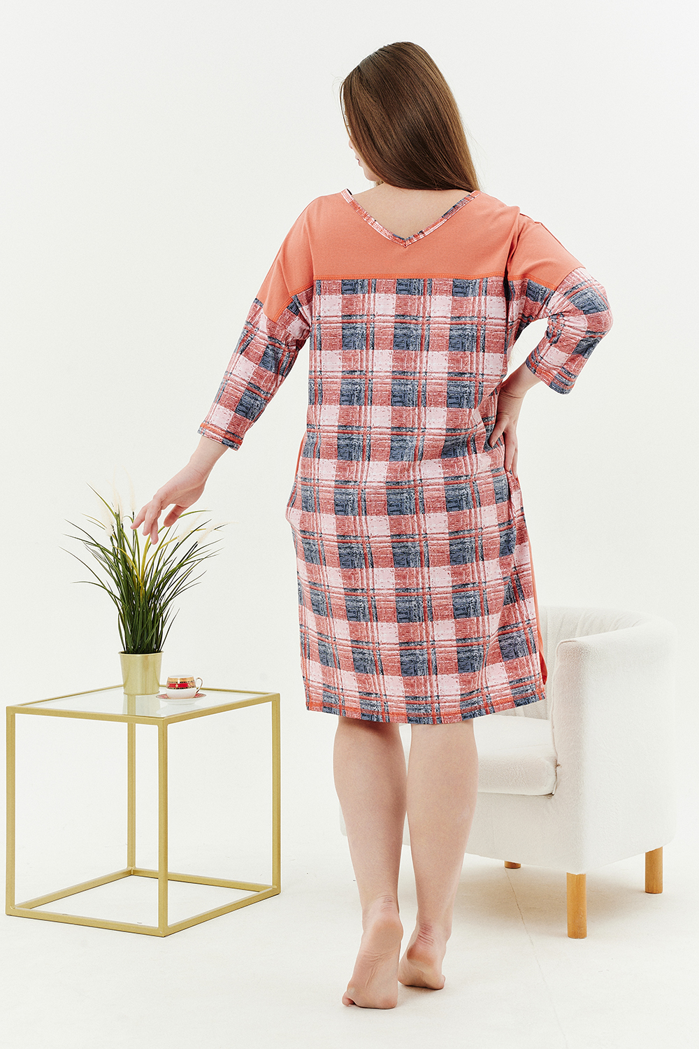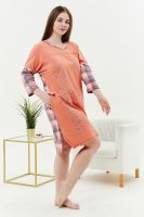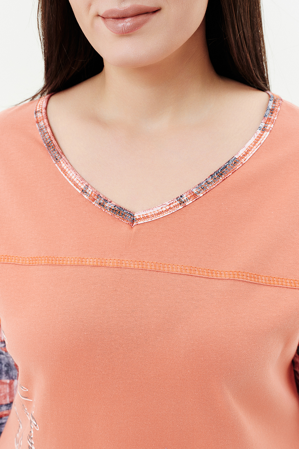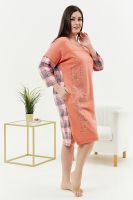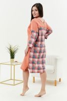 Туника женская, слегка расширенная к низу. Вырез на полочке и спинке Y-образный. Рукав цельнокроенный со швом. В боковых швах внутренние карманы. Кокетки на полочке и спинке. В тунике хорошо сочетаются ткани-компаньоны: однотонный персик и клетка. На полочке стильный принт.