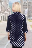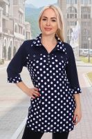 Туника прямого покроя, 3/4 рукав на манжете, отложной воротник, закругленный низ. На передней полочке из однотонной ткани клапаны, которые украшены декоративными пуговицами.