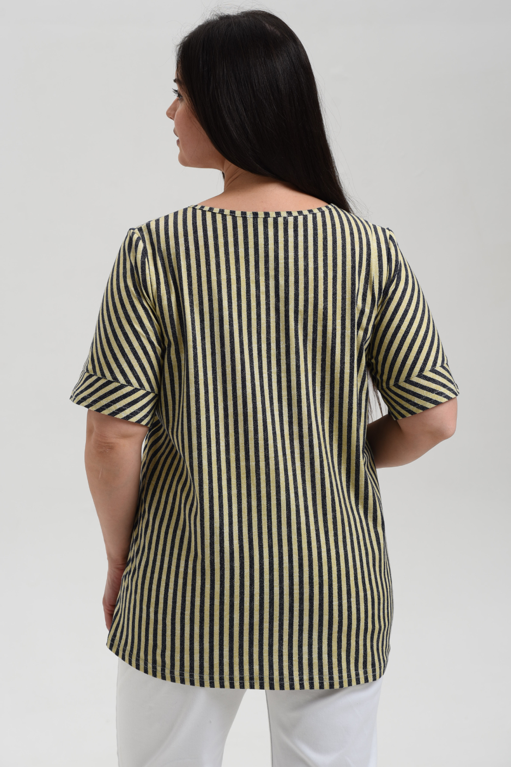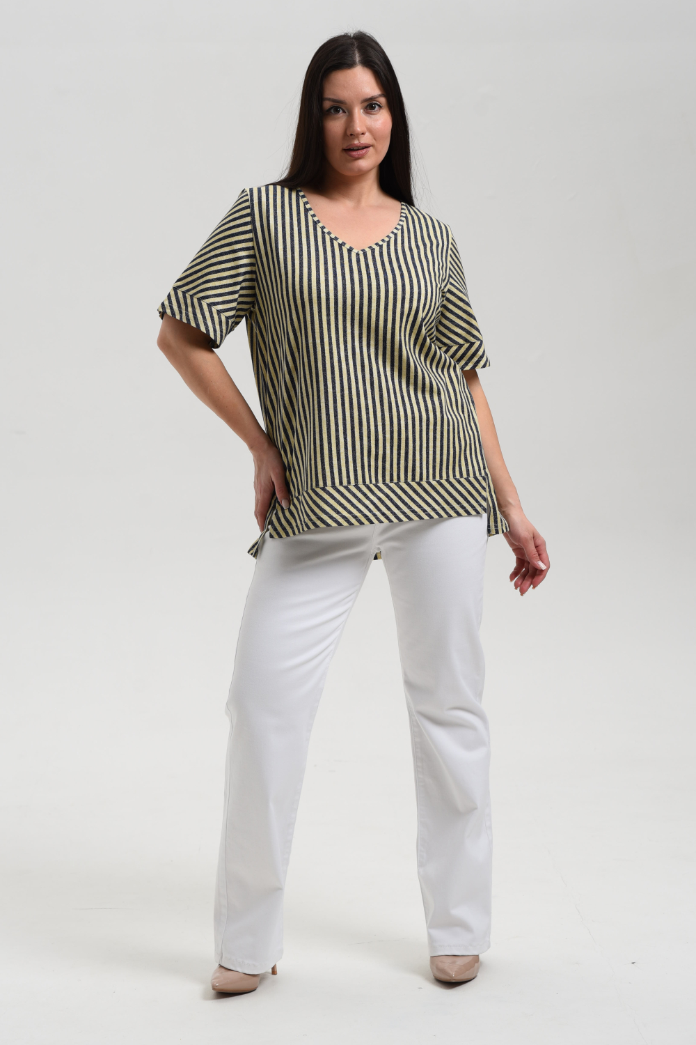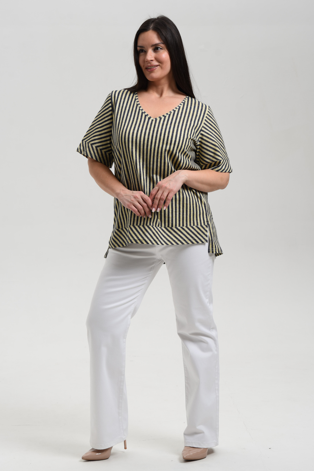 Туника прямого силуэта, с V-образной горловиной, с фигурной линией низа, длиной до середины бедра. Рукав втачной, короткий, с манжетом. В нижей части боковых швов обработаны разрезы. Горловина обработана бейкой из основного полотна.