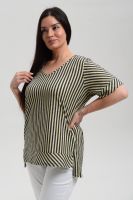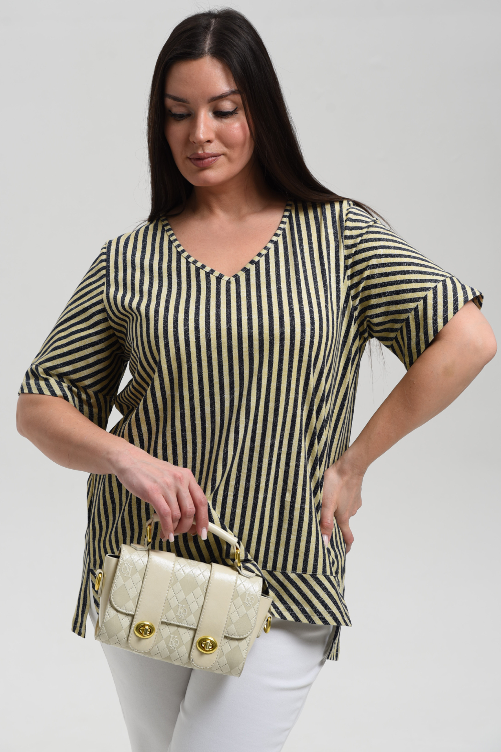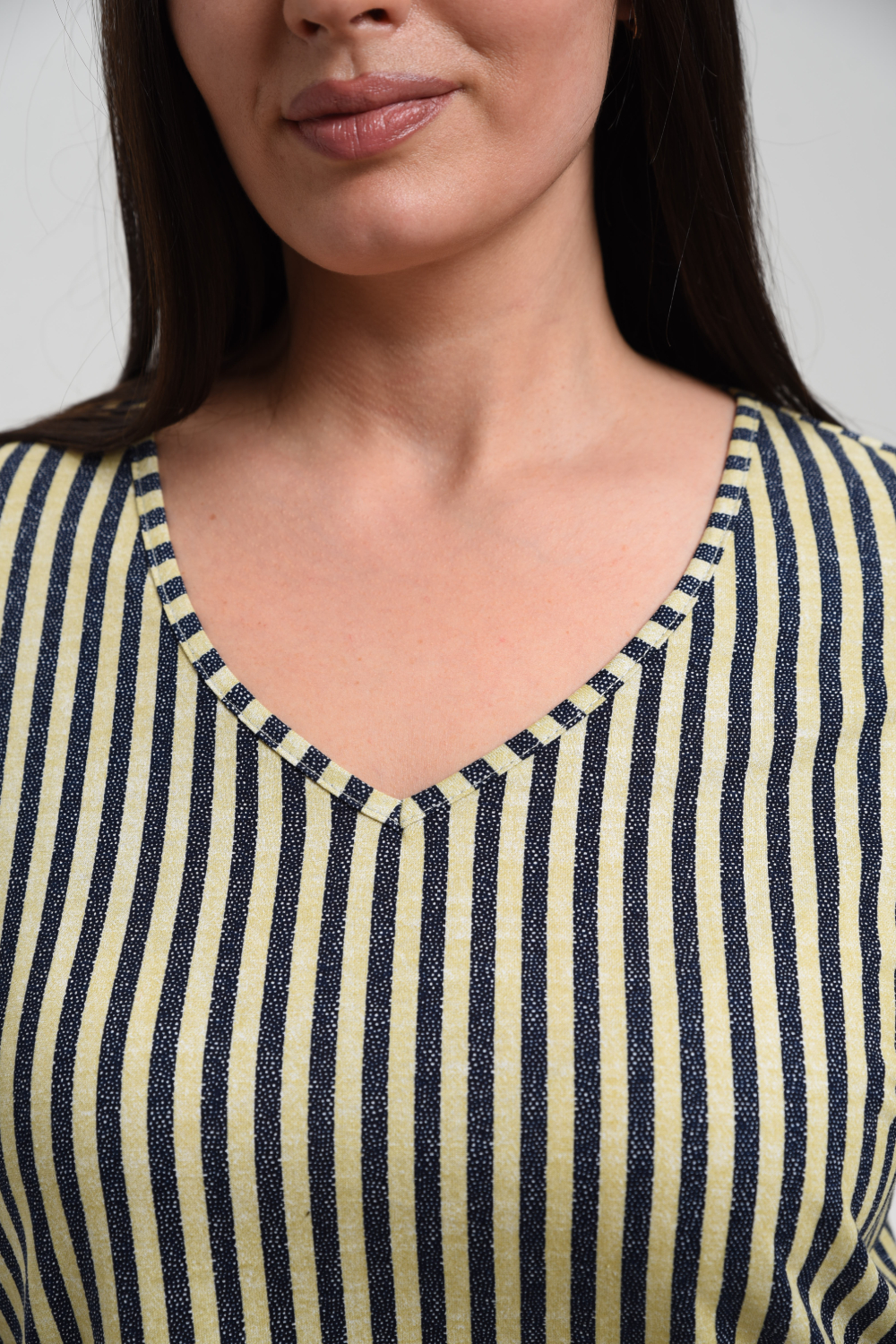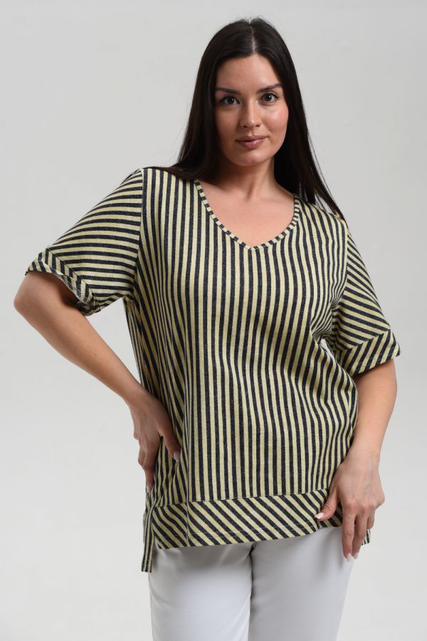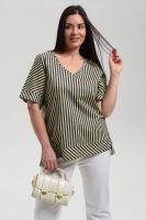 Туника прямого силуэта, с V-образной горловиной, с фигурной линией низа, длиной до середины бедра. Рукав втачной, короткий, с манжетом. В нижей части боковых швов обработаны разрезы. Горловина обработана бейкой из основного полотна.