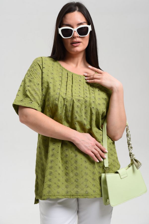 Туника прямая, свободная, с округлой горловиной, с удлиненной спинкой. Рукав короткий, с манжетом. В верхней части полочки обработаны декоративные защипы. Спинка с кокеткой. В нижней части боковых швов расположены разрезы. Горловина обработана бейкой из основного полотна.