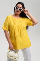 Туника прямая, свободная, с округлой горловиной, с удлиненной спинкой. Рукав короткий, с манжетом. В верхней части полочки обработаны декоративные защипы. Спинка с кокеткой. В нижней части боковых швов расположены разрезы. Горловина обработана бейкой из основного полотна.