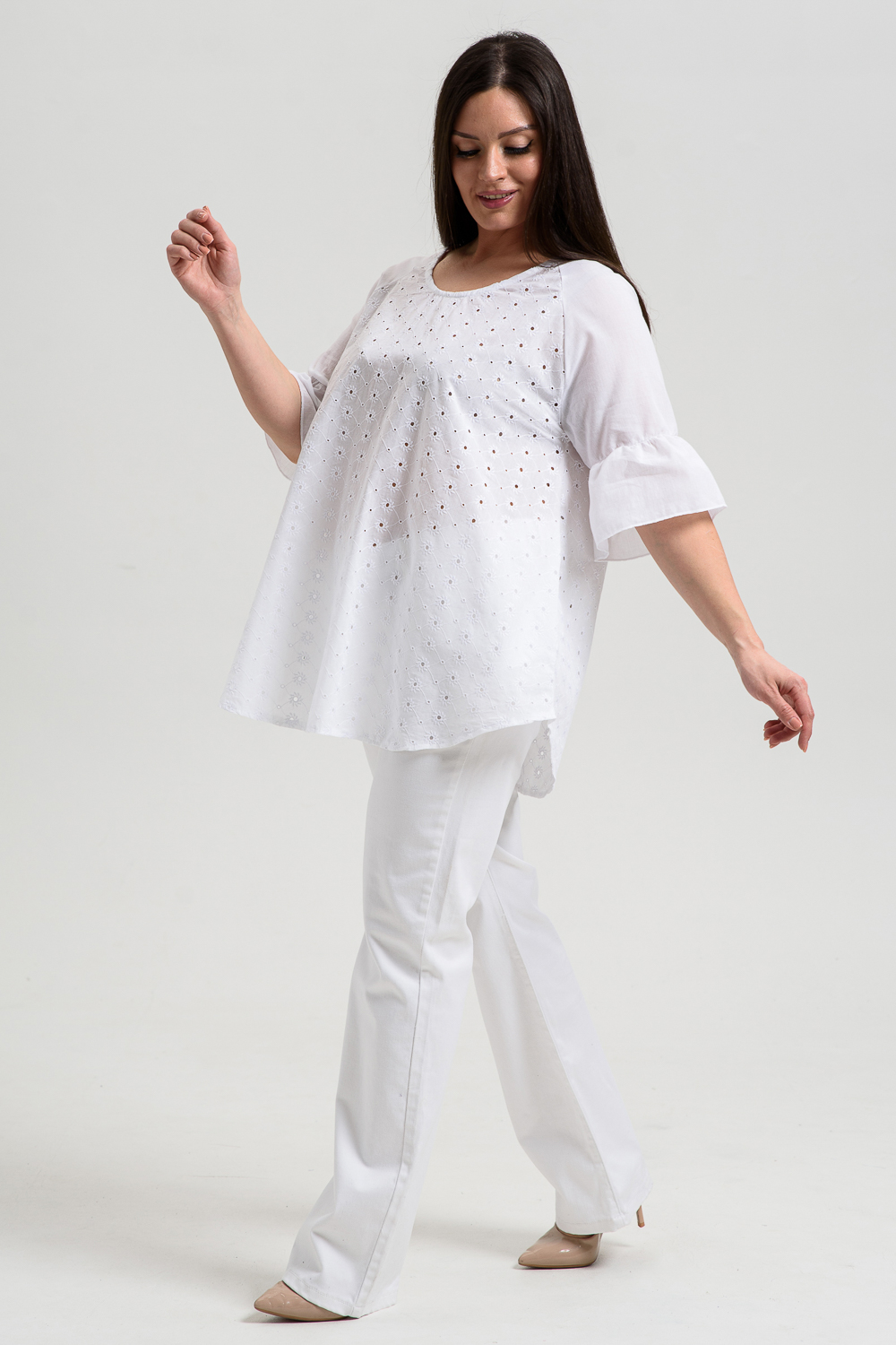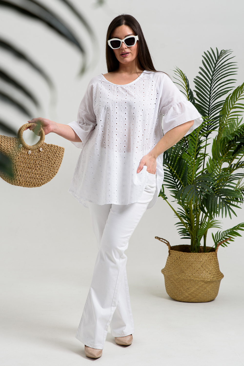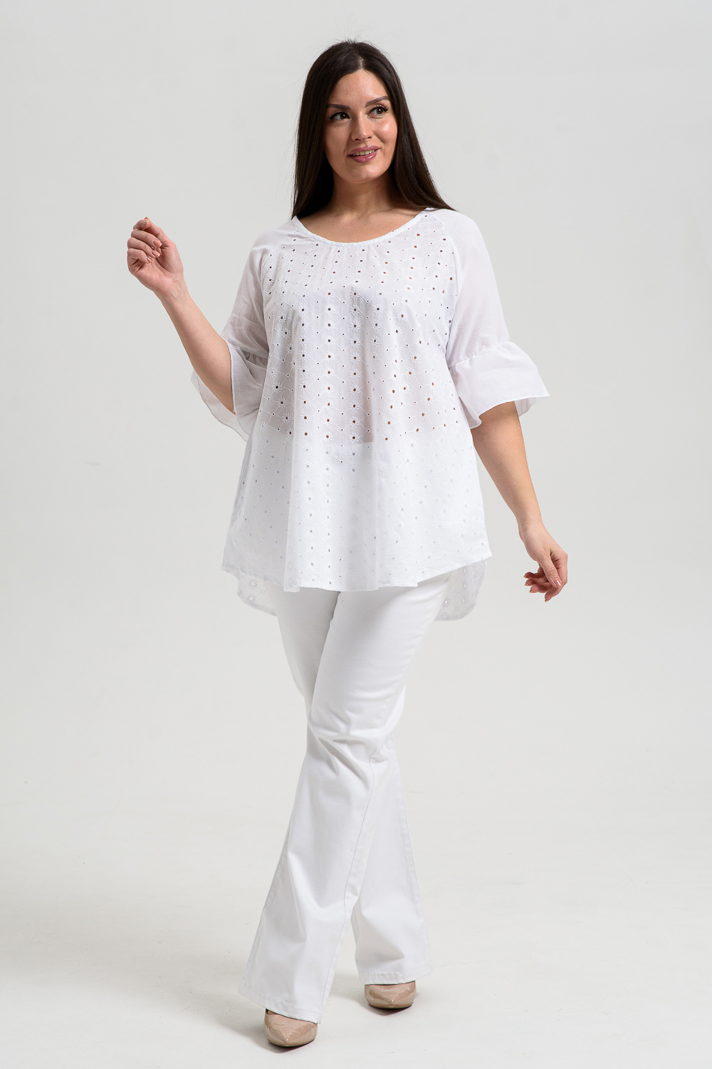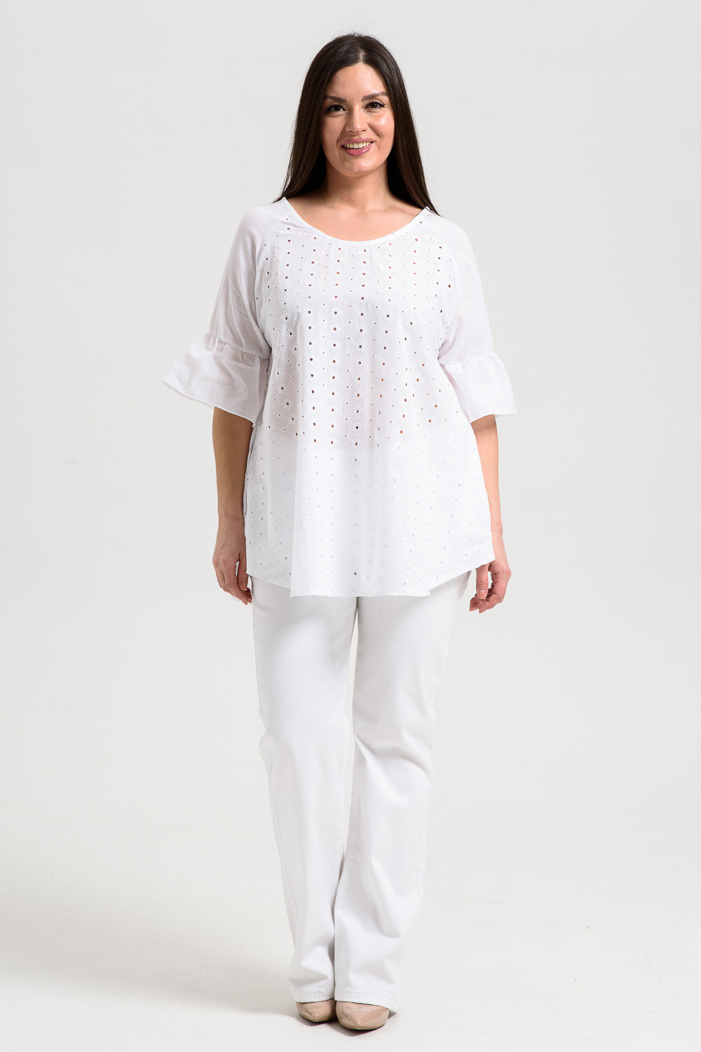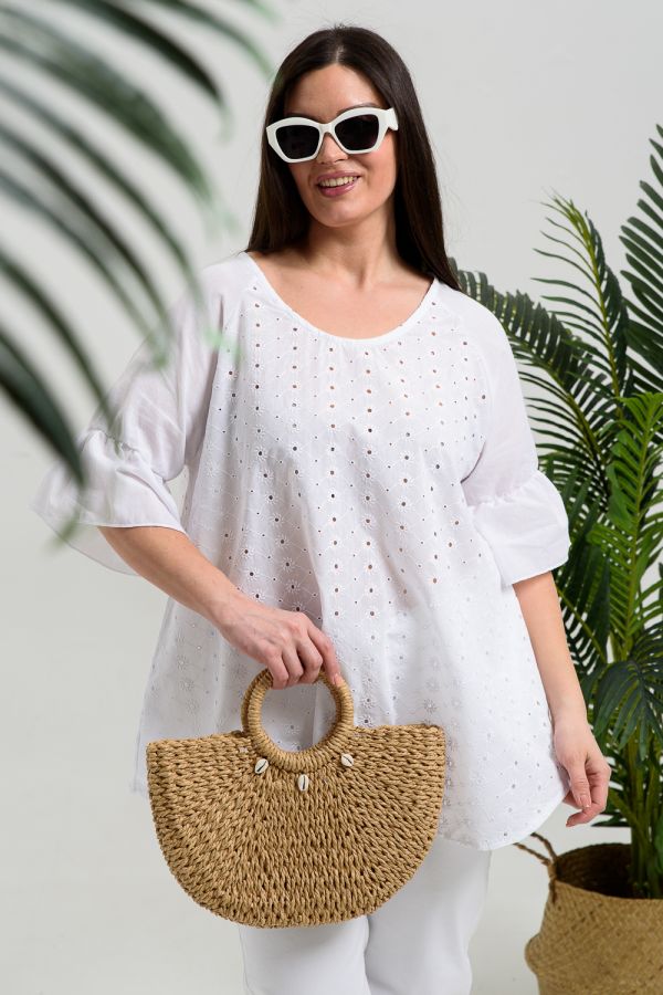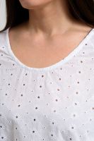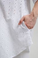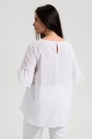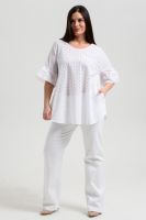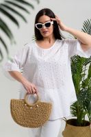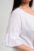 Туника женская, расширенная к низу. Горловина округлая. Рукав реглан, внизу рукава широкая рюша. Низ туники фигурный, в боковых швах внутренние карманы. Свободная, легкая, не стесняющая движений туника незаменима для летнего гардероба любой женщины.