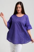 Туника женская, расширенная к низу. Горловина округлая. Рукав реглан, внизу рукава широкая рюша. Низ туники фигурный, в боковых швах внутренние карманы. Свободная, легкая, не стесняющая движений туника незаменима для летнего гардероба любой женщины.