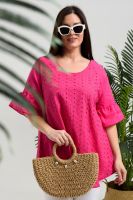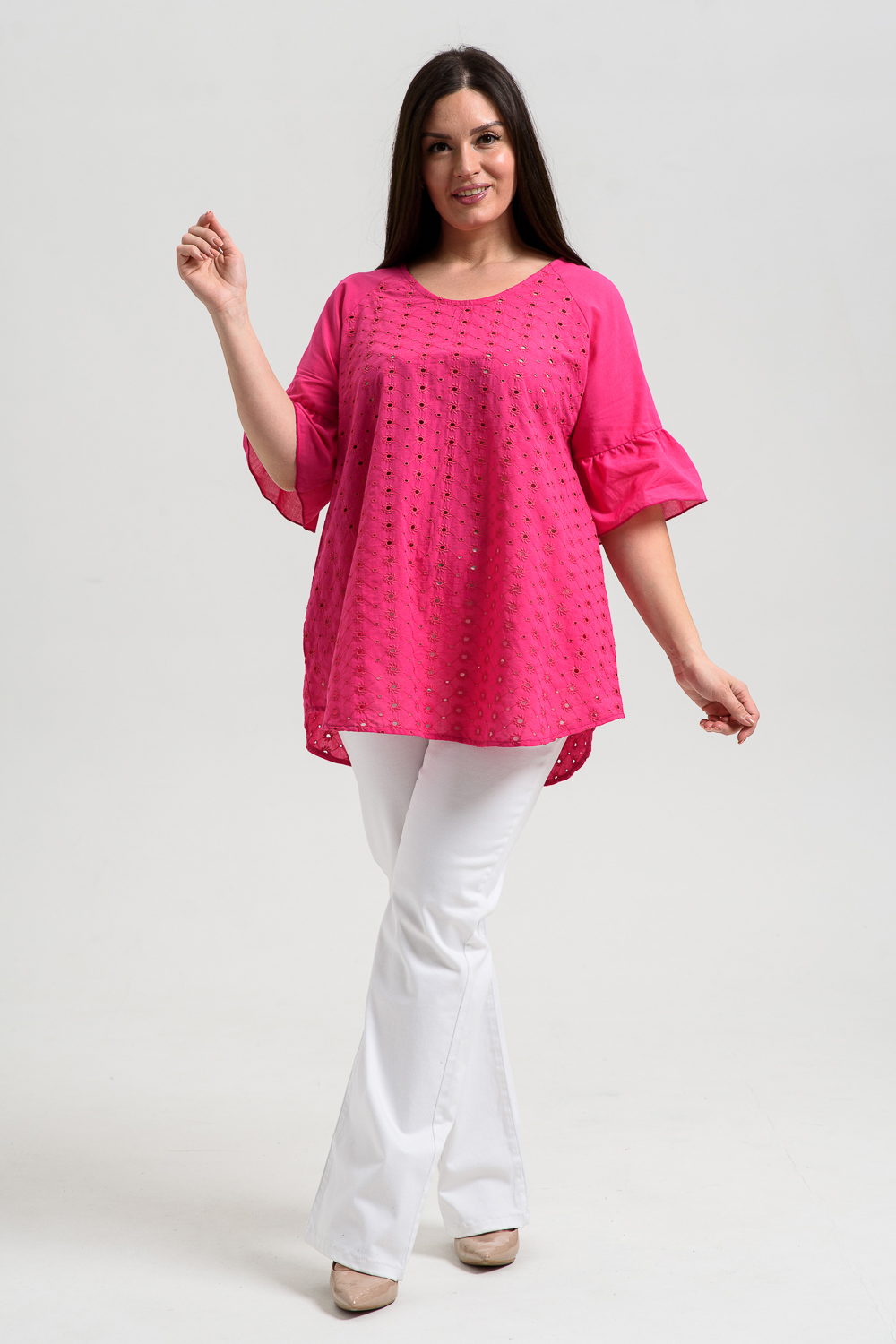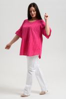 Туника женская, расширенная к низу. Горловина округлая. Рукав реглан, внизу рукава широкая рюша. Низ туники фигурный, в боковых швах внутренние карманы. Свободная, легкая, не стесняющая движений туника незаменима для летнего гардероба любой женщины.