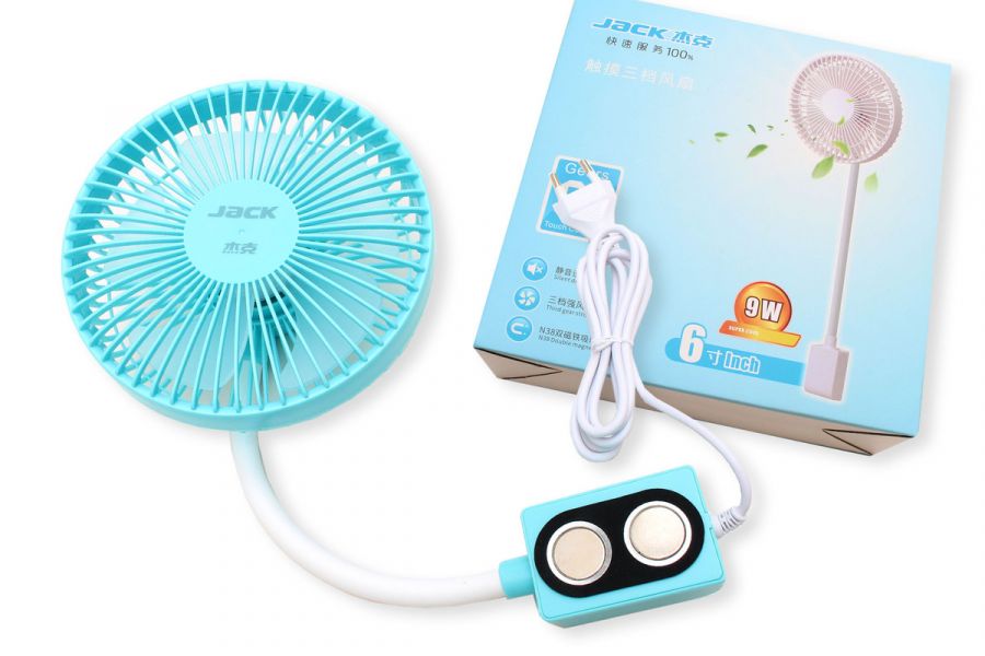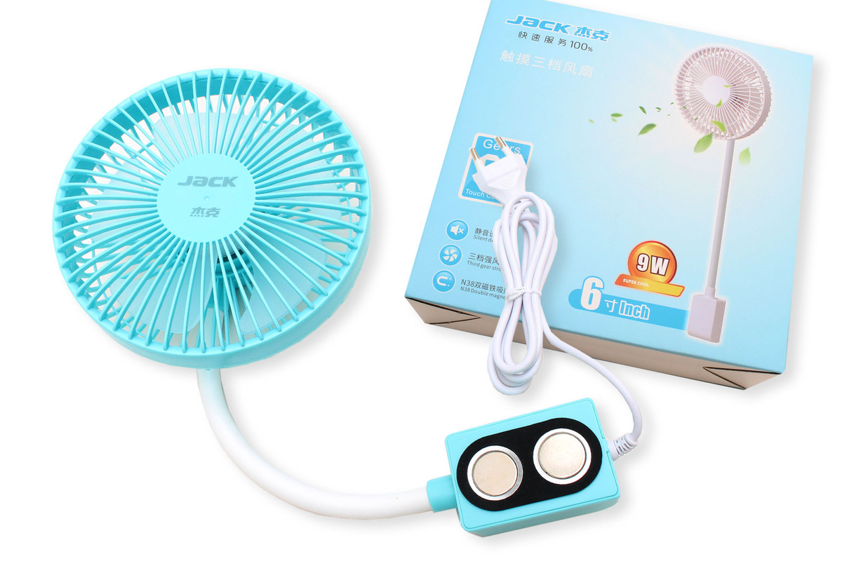 Портативный настольный вентилятор на гибкой ножке с удобным и надежным креплением на два магнита, оснащен защитной силиконовой накладкой. Три режима мощности (макс. 9 Вт). Подключается к стандартной сети питания. Обеспечивает естественный и приятный обдув за счет пяти лопастей, работает бесшумно. На корпусе расположена сенсорная кнопка управления. Вентилятор имеет съемную решетку, что позволяет легко его чистить. Макс. скорость: 3000 об./мин.