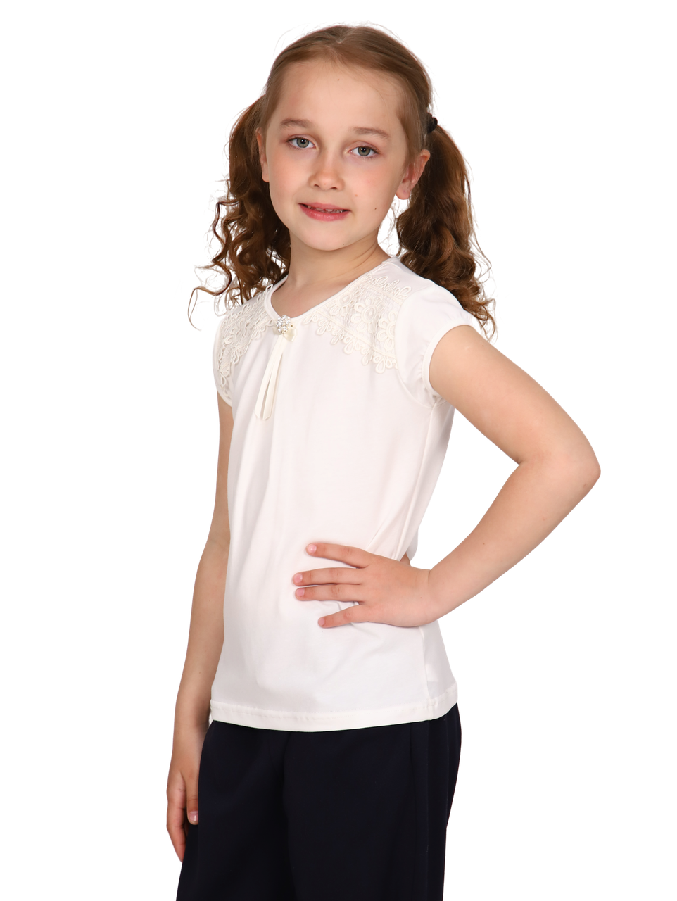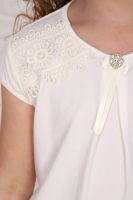 Базовая школьная блузка для девочек с коротким рукавом. Нарядная блузка станет основой как повседневного, так и праздничного образа. Мягкое кружево придает модели нежности. Спереди прикреплен съемный декоративный элемент из атласных лент и броши. Модель составит одинаково удачный комплект и с юбкой, и с брюками. Блузка сшита из качественного трикотажа, используемый материал не теряет форму после многократных стирок, мягкий и приятный к телу, устойчив к износу. Для сохранения первоначальных свойств изделия, важно соблюдать рекомендации по уходу.