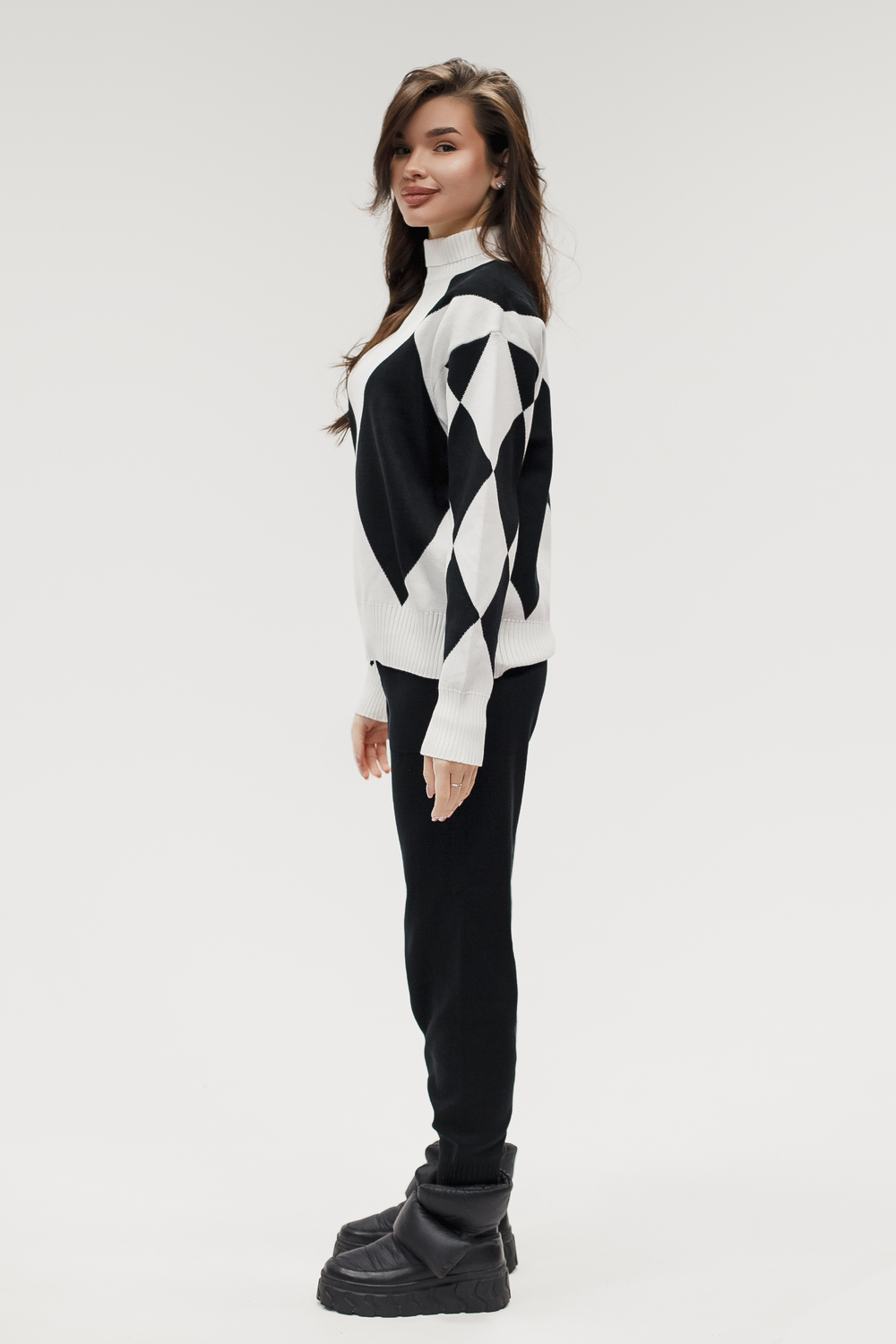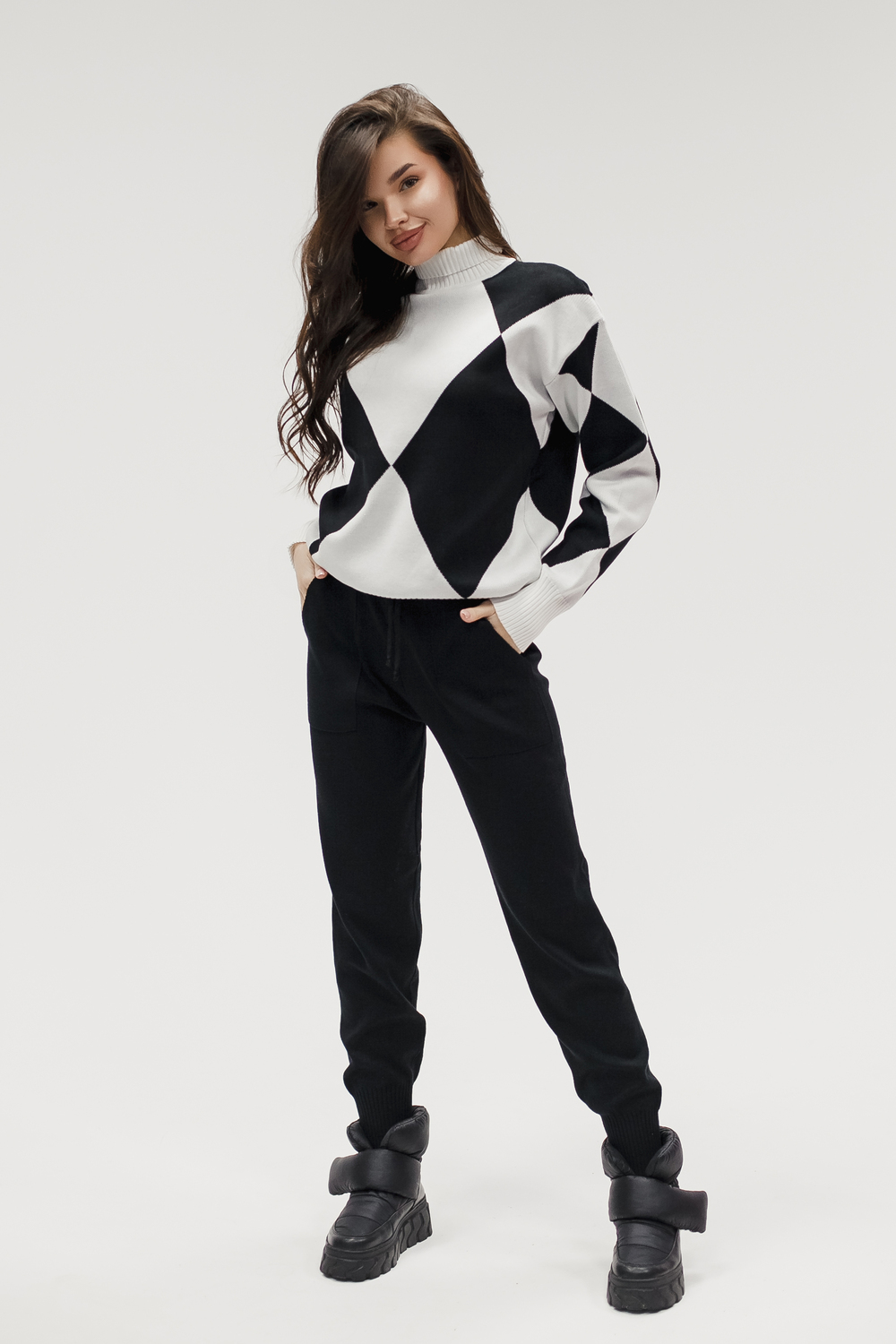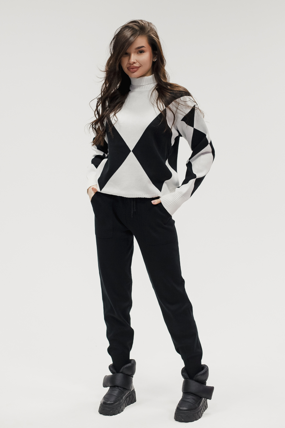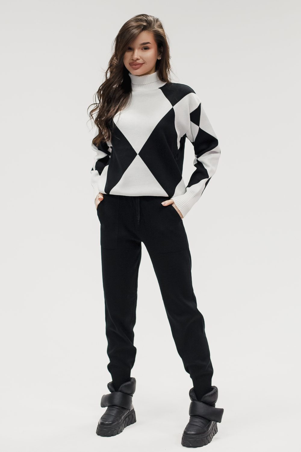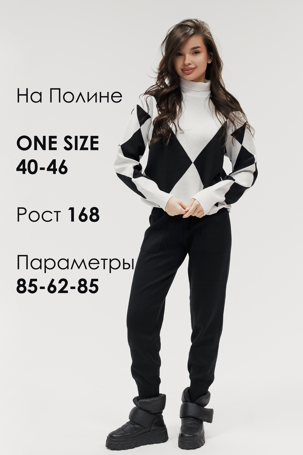 Этот тёплый женский вязаный костюм — гармоничный комплект из свитера и брюк, выполненный из плотной, мягкой и эластичной пряжи (состав: 30% хлопок, 40% вискоза, 30% полиэстер), который надёжно сохраняет тепло и при этом приятно прилегает к телу. Свитер свободногос аккуратной воротниковой стойкой средней высоты визуально стройнит и обеспечивает дополнительную защиту от холода, манжеты и нижняя кромка обработаны резинкой для лучшей посадки и сохранения формы. Плечи оформлены со скосом или лёгким «полупритёком» для комфортной посадки на фигуры разных типов; брюки средней посадки с эластичным поясом и внутренней мягкой тесьмой или шнурком обеспечивают индивидуальную регулировку, прямой или слегка зауженный книзу силуэт свободно сидит по бедру и книзу, благодаря эластичности материала изделие «тянется» и адаптируется под параметры от 40 до 46 размера и комфортно смотрится на росте до 160 см, при этом посадка и длина оптимизированы под невысокий рост — брюки не требуют сильной подшивки, а длина пуловера рассчитана так, чтобы сочетаться с верхней одеждой; в дизайне предусмотрены функциональные детали: скрытые боковые или накладные карманы в брюках, аккуратные декоративные швы или узорная вязка на передней части пуловера, что добавляет текстуре и визуального интереса, при этом декоративность не мешает повседневному использованию; палитра — нейтральные базовые оттенки (беж, серый, графит, тёмно-синий) и несколько насыщенных цветовых акцентов (бордо, изумруд, горчичный), которые легко сочетаются с верхней одеждой и аксессуарами; материал и плотная вязка делают костюм универсальным для осенне-зимнего периода и прохладной весны — он отлично подойдёт как для прогулок и поездок, так и для уютных домашних вечеров или неофициальных встреч; уход: рекомендована деликатная стирка руками или в машине на щадящем режиме при температуре не выше 30°C, сушить в расправленном виде на горизонтальной поверхности, не отбеливать, при необходимости возможна бережная химчистка; благодаря продуманной посадке и использованию качественной пряжи комплект сохраняет форму и внешний вид даже при регулярной носке, подчёркивает женственность без лишней вычурности и станет практичным элементом гардероба тех, кто ценит комфорт, тепло и стиль.