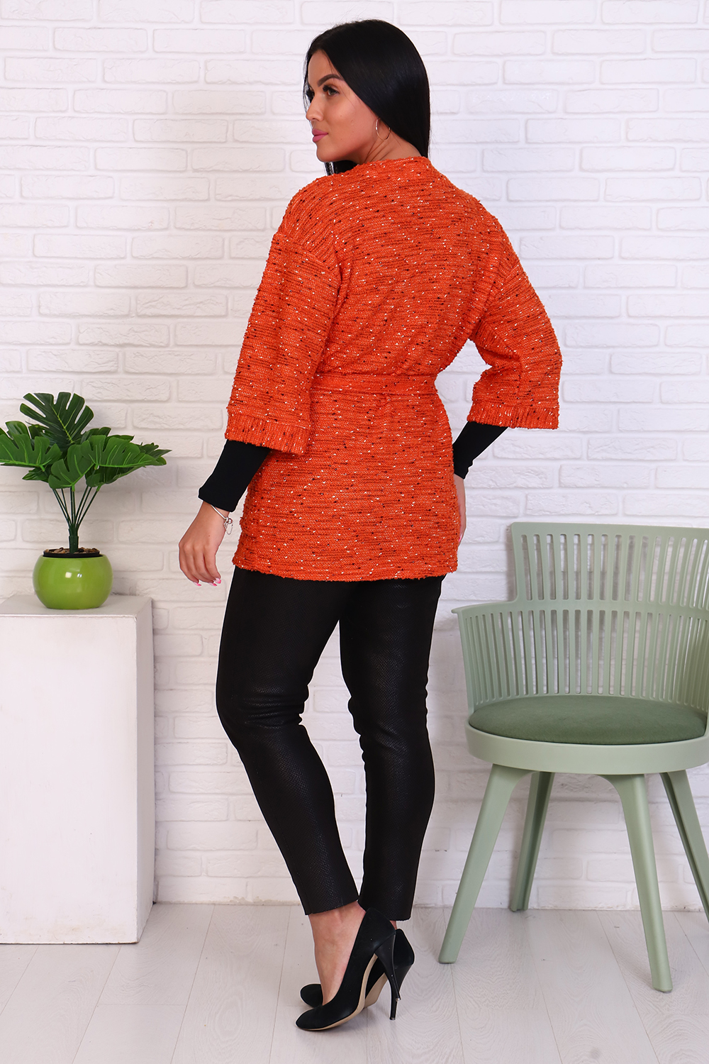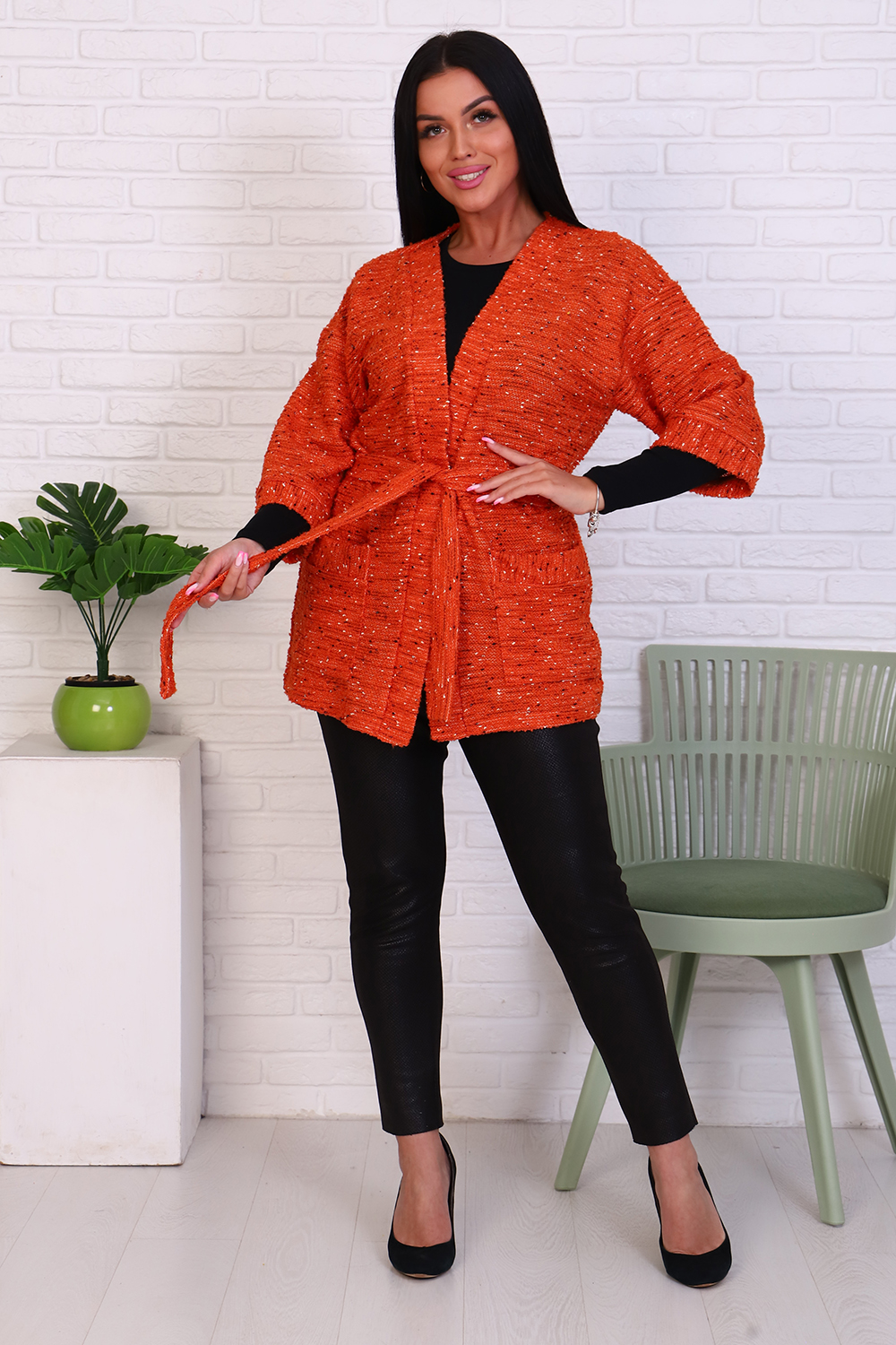 Стильный жакет из мягкого трикотажа БУКЛЕ с цветными вкраплениями. Модель свободного кроя с глубоким вырезом, передние полочки, накладные карманы и рукав гармонично оформлены широкой планкой, его можно носить как с поясом? так и без него. Жакет - это незаменимая вещь в гардеробе каждой современной девушки. Его простой крой, необычный, универсальный дизайн и удобный фасон не обойдут ни одну модницу стороной. Трикотаж БУКЛЕ приятный к телу, не колется.