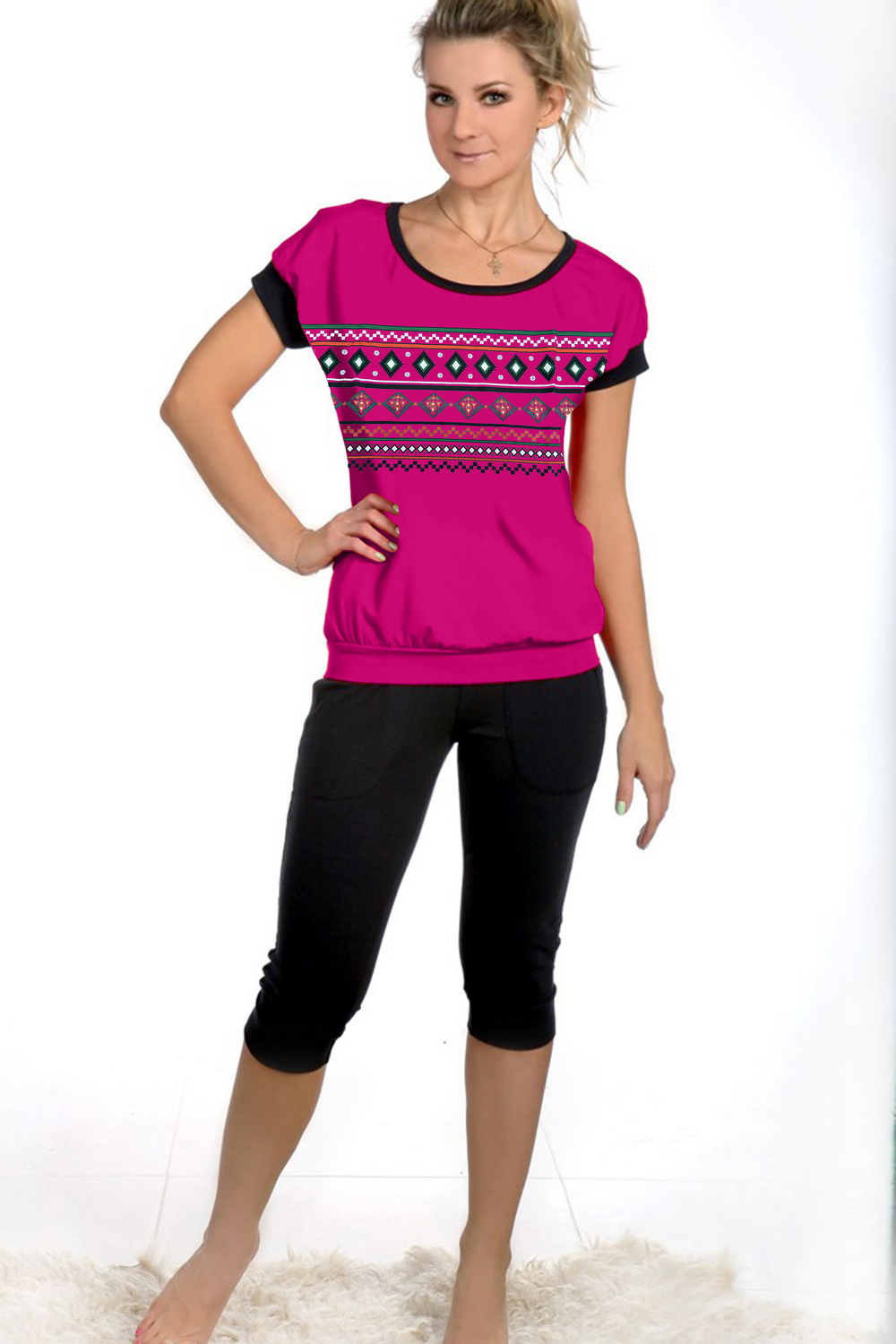 Женская пижама с бриджами и футболкой с коротким рукавом - идеальный баланс стиля и уюта. Модель выполнена из высококачественного кулирного волокна. Комфортный фасон и аккуратный дизайн