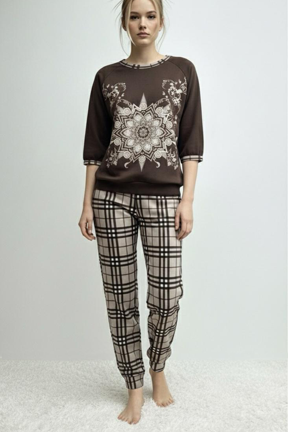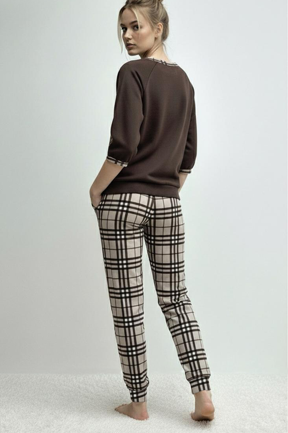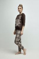 Уютный женский костюм с брюками и кофтой с рукавом 3/4 полуприлегающего кроя. Дизайн позволяет использовать данную модель как пижаму для сна, так и в качестве костюма для дома. Модель выполнена из высококачественного интерлока.