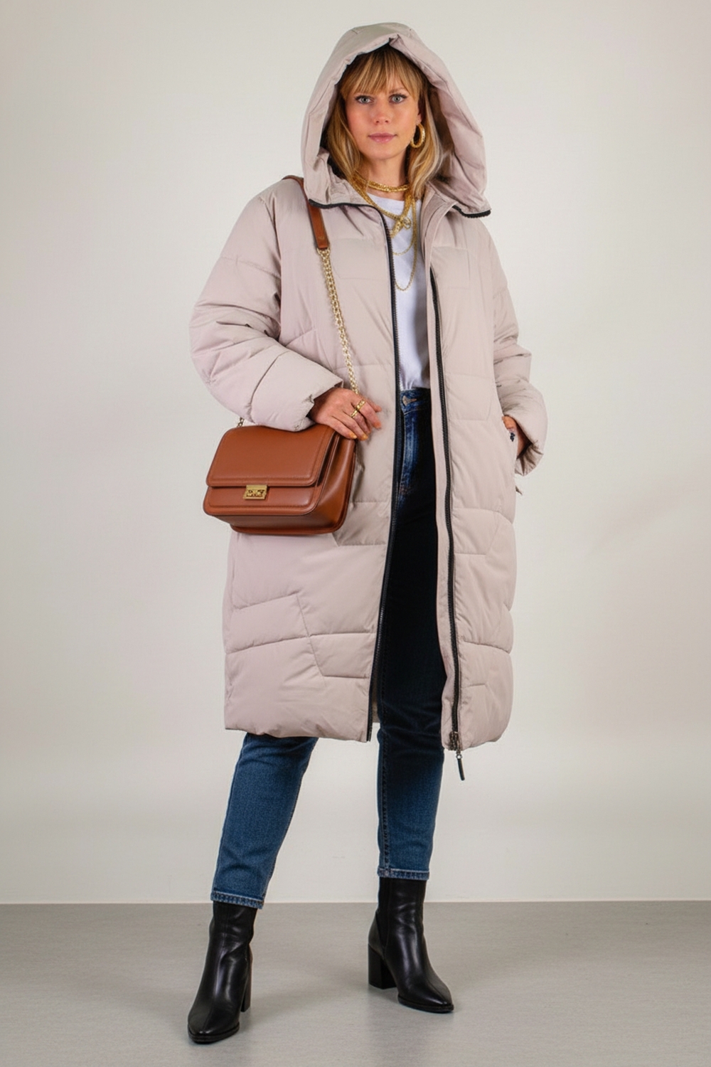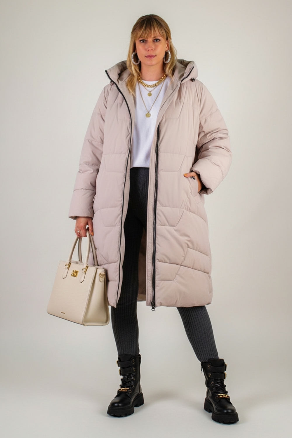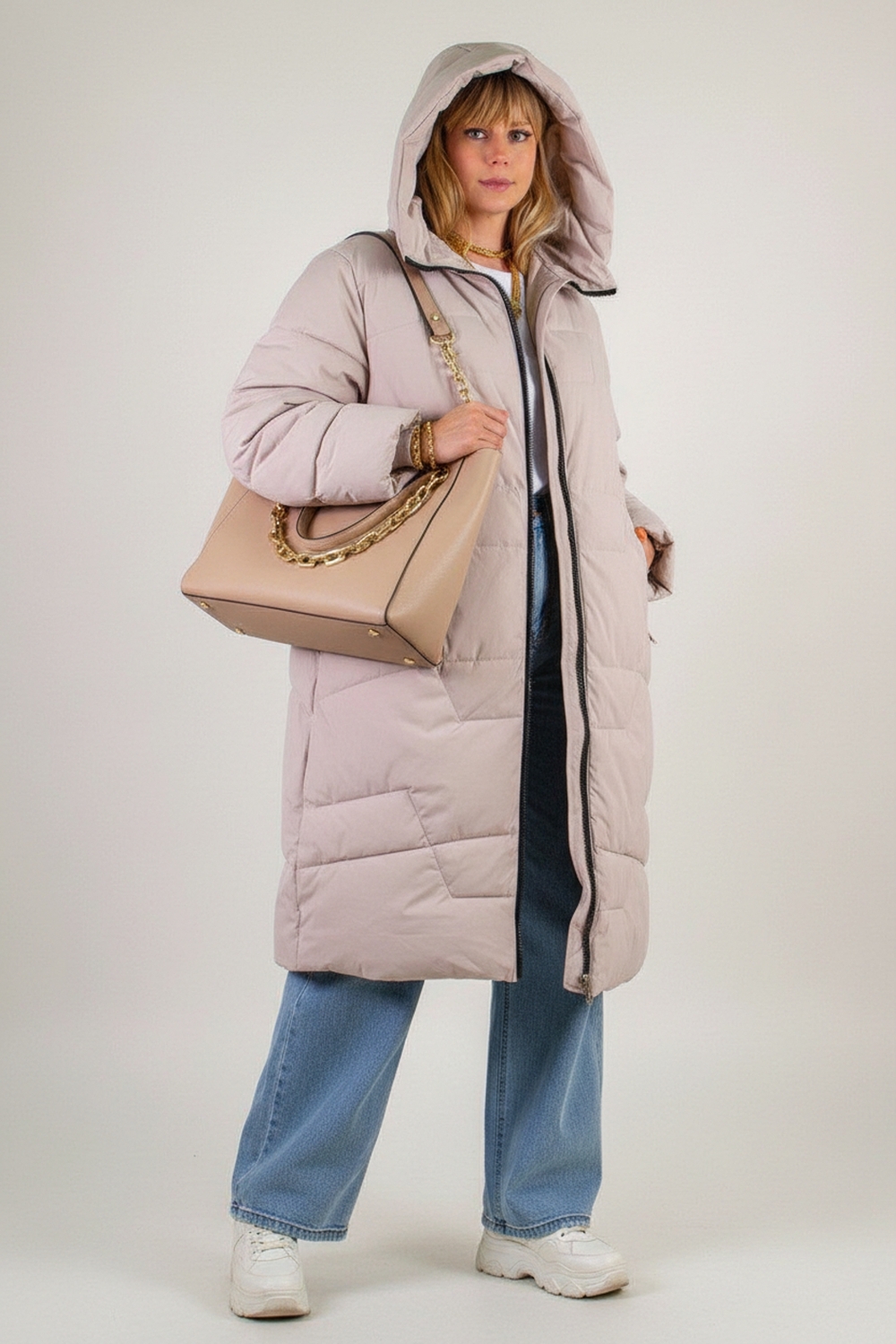 Зимняя куртка удлиненная, большие размеры арт. 6679-1 – это идеальное сочетание современного дизайна, продуманного комфорта и высокого качества материалов. Модель свободного кроя опускается чуть ниже колен, создавая стильный силуэт и надежно защищая от холодного ветра и снега. Матовая плотная ткань верхнего слоя отличается повышенной износостойкостью и водоотталкивающими свойствами, при этом выглядит благородно и не бликует на солнце. Ключевые преимущества модели: • Утеплитель синтетический «файбер» — легкий, гипоаллергенный и при этом сохраняет до 90 % тепла даже во влажном виде. • Абстрактный современный стежок – не ультрастеп, а дизайнерская простежка, обеспечивающая равномерное распределение утеплителя без «пустых» зон. • Капюшон с высокими фиксаторами и высокий воротник-стойка – надежная защита от ветра, не снимая капюшона можно регулировать объем и плотность прилегания. • Двусторонняя молния с внутренней ветрозащитной планкой – позволяет удобно садиться за руль автомобиля или в общественный транспорт, не стесняя движений. • Качественная фурнитура с неброскими стразами придает изделию легкий блеск и изящный акцент. • Рукава с трикотажными манжетами – исключают продувание, обеспечивают дополнительный барьер холода у запястий. • Глубокие боковые карманы и потайной внутренний кармашек – все самое необходимое всегда будет под рукой, телефоны и мелкие вещи надежно спрятаны и защищены. • Подкладка в тон ткани – приятная на ощупь, устойчивая к истиранию и деформации при стирке. Современный крой этой зимней куртки отлично смотрится с любым стилем – от casual и «спорт-шик» до городского smart-casual. В сочетании с высокими сапогами или грубыми ботинками она дополнит любой образ, а приглушенная цветовая гамма подчеркнет вашу утонченность. Легкость утеплителя и продуманная конструкция не утяжеляют изделие, обеспечивая свободу движений и комфорт при долгих прогулках. Зимняя куртка арт. 6679-1 – это выбор тех, кто ценит качество, тепло и стиль в одной вещи. Идеальный вариант для холодных дней, непогоды и переменчивого климата города. Обновите свой гардероб практичным и элегантным решением, которое прослужит не один сезон. На модели так же представлено: Женская туника арт. 1991