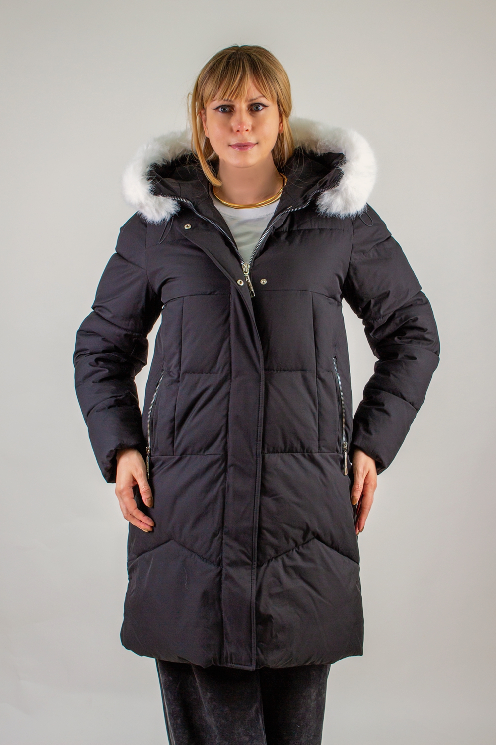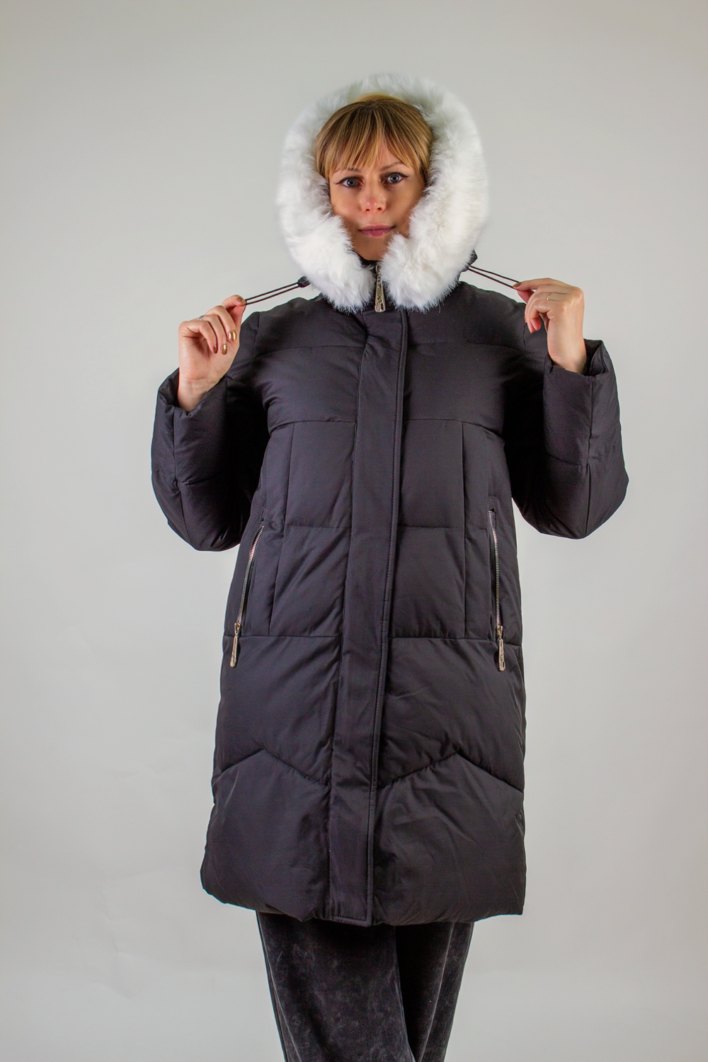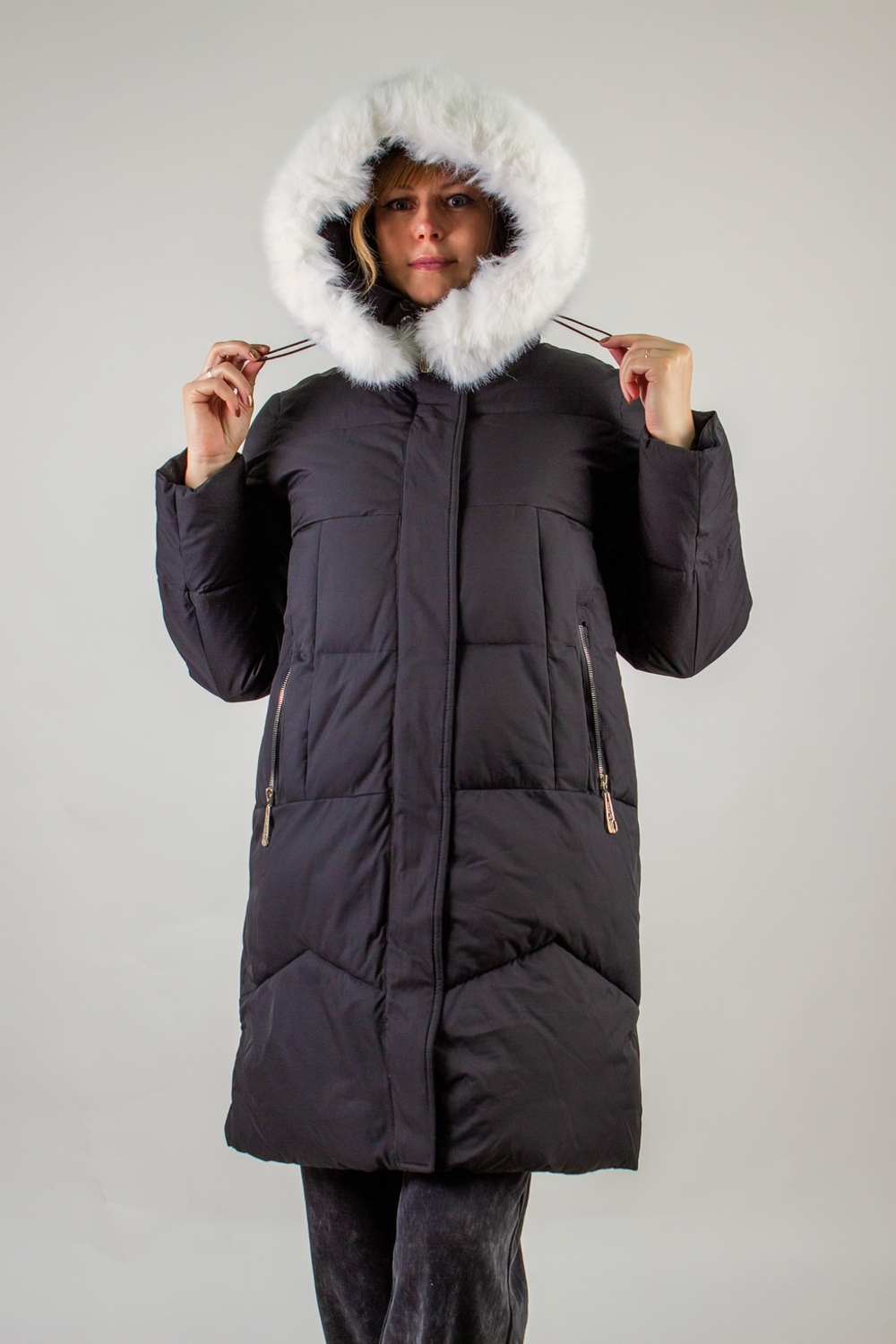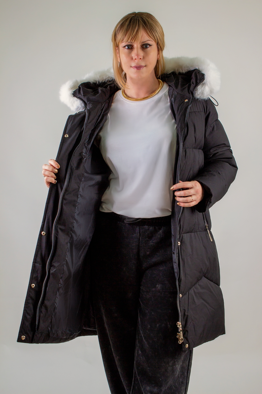 Зимняя удлинённая куртка-пальто арт. 28119-1 – идеальный выбор для тех, кто ценит комфорт, функциональность и элегантный внешний вид в холодное время года. Модель удлинена до колен, что обеспечивает дополнительную защиту от ветра и холода, а современный дизайн отлично впишется в любой городской образ. Капюшон с высоким воротником-стойкой на фиксаторах надежно удерживает тепло и защищает от непогоды. По контуру капюшона отстегивающаяся аккуратная опушка из качественного искусственного меха белого цвета – стильный и практичный элемент, который можно при желании отстегнуть. Куртка застегивается на двухзамковую молнию, дополненную планкой с кнопками, что гарантирует защиту от продувания и сохраняет тепло внутри. Утеплитель равномерно распределен по всей поверхности изделия благодаря современной стёжке-строчке: такой способ прошивки обеспечивает максимальную теплоизоляцию без «комков» и неутеплённых участков. Водоотталкивающая матовая ткань в чёрном оттенке защитит вас от снега и легкого дождя, сохраняя привлекательный внешний вид и не промокая. Функциональность модели подчеркнута двумя врезными боковыми карманами на молниях – они удобны для хранения мелочей и рук в холодные дни. Трикотажные рукава с манжетами плотно облегают запястье, не пропуская ветер и не создавая дискомфорта при активном движении. Внутренний карман позволит хранить ценные вещи в безопасности и под рукой. Качественный пошив, продуманная конструкция и надежная фурнитура делают эту куртку долговечной и практичной. Удобная посадка по фигуре не стесняет движений, а аккуратная стёжка добавляет изящества и визуально стройнит силуэт. Зимняя куртка-пальто арт. 28119-1 станет вашим надёжным спутником в холодные месяцы, сочетая в себе высокие эксплуатационные характеристики и утончённый стиль.