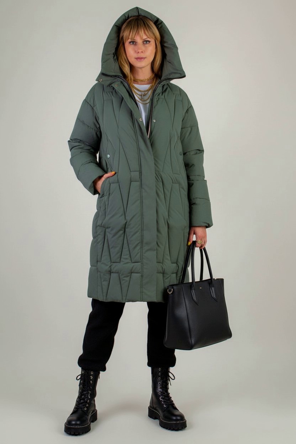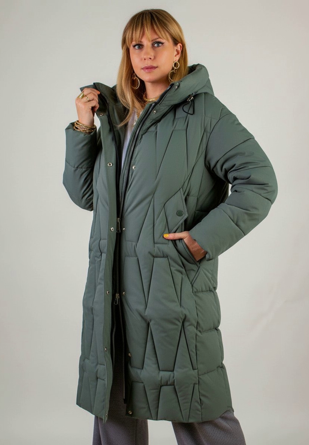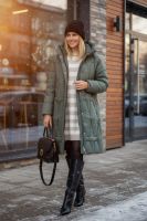 Зимняя куртка удлинённого кроя арт. 28117 с высоким воротником-стойкой и двусторонней молнией — это идеальное сочетание продуманного дизайна, максимально комфортной посадки и высоких технических характеристик, которые позволят вам с уверенностью встречать морозные дни. Модель ниже колен свободного силуэта незаметно сглаживает особенности фигуры, не ограничивая в движениях и обеспечивая непревзойдённый уют. Матовая ткань высокого качества отличается повышенной износостойкостью и стойкостью к влаге, сохраняя безупречный внешний вид при активном режиме носки. Утеплитель «файбер» — лёгкое синтетическое волокно нового поколения — сохраняет тепло, не впитывает влагу и быстро восстанавливает объём после сжатия. Куртка простёгана актуальным ромбовидным стежком, который обеспечивает равномерное распределение утеплителя и исключает образование холодных зон. Эластичные манжеты на рукавах надёжно удерживают тепло и не позволяют ветру проникать внутрь. Центральная двусторонняя молния легко регулируется сверху и снизу и дополнительно закрывается под ветрозащитную планку на кнопках, а глубокий тёплый капюшон с регулировкой объёма фиксируется удобными стяжками. Практичные детали создают дополнительный комфорт: два крупных асимметрично расположенных кармана на кнопках быстро становятся любимым местом для тёплых перчаток или мелочей, а потайной внутренний карман хранит документы и ценные вещи под надёжной защитой. Фурнитура высшего качества гарантирует долгую службу всех застёжек, а элегантная монохромная подкладка в тон ткани создаёт ощущение цельности и продуманности образа. Современный, актуальный крой позволяет сочетать эту куртку с классическими сапогами, утеплёнными ботинками или кроссовками на толстой подошве, а нейтральная палитра оттенков гармонично впишется в любой гардероб. Арт. 28117 — ваша уверенность в тепле и стиле на каждый зимний день: будь то прогулка по городу, поездка за город или активный отдых на свежем воздухе. Подарите себе тепло и уверенность! На модели так же представлено: Женская туника арт. 1991