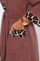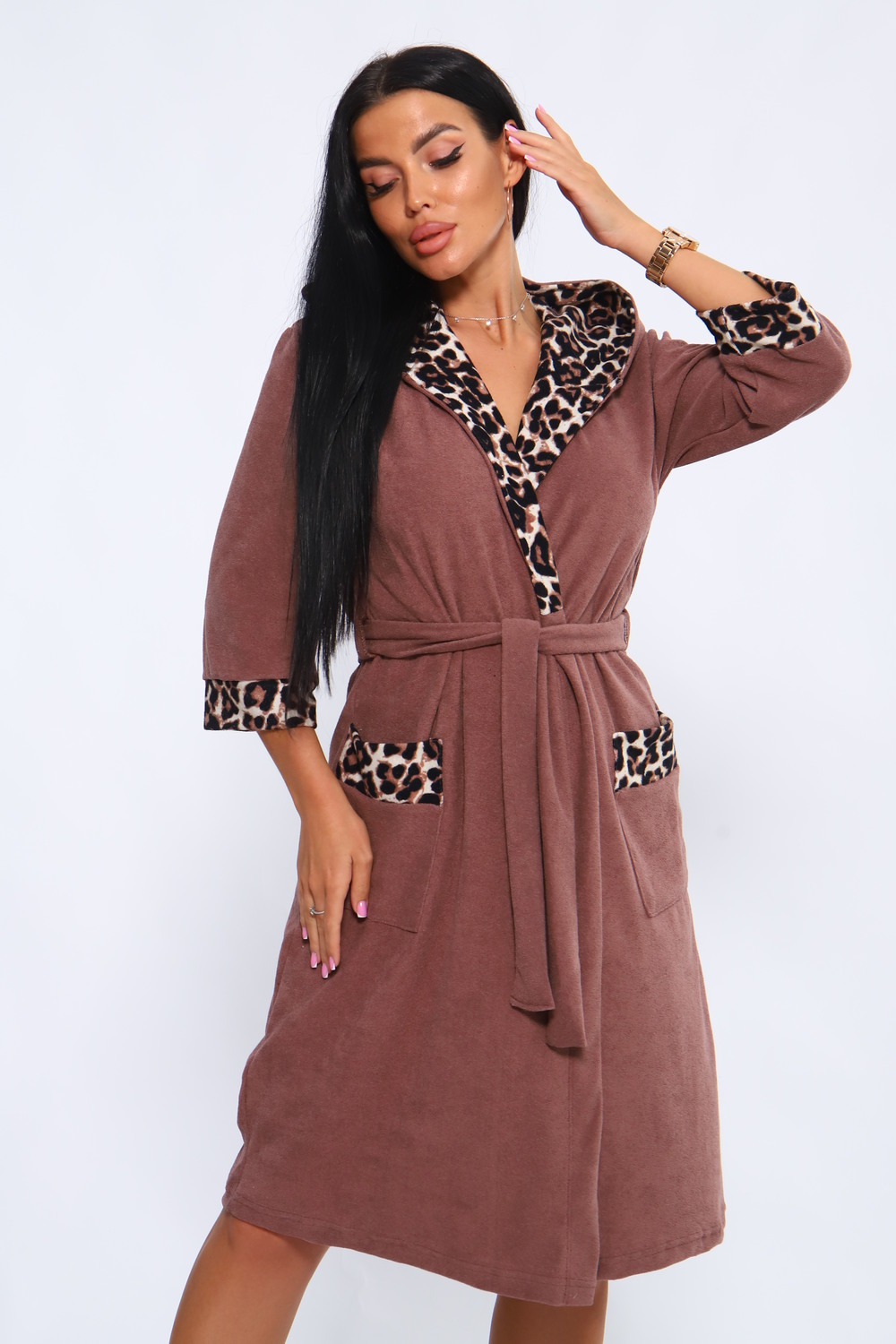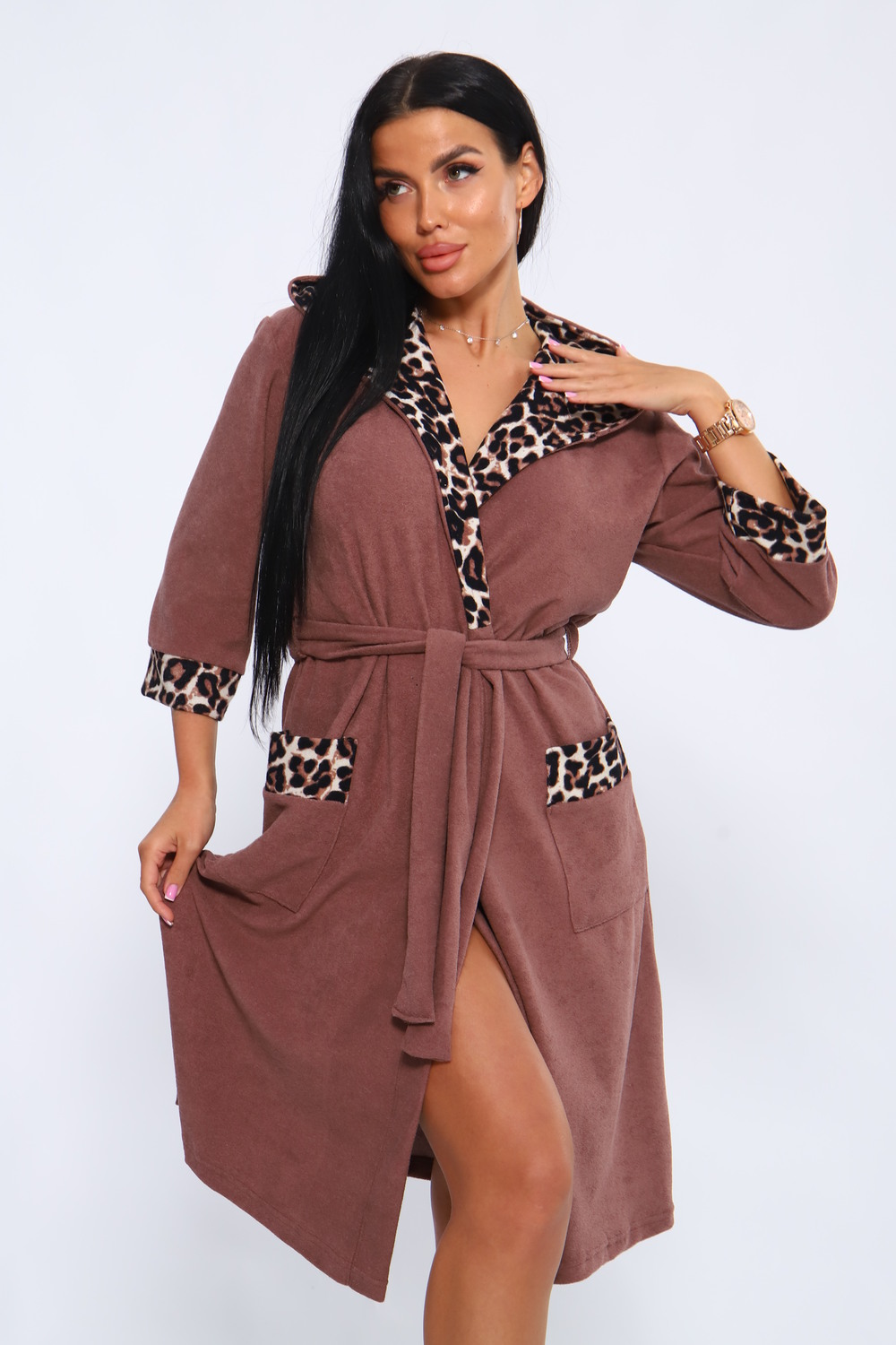 Халат женский из махры в приятном цвете. Халат с капюшоном и карманами. Халат на запах с поясом. Выполнен с тканью компаньон. Комфортный, средней длины.