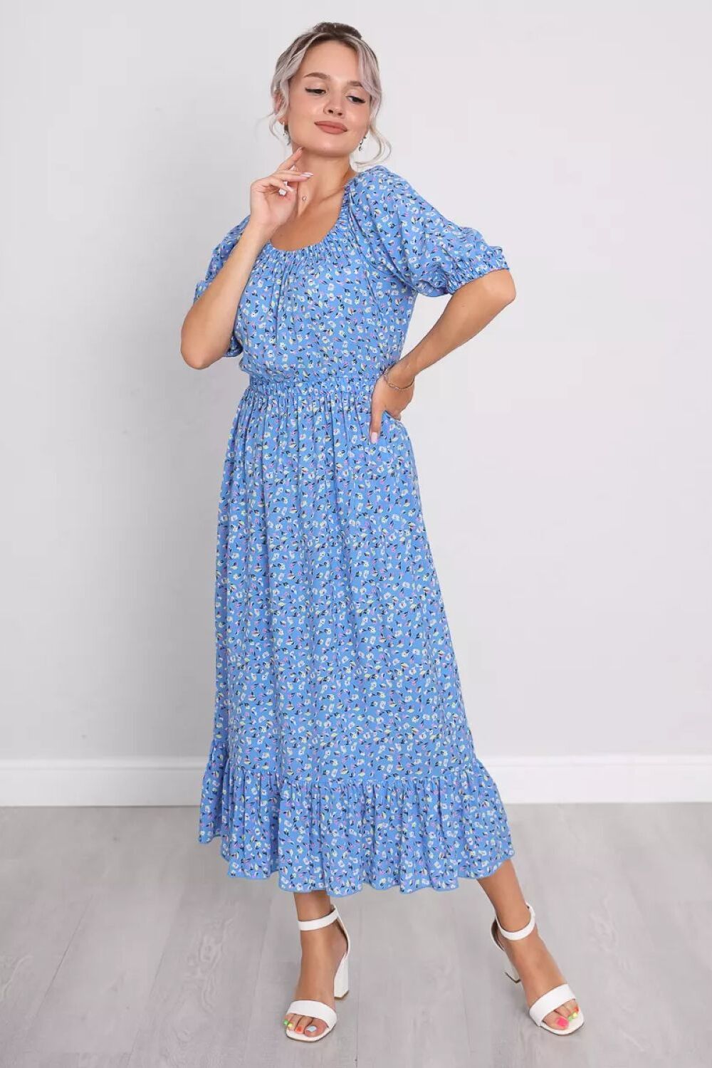 Откройте для себя идеальный вариант для отдыха и летних прогулок с нашим летним длинным платьем. Выполнено оно из ткани штапель, что обеспечит непревзойденный комфорт в жару, делая его идеальным выбором для теплого сезона. Отличительной чертой является резинка на поясе, которая подчеркивает талию, придавая фигуре изящный силуэт. Рукав короткий, внизу на резинке, добавляет практичности и удобства, а округлый вырез горловины подчеркивает изящество шеи и плеч. Низ подола украшен оборкой, что придает платью легкость и игривость. Сарафан представлен в больших размерах, он станет незаменимым элементом вашего летнего гардероба. Платье женское летнее длинное штапель - ваш выбор для создания неповторимого образа этим летом.