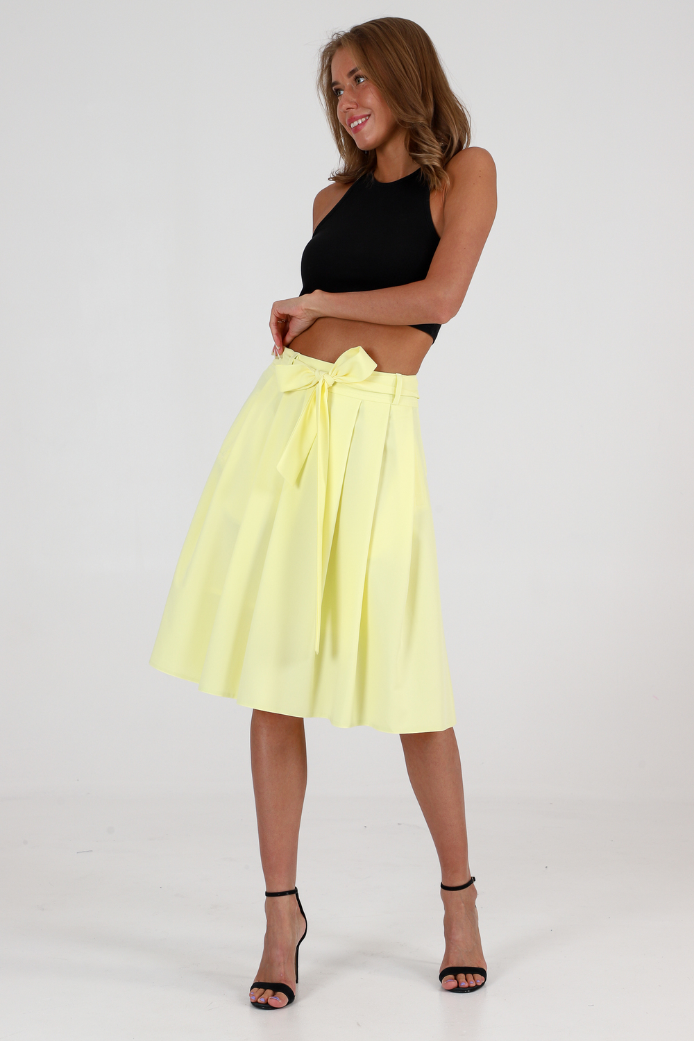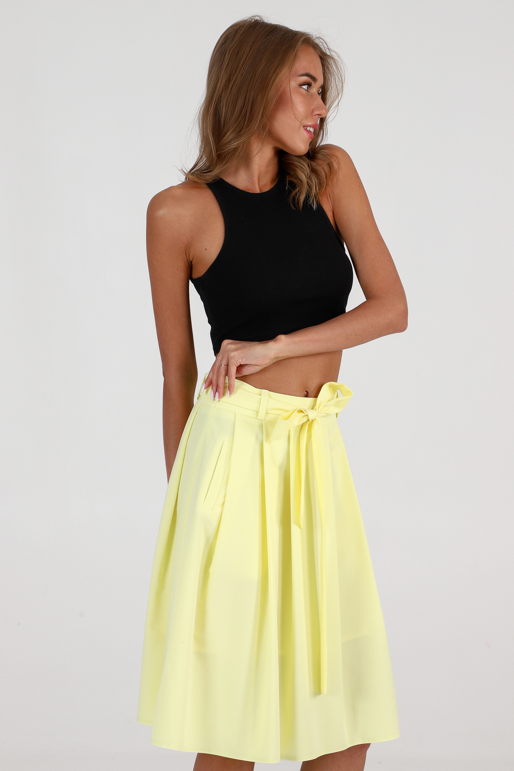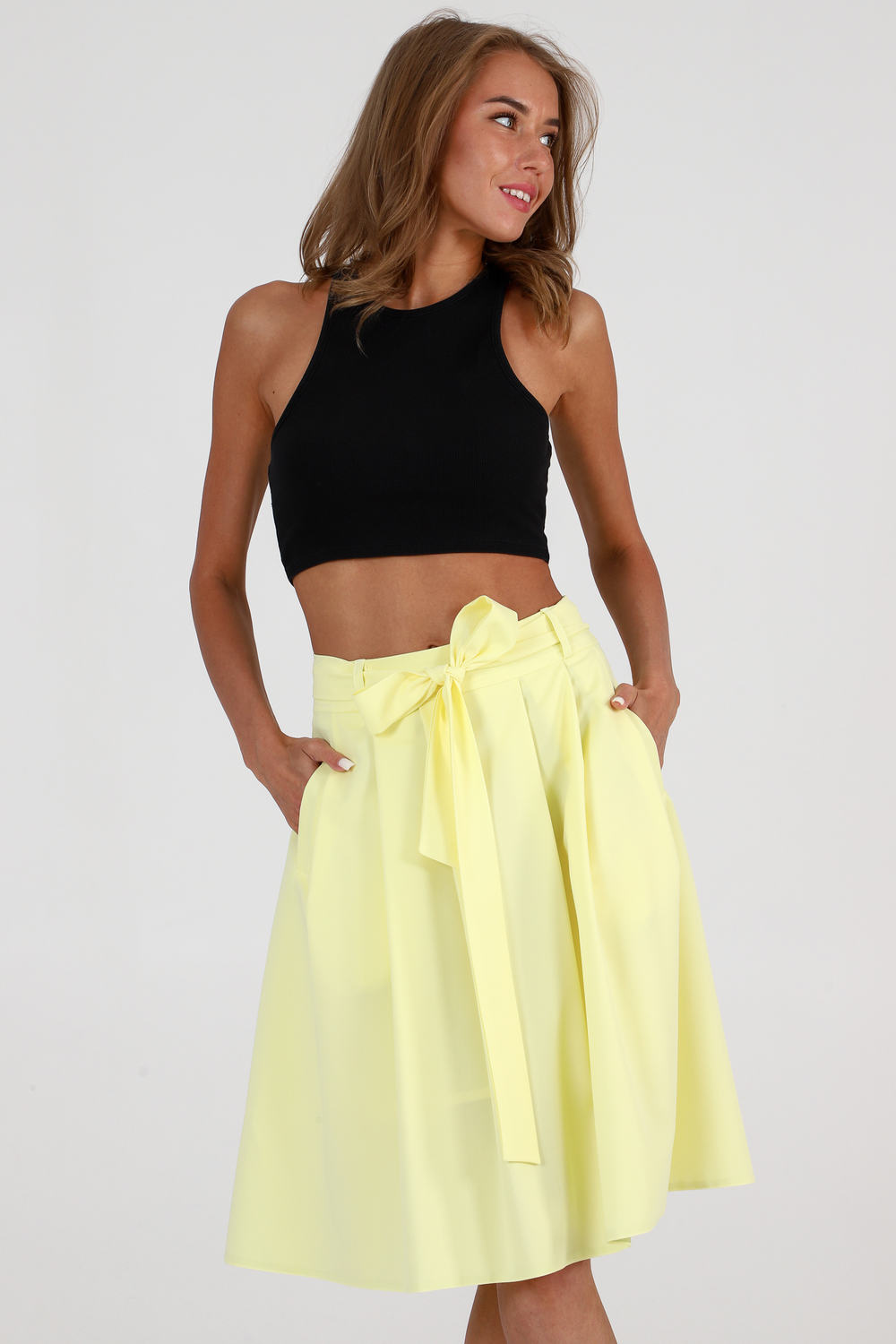 Романтичная юбка с односторонними складками, которые расходятся в разные стороны от середины юбки, не создавая лишний объем на бедрах. Для практичности по бокам выполнены карманы. В шлевки вдет пояс, который можно завязать на красивый бант.