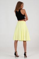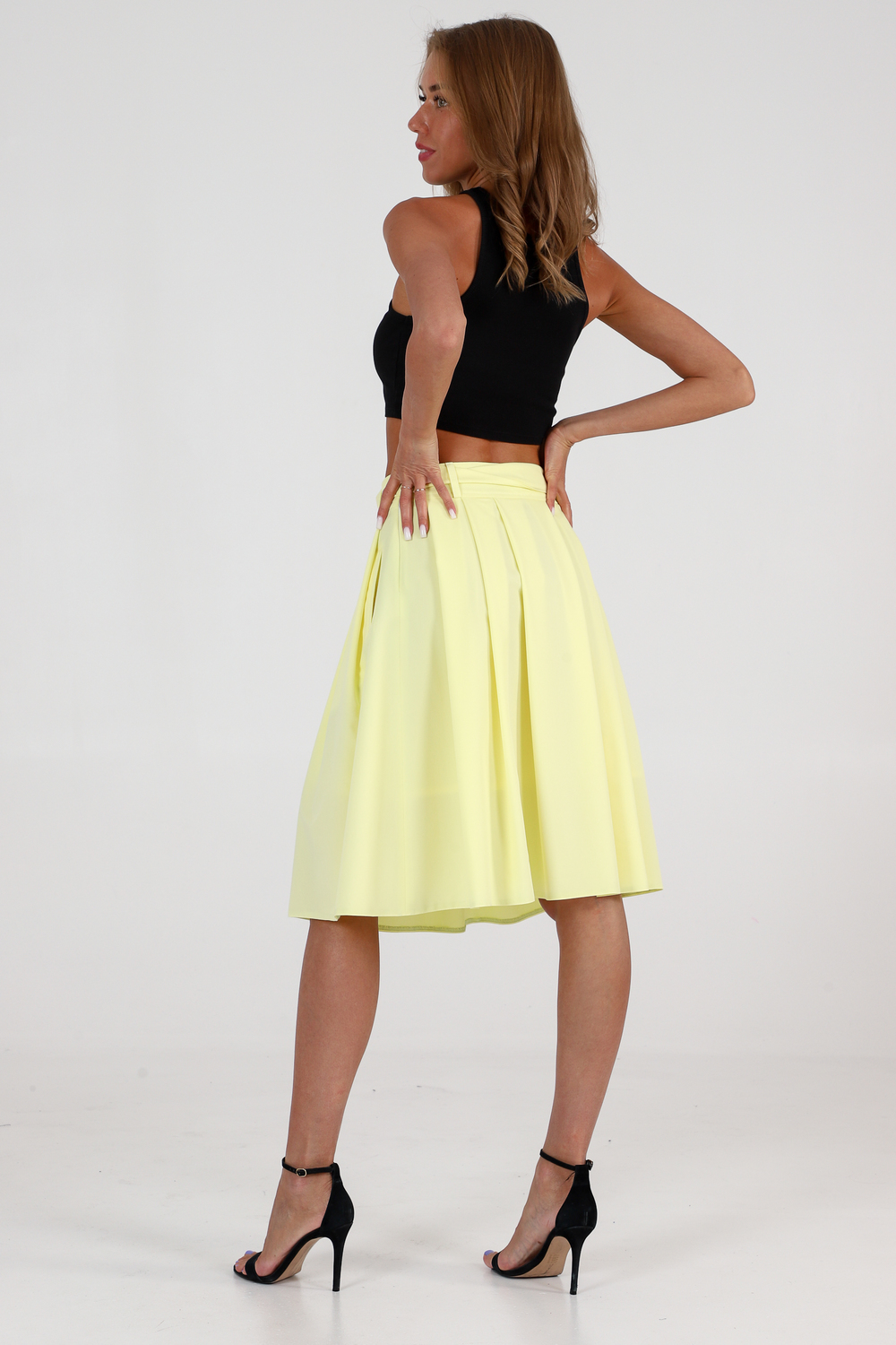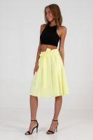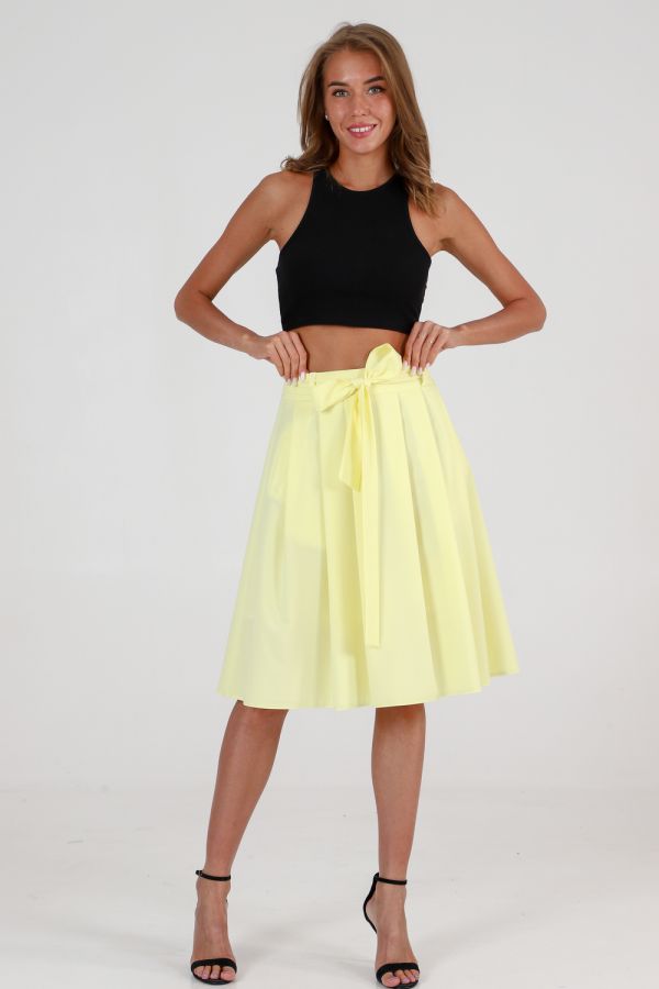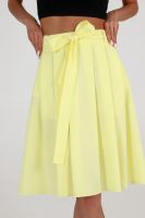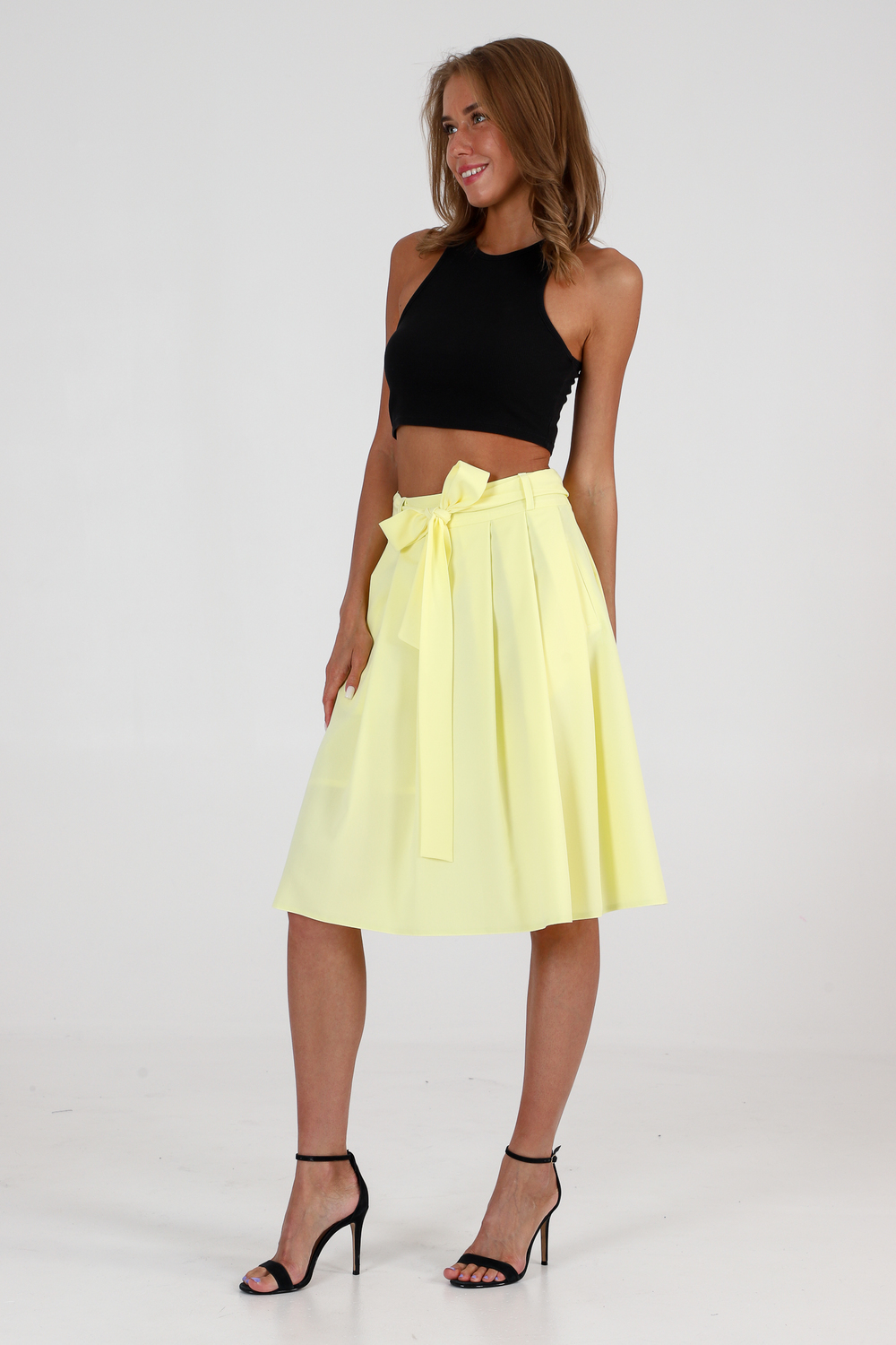 Романтичная юбка с односторонними складками, которые расходятся в разные стороны от середины юбки, не создавая лишний объем на бедрах. Для практичности по бокам выполнены карманы. В шлевки вдет пояс, который можно завязать на красивый бант.