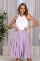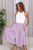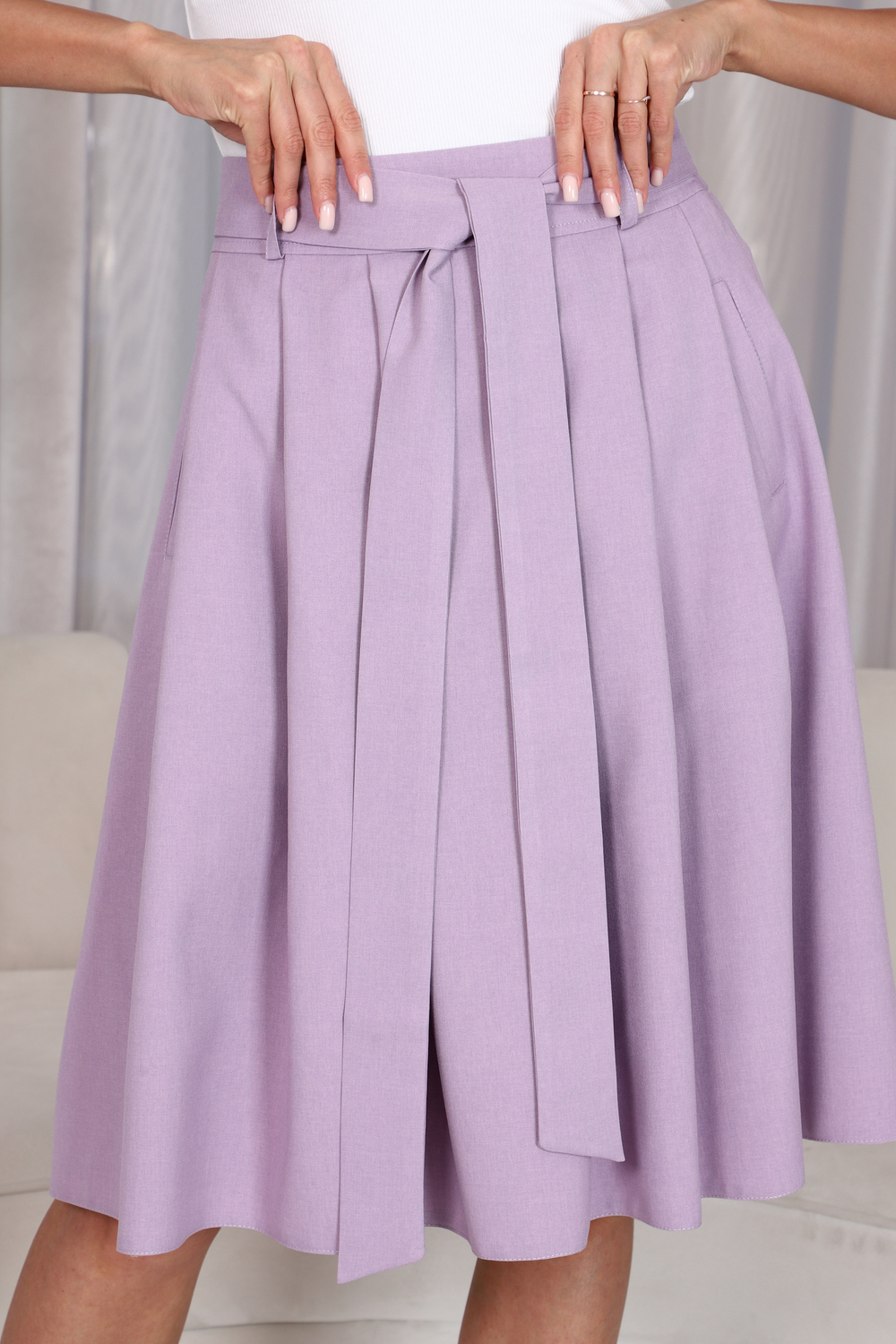 Романтичная юбка с односторонними складками, которые расходятся в разные стороны от середины юбки, не создавая лишний объем на бедрах. Для практичности по бокам выполнены карманы. В шлевки вдет пояс, который можно завязать на красивый бант.